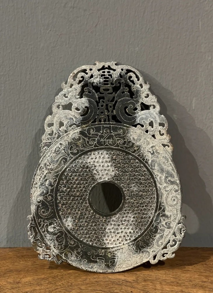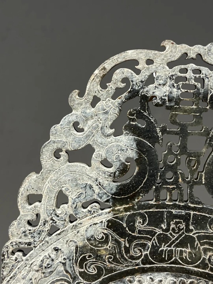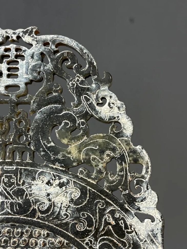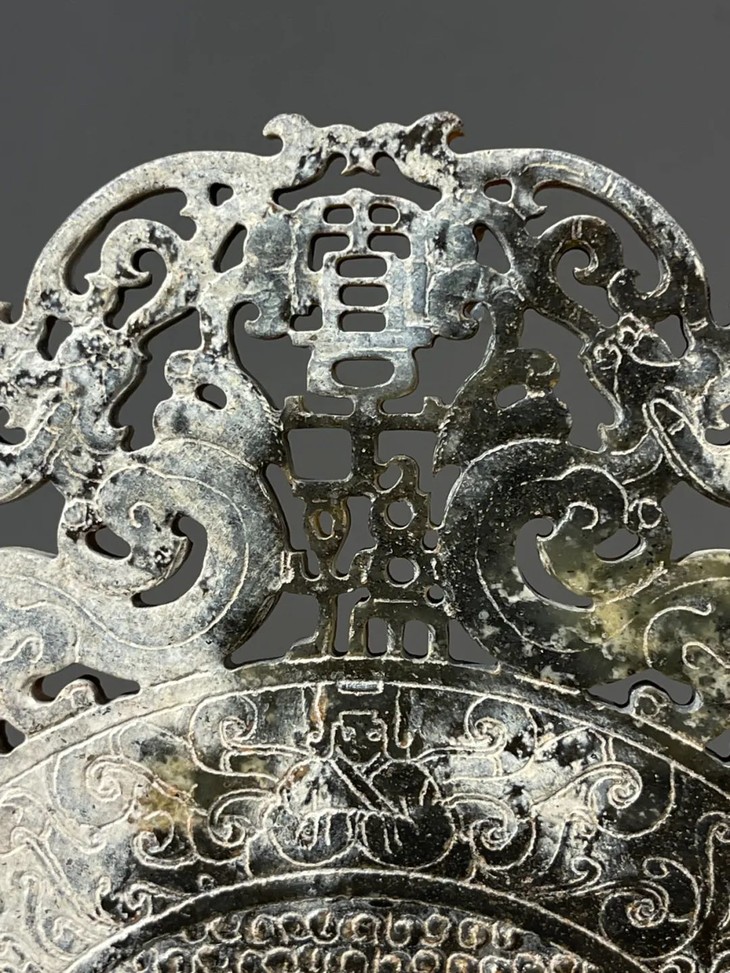 此黑沁白玉镂雕双龙出廓龙虎穀纹壁双面满工镂雕高古形式出廓玉璧,出廓双螭龙与镂雕文字典雅貴气,线条流畅精细、玉璧表面雕刻纹饰华丽精美,清晰细腻,琢磨细节丝丝入扣、非摄影能完整呈现。提油黑沁、包浆皮壳温润自然,是近代仿古代玉器的佳作。