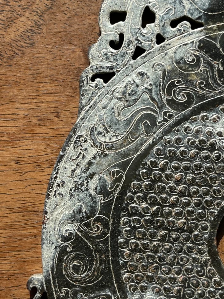 此黑沁白玉镂雕双龙出廓龙虎穀纹壁构图华丽、雕琢精美,近距离细品特别漂亮,令人印象深刻、爱不释手。入手后可继续珍藏品玩,材质仿古沁色自然流畅,造型与雕工清雅秀丽,是难得一见之仿高古玉器佳作。此黑沁白玉镂雕双龙出廓龙虎穀纹壁,除天然纹理裂痕与边沿细微磕碰外,保存完好无损。