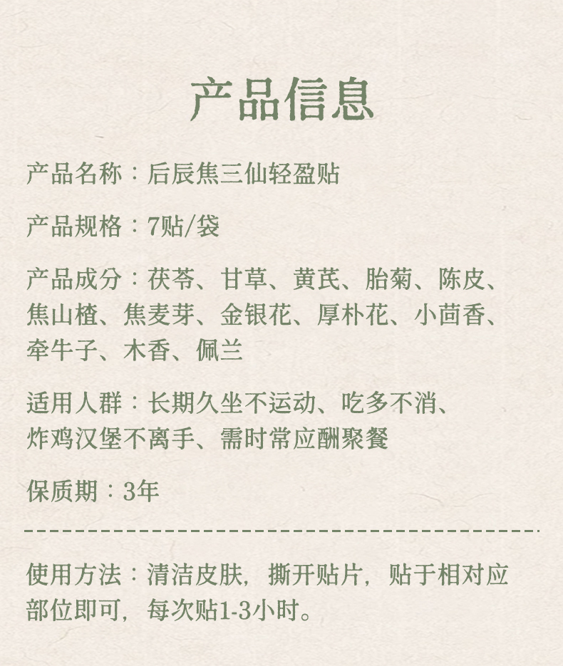 【品名】后辰 焦三仙轻盈贴/三通轻盈贴 7贴/袋 【规格】 焦三仙轻盈贴*3袋+鸸鹋霜小样*1袋 焦三仙轻盈贴*6袋+鸸鹋霜小样*3袋 焦三仙轻盈贴*9袋+鸸鹋霜小样*5袋 三通轻盈贴*3袋+鸸鹋霜小样*1袋 三通轻盈贴*6袋+鸸鹋霜小样*3袋 三通轻盈贴*9袋+鸸鹋霜小样*5袋 【产地】国内 【保质期】3年 【发货包装】独立包装 【发货地】河南 【发货快递】中通、圆通、申通随机发 【补邮费地区】新疆、西藏+20元 内蒙古、甘肃、青海、海南+10元 【发货时效】48-72小时,周末节假日顺延 |