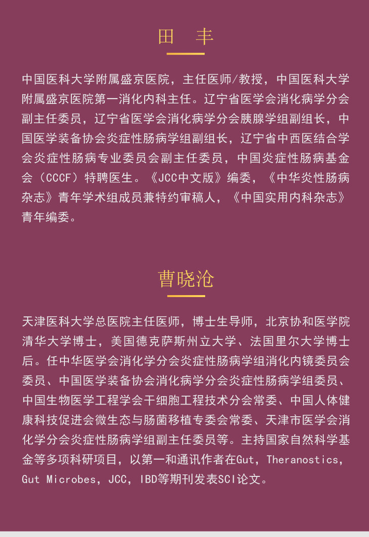 曹晓沧,天津医科大学总医院主任医师,博士生导师,北京协和医学院清华大学博士,美国德克萨斯州立大学、法国里尔大学博士后。任中华医学会消化学分会炎症性肠病学组消化内镜委员会委员、中国医学装备协会消化病学分会炎症性肠病学组委员、中国生物医学工程学会干细胞工程技术分会常委、中国人体健康科技促进会微生态与肠菌移植专委会常委、天津市医学会消化学分会炎症性肠病学组副主任委员等。主持国家自然科学基金等多项科研项目,以diyi和通讯作者在Gut,Theranostics,Gut Microbes,JCC,IBD等期刊发表SCI论文。