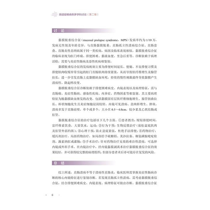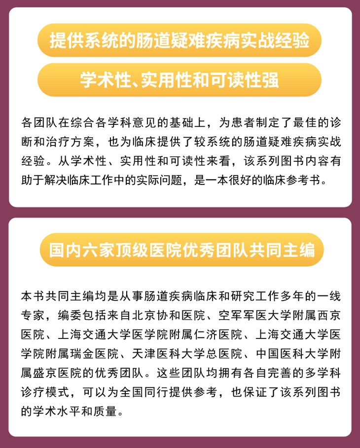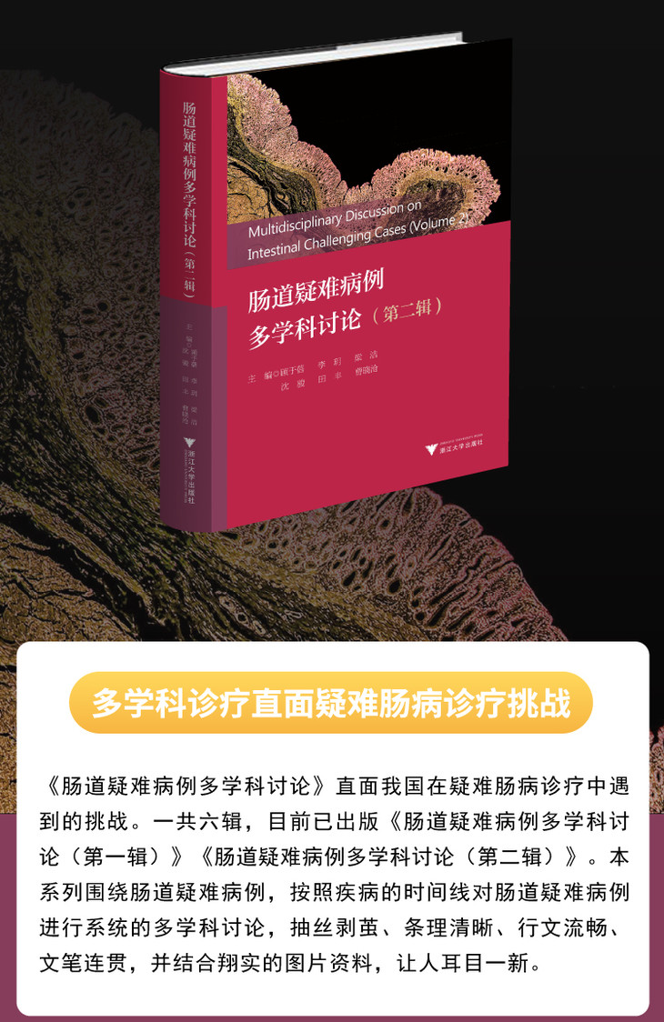 《肠道疑难病例多学科讨论》直面我国在疑难肠病诊疗中遇到的挑战。一共六辑,目前已出版《肠道疑难病例多学科讨论(第一辑)》《肠道疑难病例多学科讨论(第二辑)》。本系列围绕肠道疑难病例,按照疾病的时间线对肠道疑难病例进行系统的多学科讨论,抽丝剥茧、条理清晰、行文流畅、文笔连贯,并结合翔实的图片资料,让人耳目一新。各团队在综合各学科意见的基础上,为患者制定了最佳的诊断和治疗方案,也为临床提供了较系统的肠道疑难疾病实战经验。从学术性、实用性和可读性来看,该系列图书内容有助于解决临床工作中的实际问题,是一本很好的临床参考书。