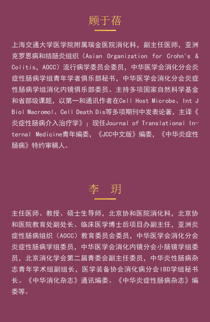 顾于蓓,上海交通大学医学院附属瑞金医院消化科,副主任医师,亚洲克罗恩病和结肠炎组织(Asian Organization for Crohn's & Colitis,AOCC)流行病学委员会委员,中华医学会消化分会炎症性肠病学组青年学者俱乐部秘书,中华医学会消化分会炎症性肠病学组消化内镜俱乐部委员。主持多项国家自然科学基金和省bu级课题,以diyi和通讯作者在Cell Host Microbe、Int J Biol Macromol、Cell Death Dis等多项期刊中发表论著,主译《炎症性肠病介入治疗学》;现任Journal of Translational Internal Medicine青年编委,《JCC中文版》编委,《中华炎症性肠病》特约审稿人。