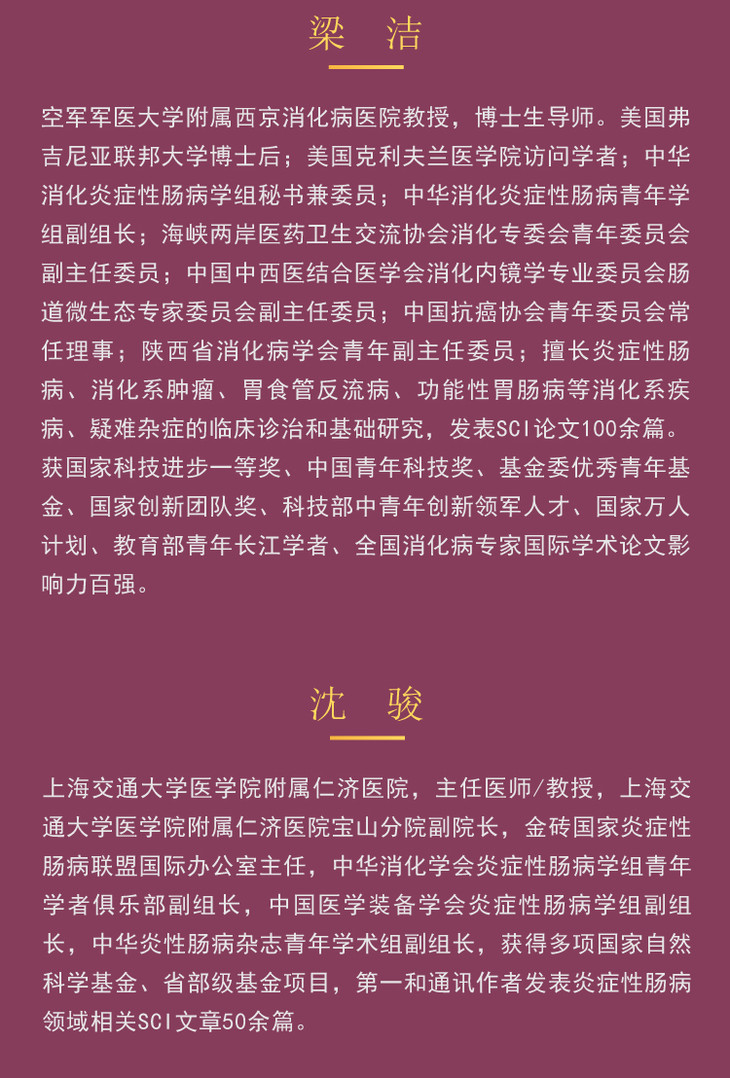 沈骏,上海交通大学医学院附属仁济医院,主任医师/教授,上海交通大学医学院附属仁济医院宝山分院副院长,金砖国家炎症性肠病联盟国际办公室主任,中华消化学会炎症性肠病学组青年学者俱乐部副组长,中国医学装备学会炎症性肠病学组副组长,中华炎性肠病杂志青年学术组副组长,获得多项国家自然科学基金、省bu级基金项目,diyi和通讯作者发表炎症性肠病领域相关SCI文章50余篇。
