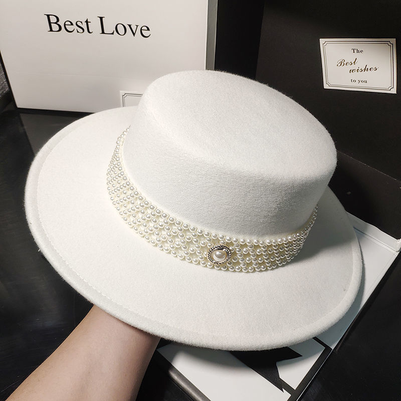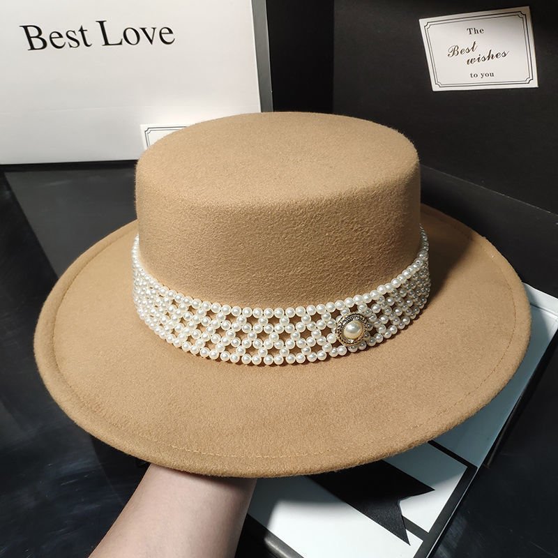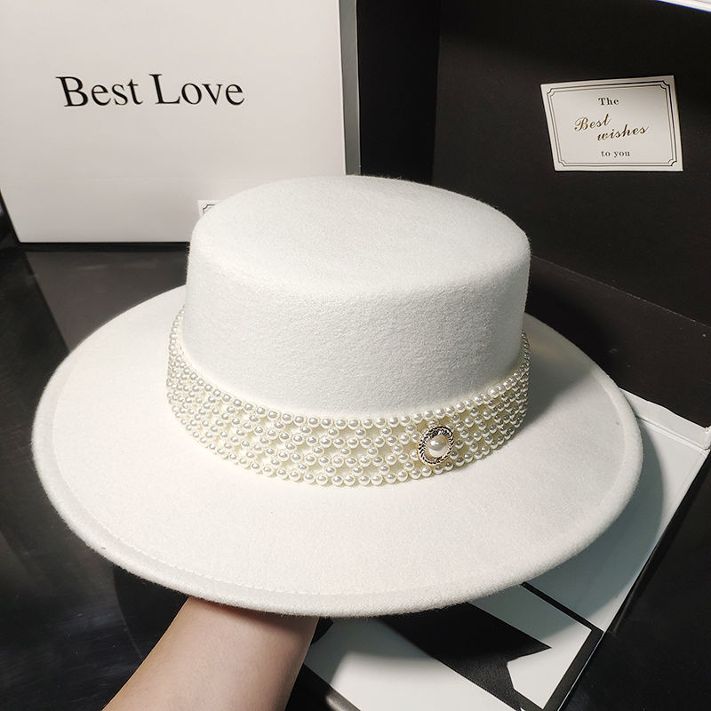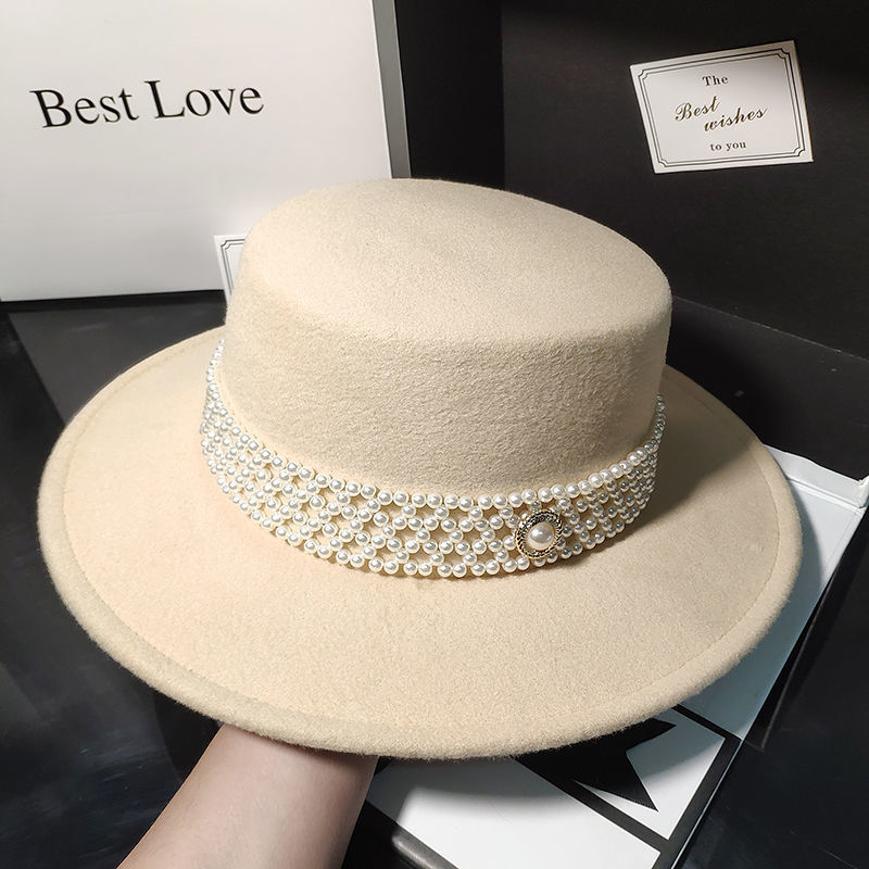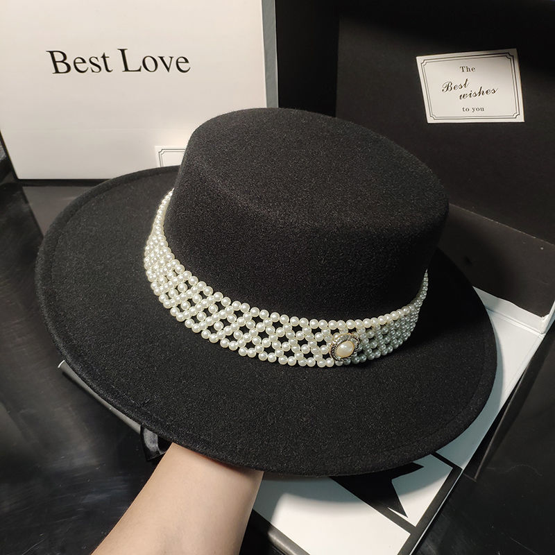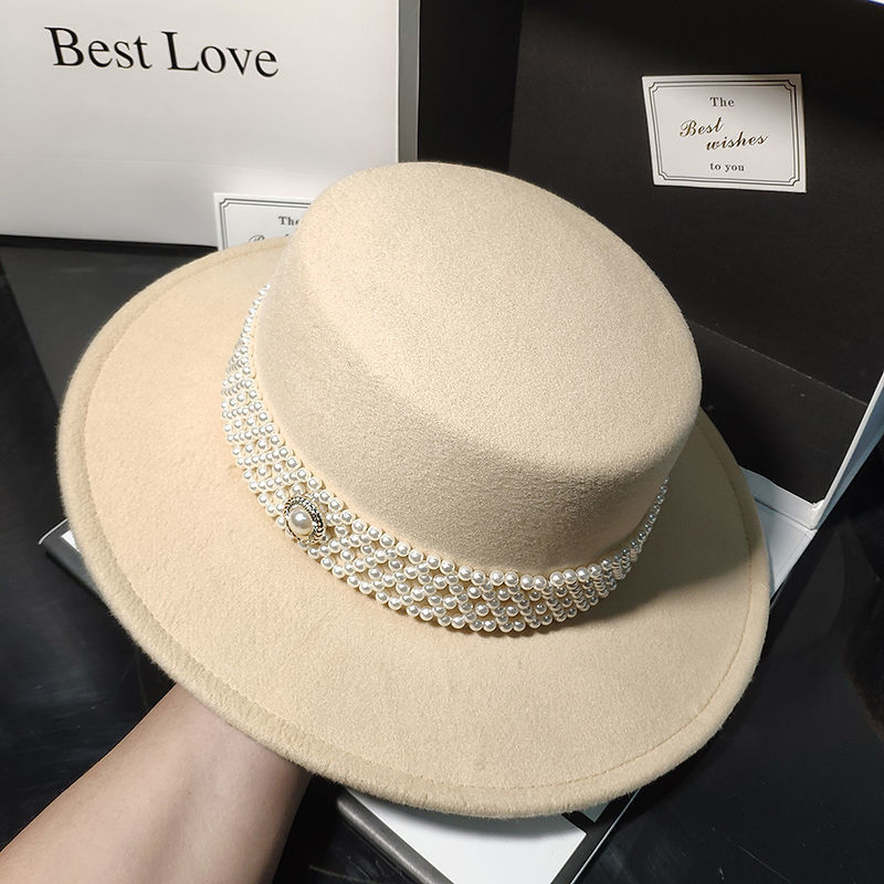 法式优雅平顶毛呢帽子女气质名媛仿羊毛礼帽秋冬英伦复古珍珠毡帽