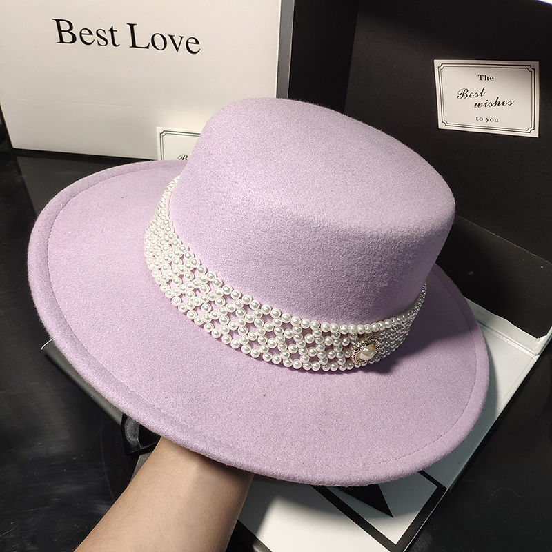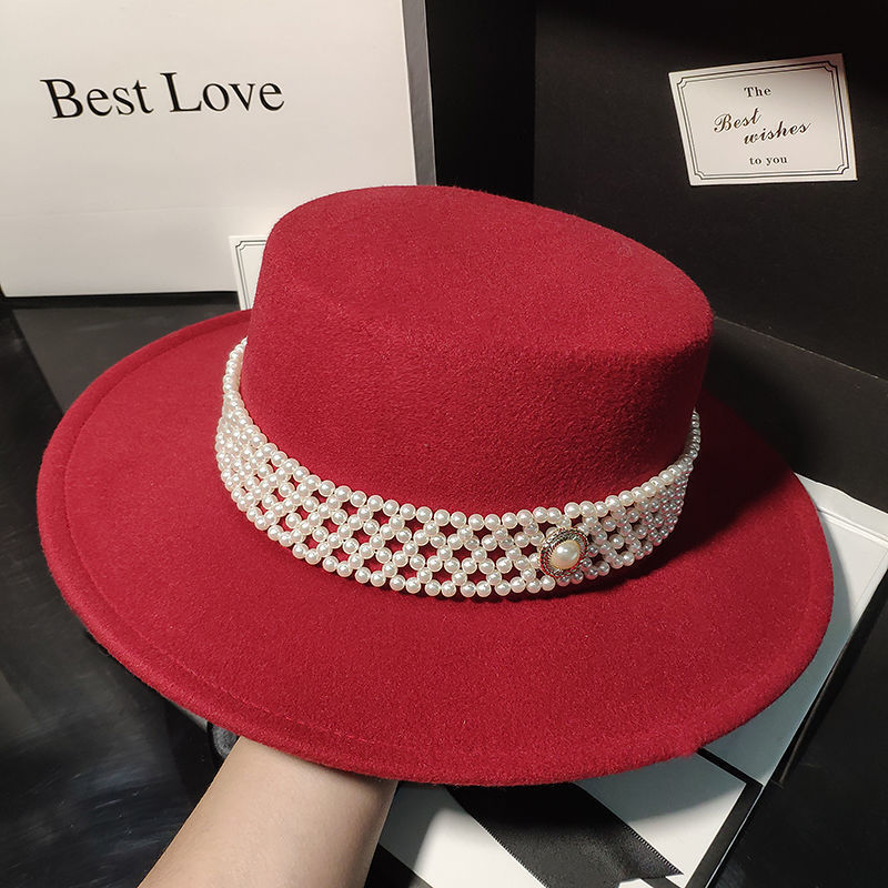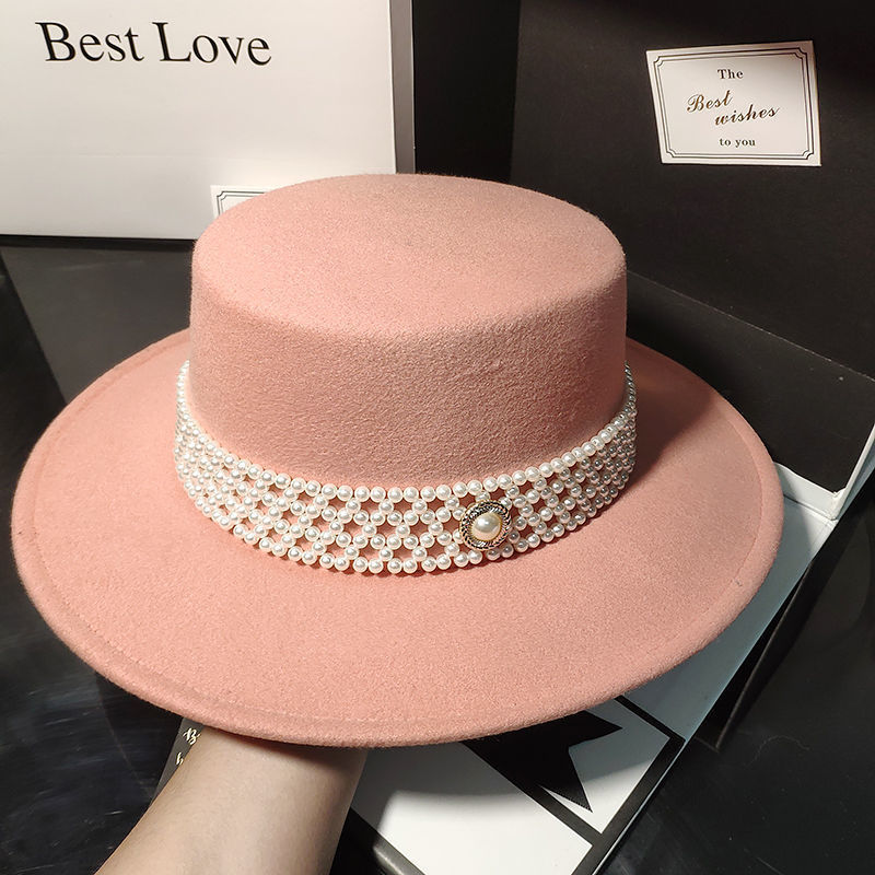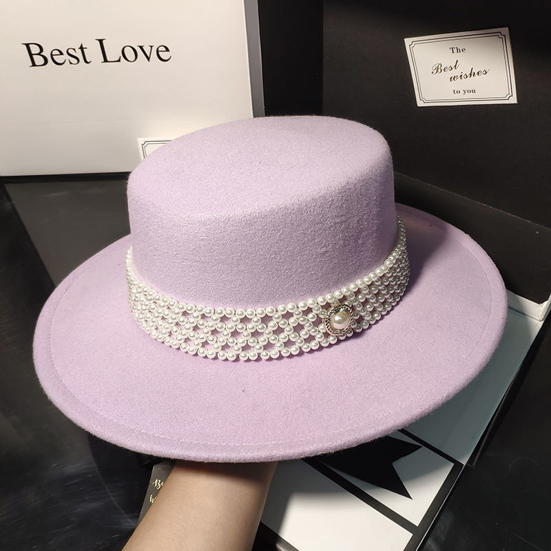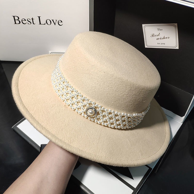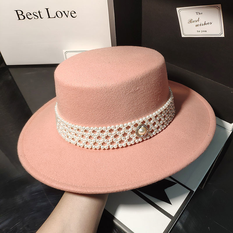 法式优雅平顶毛呢帽子女气质名媛仿羊毛礼帽秋冬英伦复古珍珠毡帽