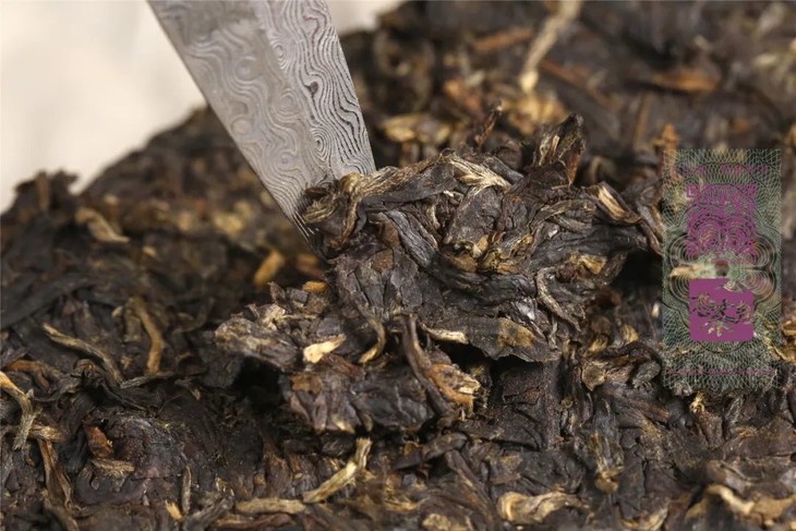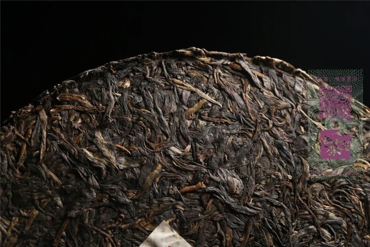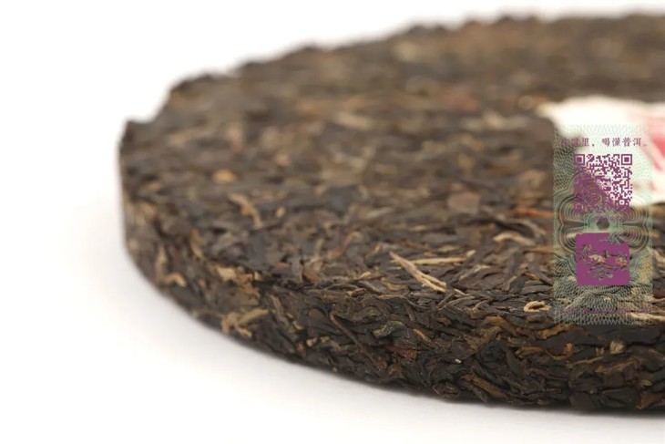 饼型端正,铁饼压制较紧,条索紧结肥壮清晰,色泽乌褐油润,多芽头,转化均匀。