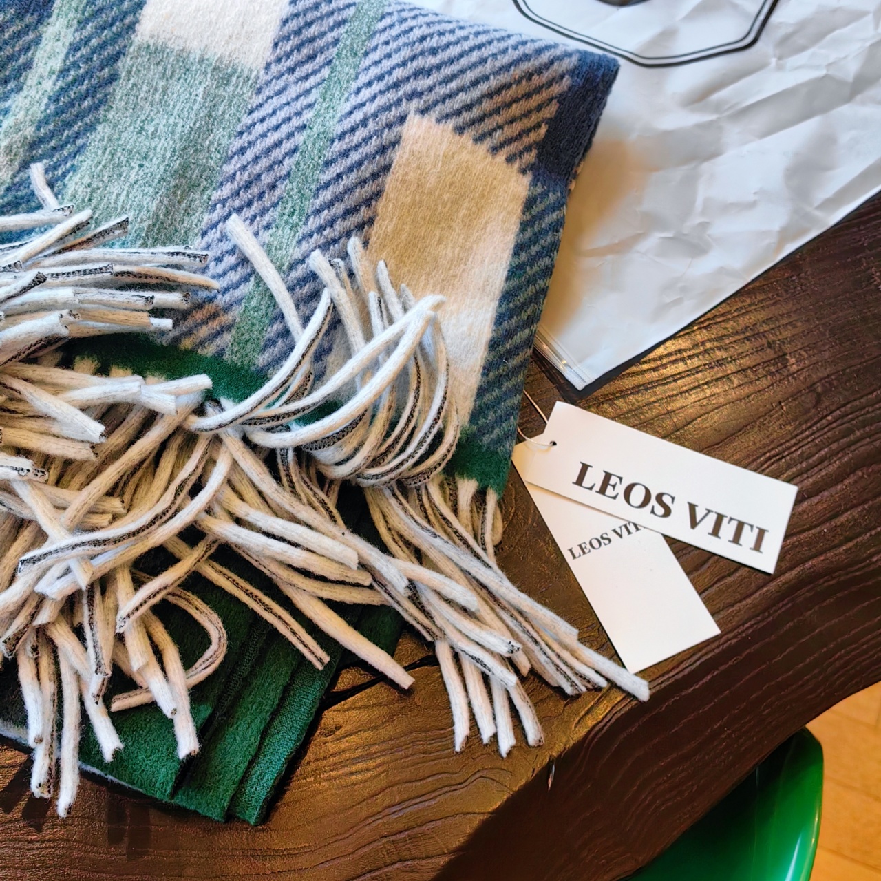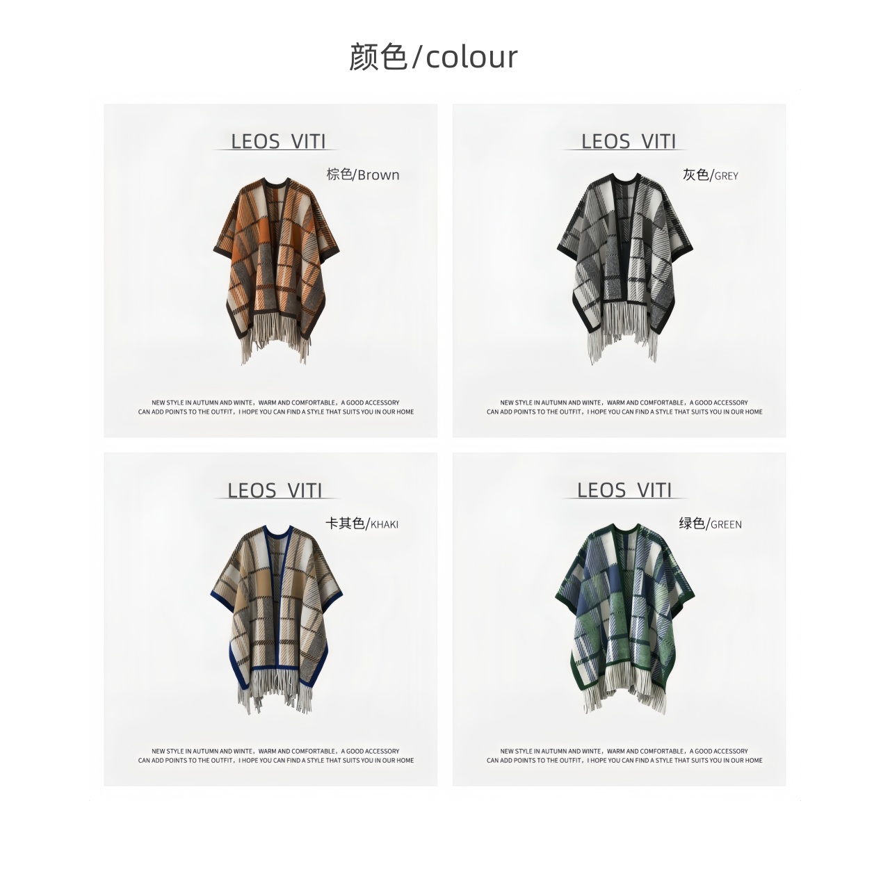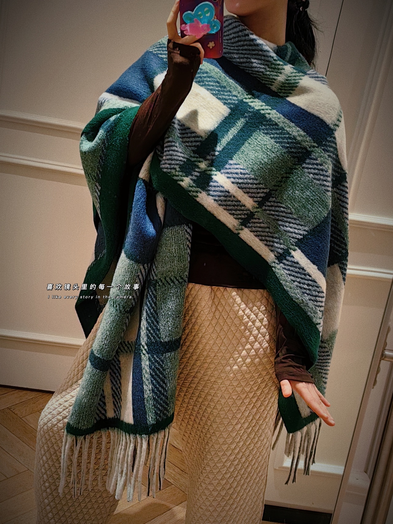 披肩有黑灰色、卡其色、棕色以及绿色。黑灰色经典耐看,复古风情也不会过时;卡其色同样韵味十足,低调奢华;棕色是慵懒的美拉德色系,简约而不失沉稳。我自留的是绿色,跟家里的装修比较搭,绿白相间的格子也是蛮俏皮的!