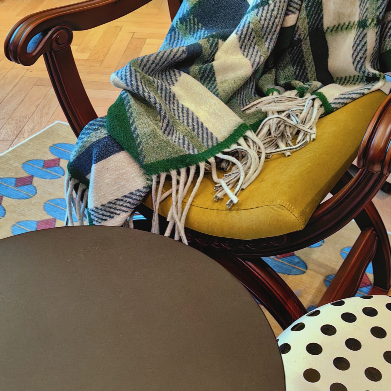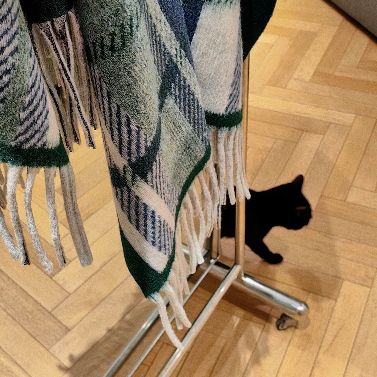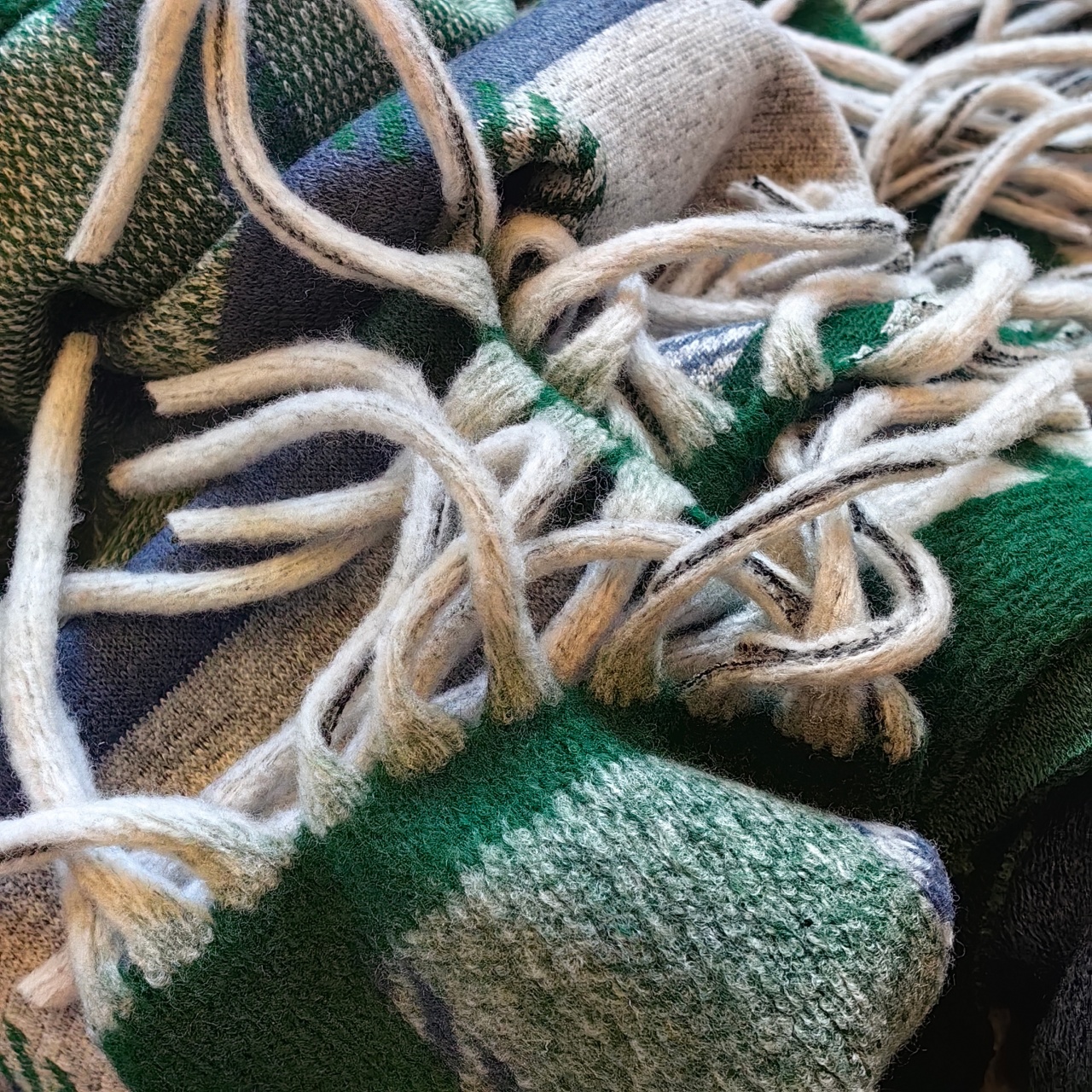 披肩有黑灰色、卡其色、棕色以及绿色。黑灰色经典耐看,复古风情也不会过时;卡其色同样韵味十足,低调奢华;棕色是慵懒的美拉德色系,简约而不失沉稳。我自留的是绿色,跟家里的装修比较搭,绿白相间的格子也是蛮俏皮的!