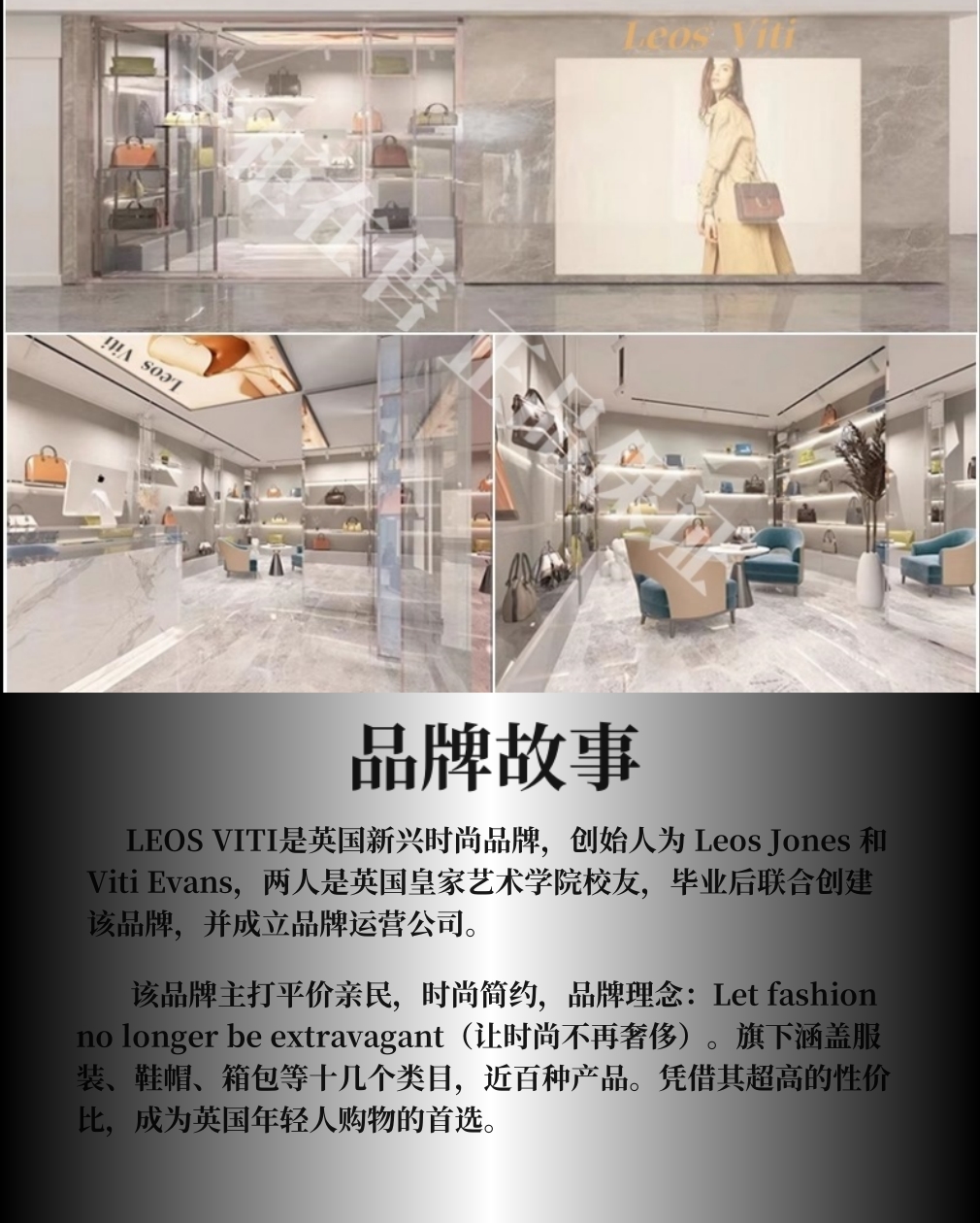 LEOS VITI是英国新兴时尚品牌,创始人为 Leos Jones 和Viti Evans, 两人是英国皇家艺术学院校友,毕业后联合创建该品牌,并成立品牌运营公司。该品牌主打平价亲民,时尚简约,品牌理念:Let fashionno longer be extravagant (让时尚不再奢侈)。旗下涵盖服裝、鞋帽、箱包等十几个类目,近百种产品,凭借其超高的性价比,深受英国年轻人喜爱。
