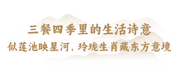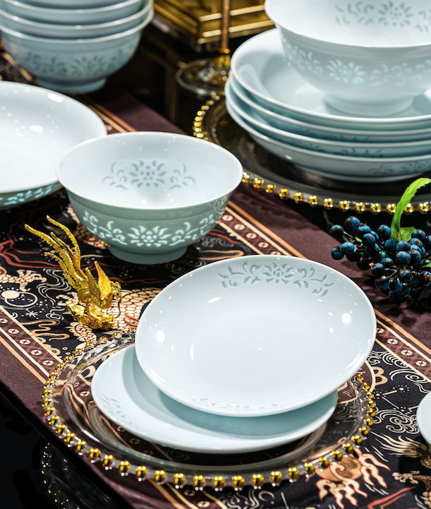 以玲珑釉工艺雕刻的缠枝莲纹,连绵缠绕在菜碟、饭碗上,象征着生命的循环与福泽延绵,每吃一顿饭都寄托着对吉祥永恒、生生不息的祈愿。