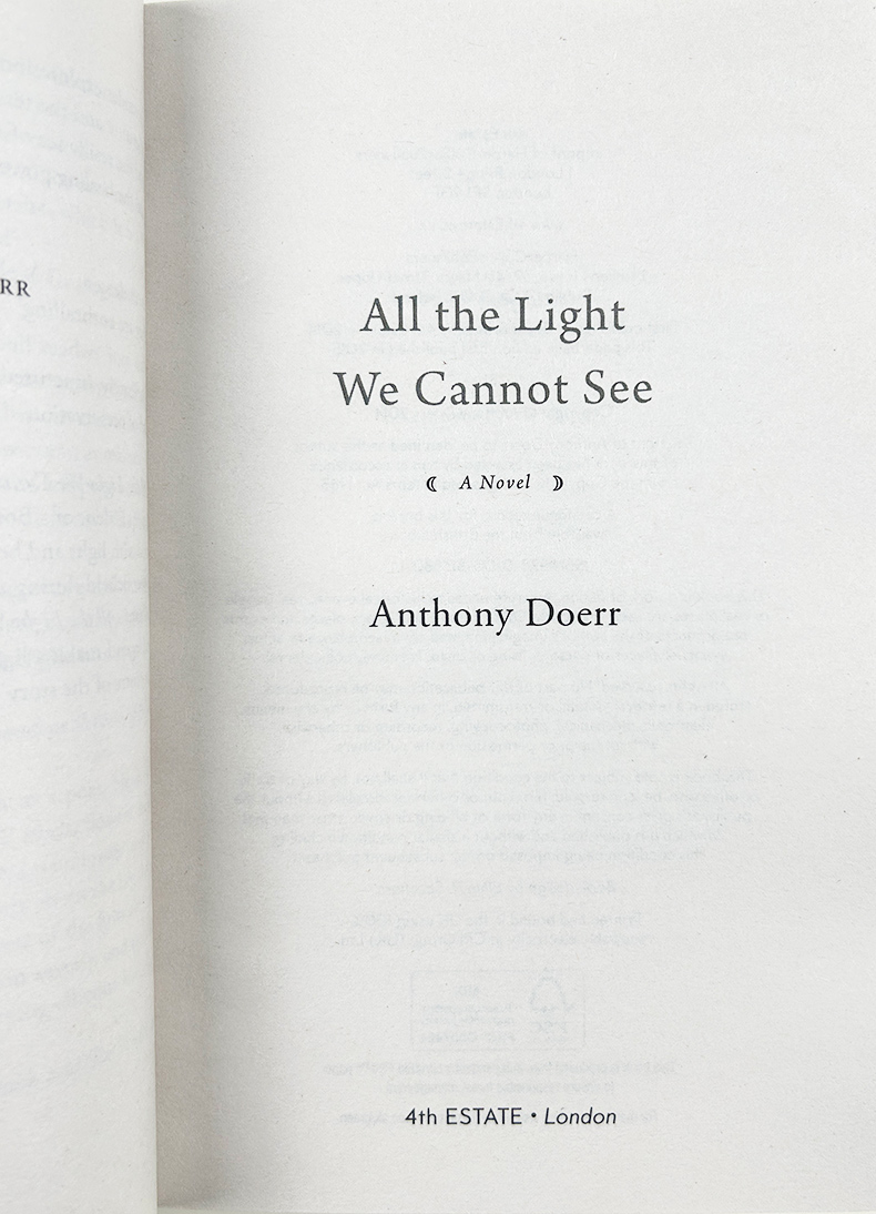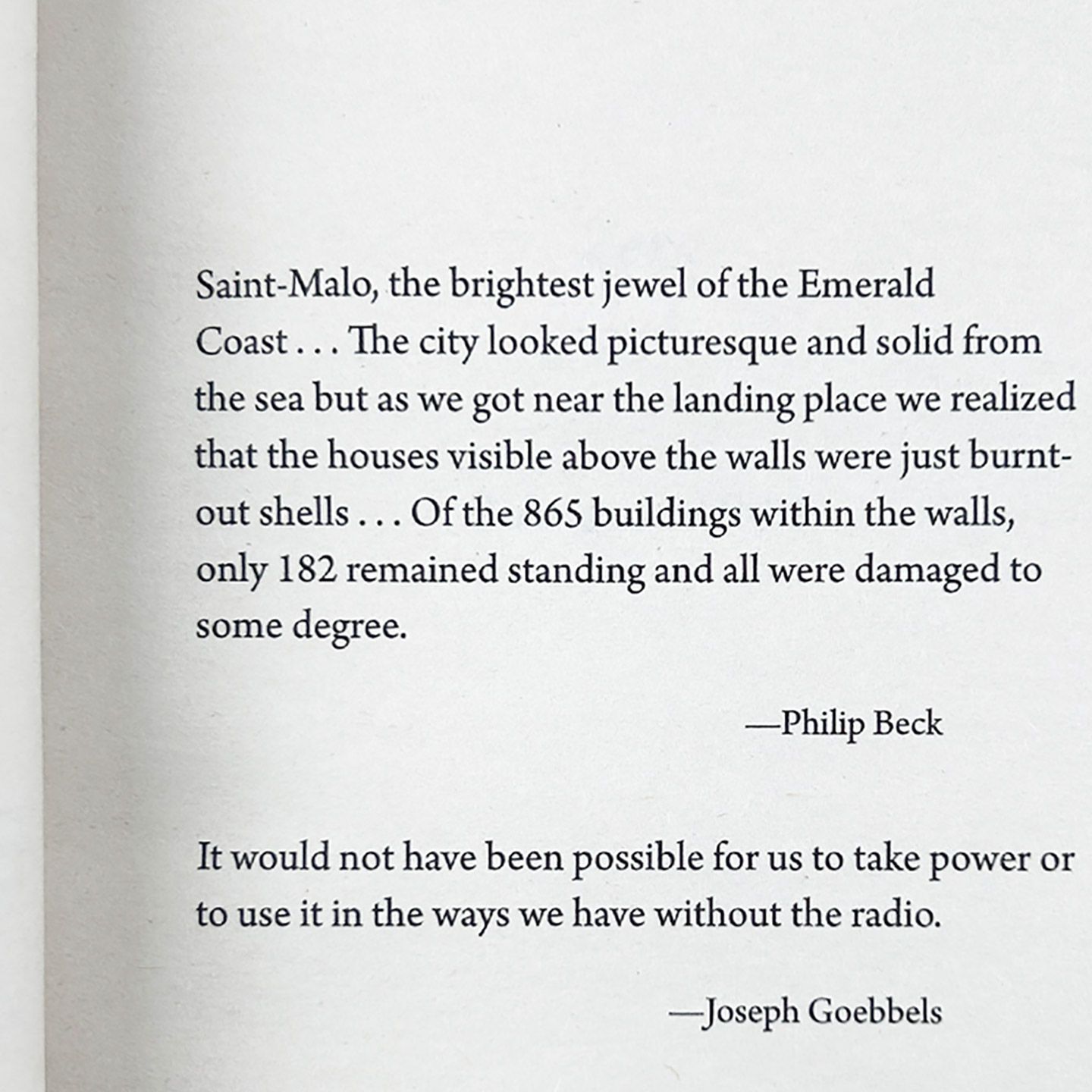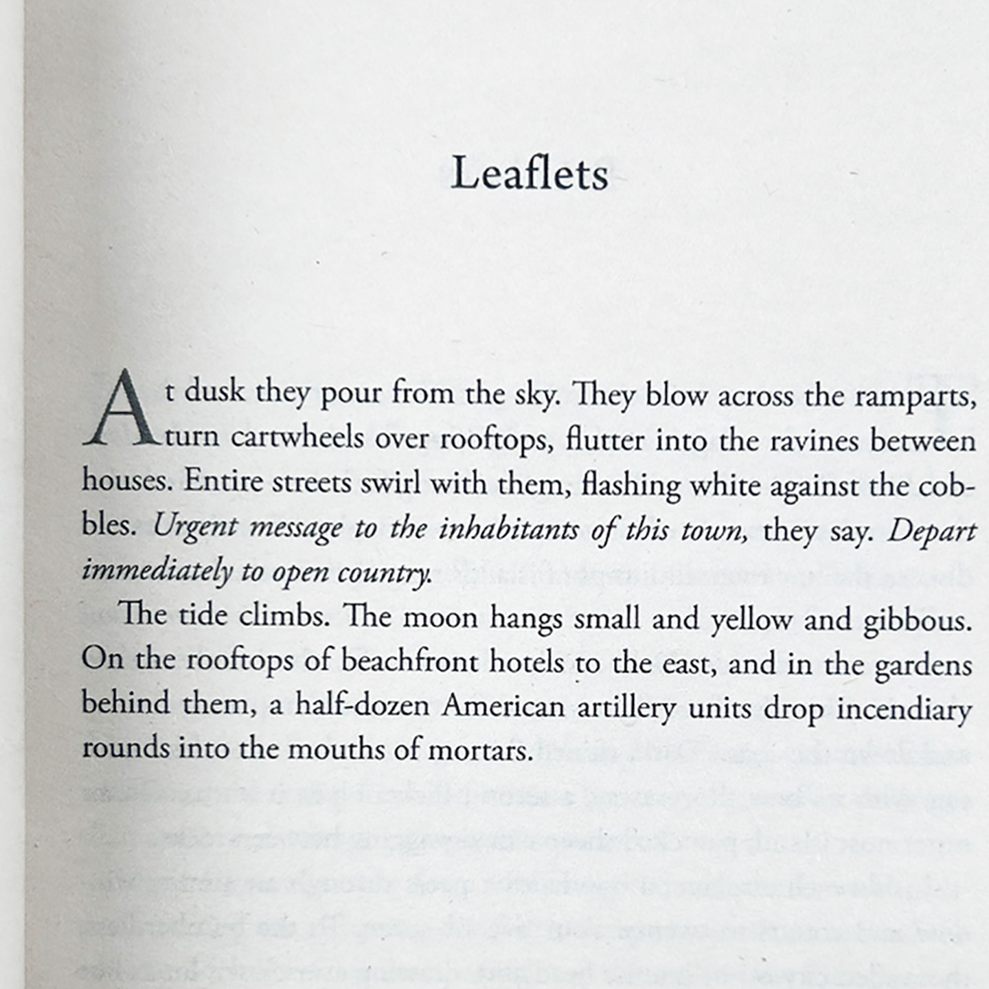 Zero7 August 1944LeafletsAt dusk they pour from the sky. They blow across the ramparts, turn cartwheels over rooftops, flutter into the ravines between houses. Entire streets swirl with them, flashing white against the cobbles. Urgent message to the inhabitants of this town, they say. Depart immediately to open country. The tide climbs. The moon hangs small and yellow and gibbous. On the rooftops of beachfront hotels to the east, and in the gardens behind them, a half-dozen American artillery units drop incendiary rounds into the mouths of mortars. BombersThey cross the Channel at midnight. There are twelve and they are named for songs: Stardust and Stormy Weather and In the Mood and Pistol-Packin’ Mama. The sea glides along far below, spattered with the countless chevrons of whitecaps. Soon enough, the navigators can discern the low moonlit lumps of islands ranged along the horizon. France. Intercoms crackle. Deliberately, almost lazily, the bombers shed altitude. Threads of red light ascend from anti-air emplacements up and down the coast. Dark, ruined ships appear, scuttled or destroyed, one with its bow shorn away, a second flickering as it burns. On an outermost island, panicked sheep run zigzagging between rocks. Inside each airplane, a bombardier peers through an aiming window and counts to twenty. Four five six seven. To the bombardiers, the walled city on its granite headland, drawing ever closer, looks like an unholy tooth, something black and dangerous, a final abscess to be lanced away. The GirlIn a corner of the city, inside a tall, narrow house at Number 4 rue Vauborel, on the sixth and highest floor, a sightless sixteen-year-old named Marie-Laure LeBlanc kneels over a low table covered entirely with a model. The model is a miniature of the city she kneels within, and contains scale replicas of the hundreds of houses and shops and hotels within its walls. There’s the cathedral with its perforated spire, and the bulky old Château de Saint-Malo, and row after row of seaside mansions studded with chimneys. A slender wooden jetty arcs out from a beach called the Plage du Môle; a delicate, reticulated atrium vaults over the seafood market; minute benches, the smallest no larger than apple seeds, dot the tiny public squares. Marie-Laure runs her fingertips along the centimeter-wide parapet crowning the ramparts, drawing an uneven star shape around the entire model. She finds the opening atop the walls where four ceremonial cannons point to sea. “Bastion de la Hollande,” she whispers, and her fingers walk down a little staircase. “Rue des Cordiers. Rue Jacques Cartier.” In a corner of the room stand two galvanized buckets filled to the rim with water. Fill them up, her great-uncle has taught her, whenever you can. The bathtub on the third floor too. Who knows when the water will go out again. Her fingers travel back to the cathedral spire. South to the Gate of Dinan. All evening she has been marching her fingers around the model, waiting for her great-uncle Etienne, who owns this house, who went out the previous night while she slept, and who has not returned. And now it is night again, another revolution of the clock, and the whole block is quiet, and she cannot sleep. She can hear the bombers when they are three miles away. A mounting static. The hum inside a seashell. When she opens the bedroom window, the noise of the airplanes becomes louder. Otherwise, the night is dreadfully silent: no engines, no voices, no clatter. No sirens. No footfalls on the cobbles. Not even gulls. Just a high tide, one block away and six stories below, lapping at the base of the city walls. And something else.