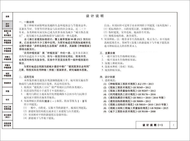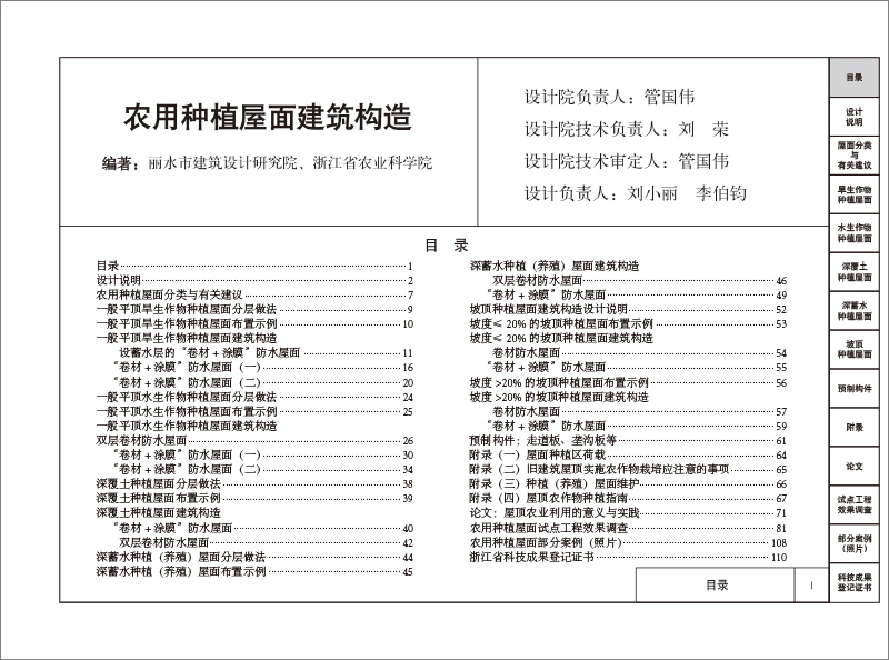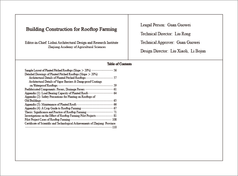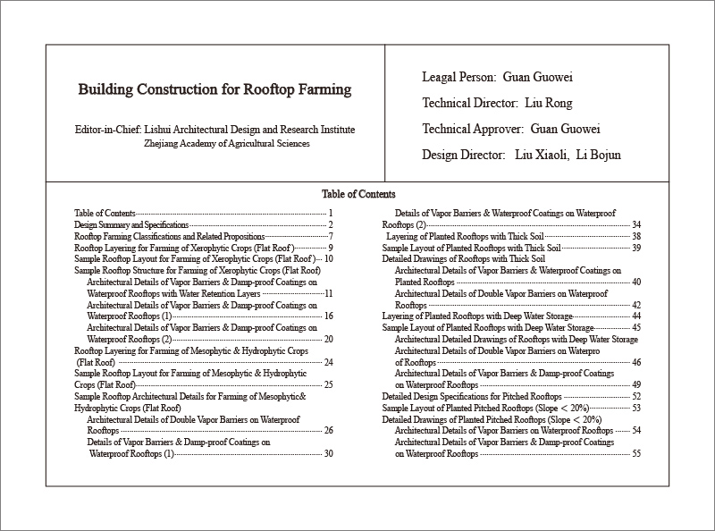 当前,屋顶农业还是一个新生事物,处于起步阶段,屋顶农业的实施与管理要求均高于一般意义的屋顶绿化。因此,不能简单套用一般屋顶绿化的建筑标准。为了安全、稳妥、低投入、有效地推广屋顶农业,在浙江省农业科学院与丽水市建筑设计研究院长期合作研究及众多屋顶农业成功实践的案例基础上,特编纂出版《农用种植屋面建筑构造》图集,供相关建筑设计、施工单位以及业主借鉴和选用。