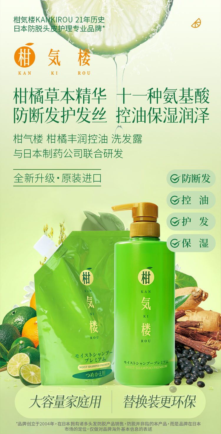 挑战3天不洗头 · 日本进口KANKIROU柑气楼 柑橘滋养浓缩无硅油洗发露 洗发水600g+补充装500g|品牌直发