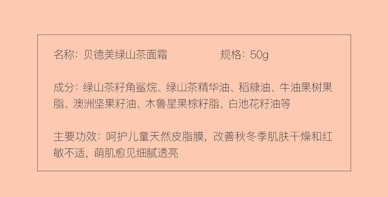 9楼母婴生活馆 贝德美儿童绿山茶面霜保湿滋润舒缓婴幼儿面霜50g 吊牌价:79元 活动价:69元