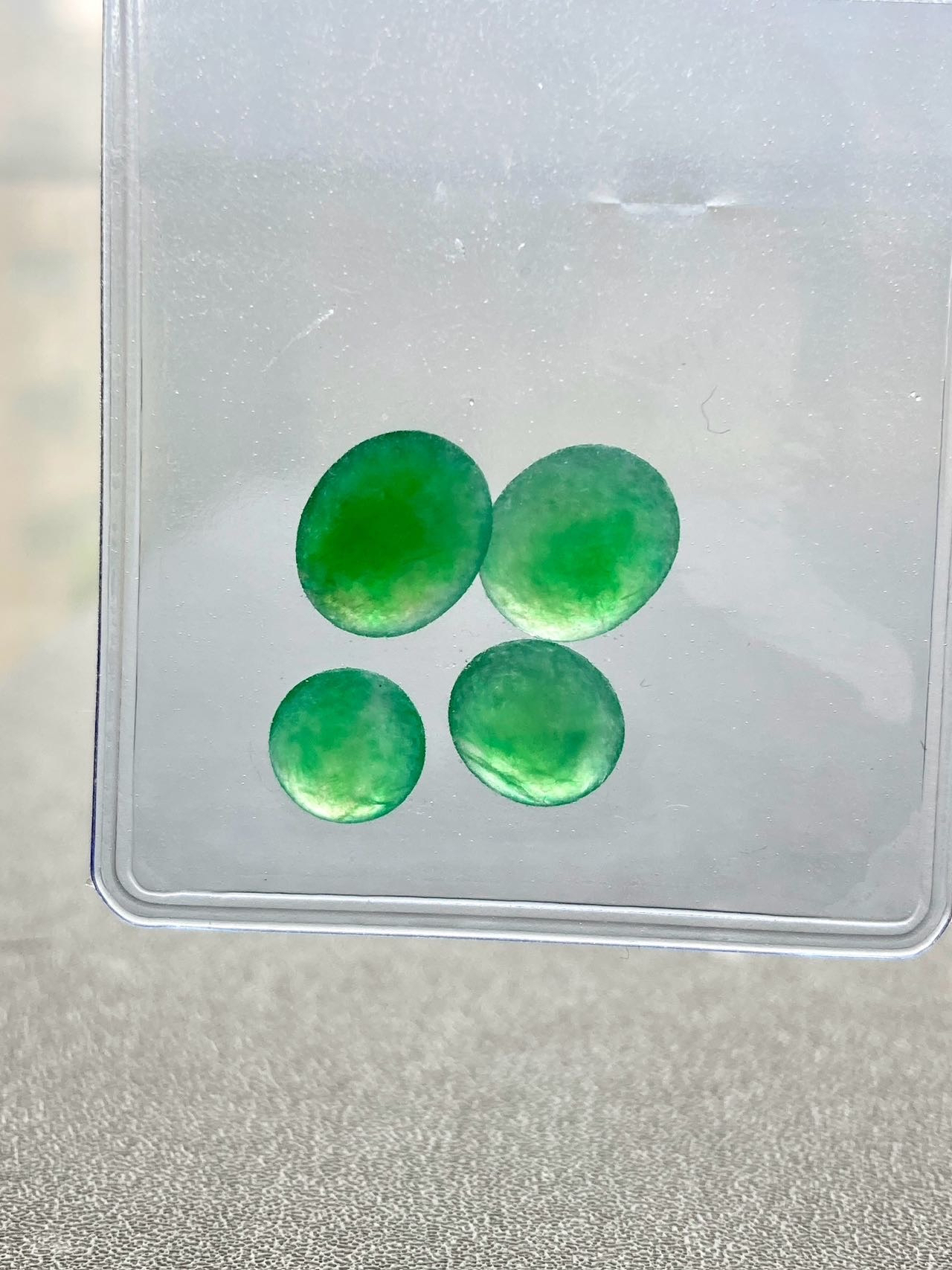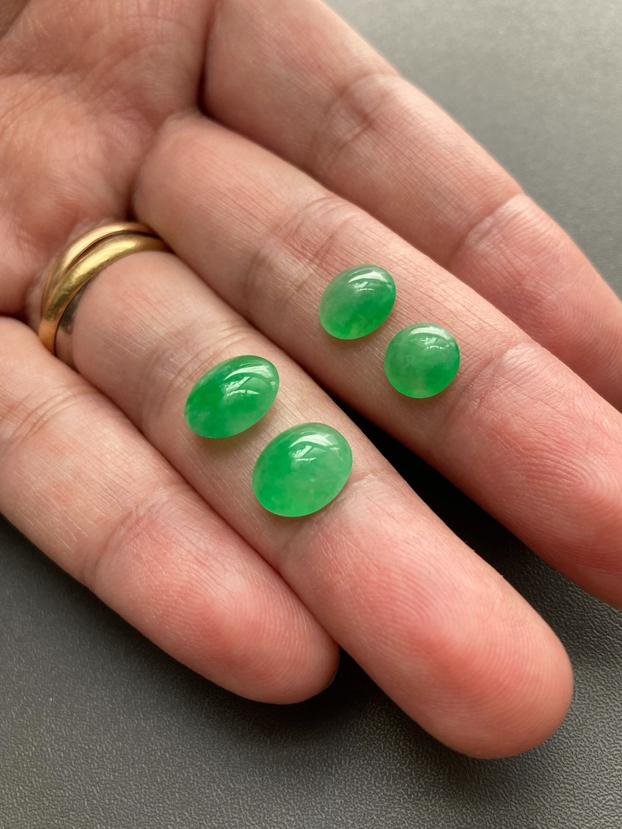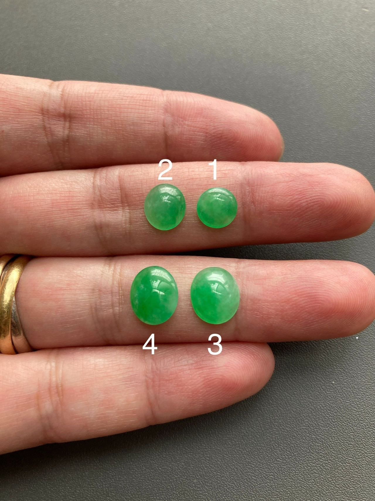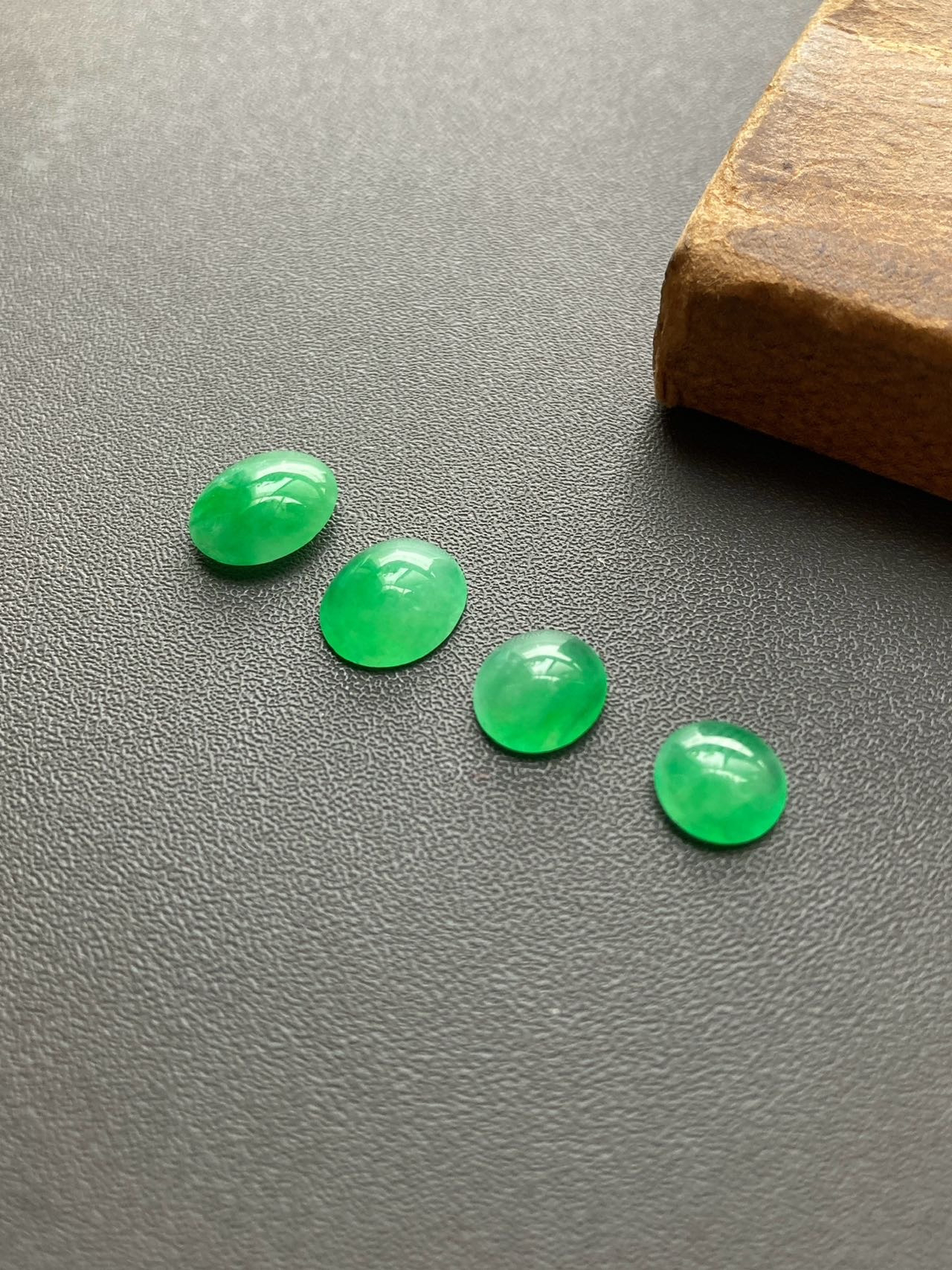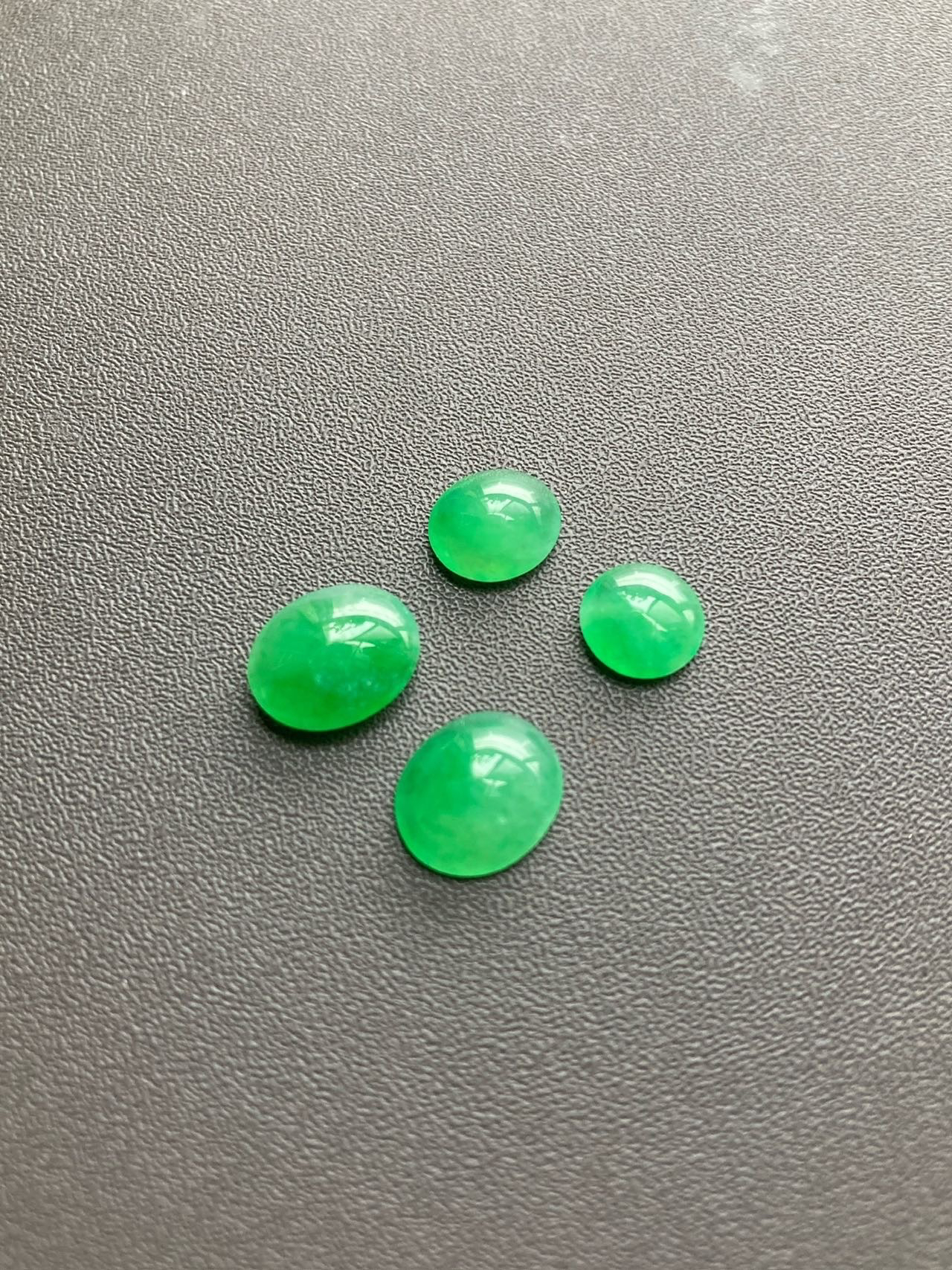 小四价位起上车一波冰种阳绿翡翠蛋面,缅甸料,种水晶莹剔透,正阳绿,在缅甸翡翠价格飞天的年代这机会不多了,更何况蛋面种色如此之漂亮,定制戒指吊坠都是美美哒,2号边缘有点石纹,影响不大,尺寸1号7.2×7.2×2.5mm,2号8.3×7.4×3.2mm,3号9.7×8.3×3.5mm