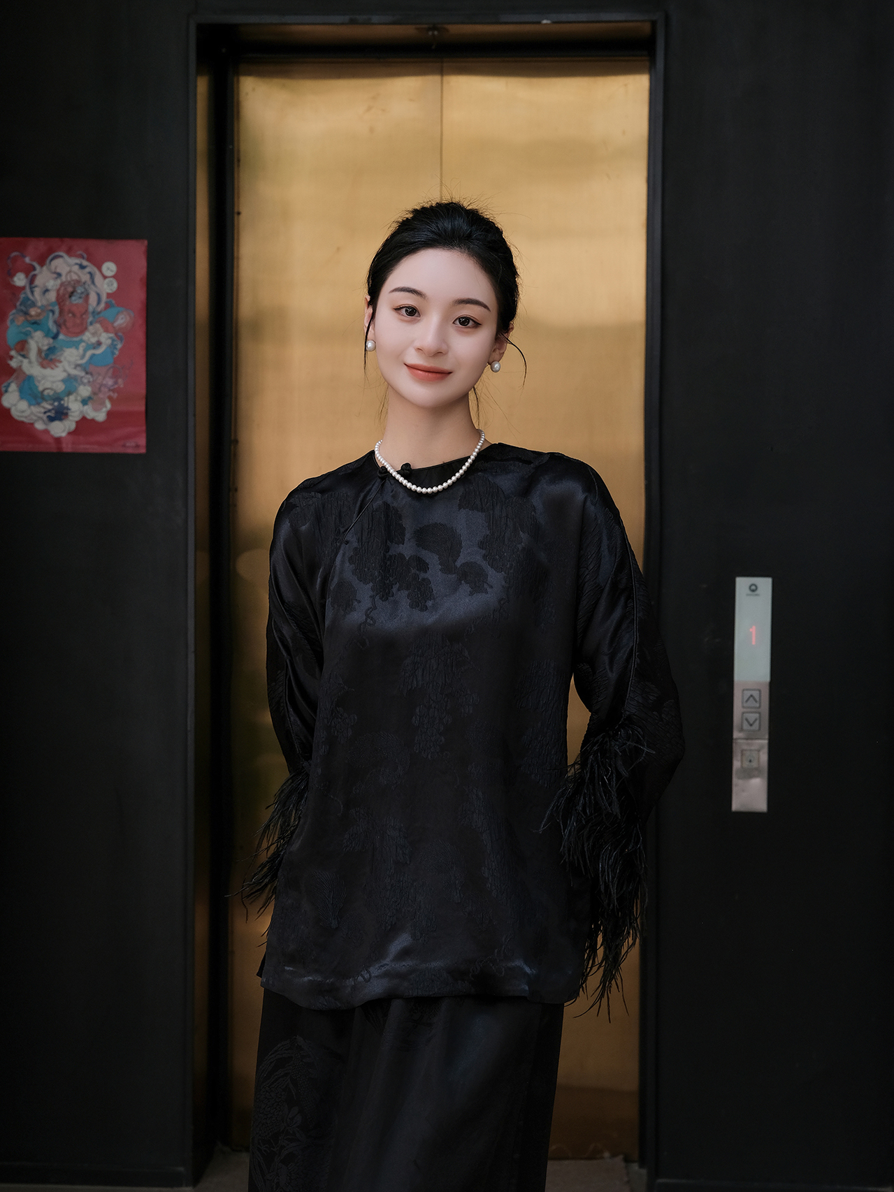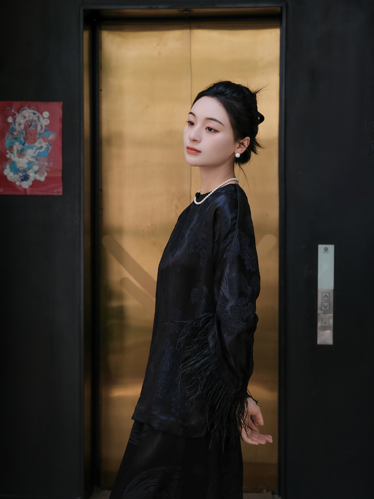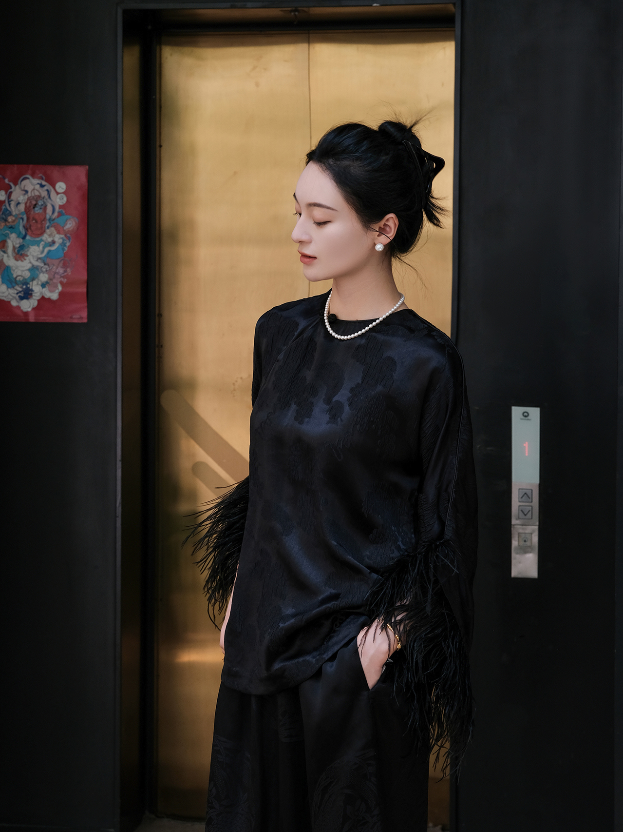 盛唐牡丹 |黑色冠乐绉斜襟上衣