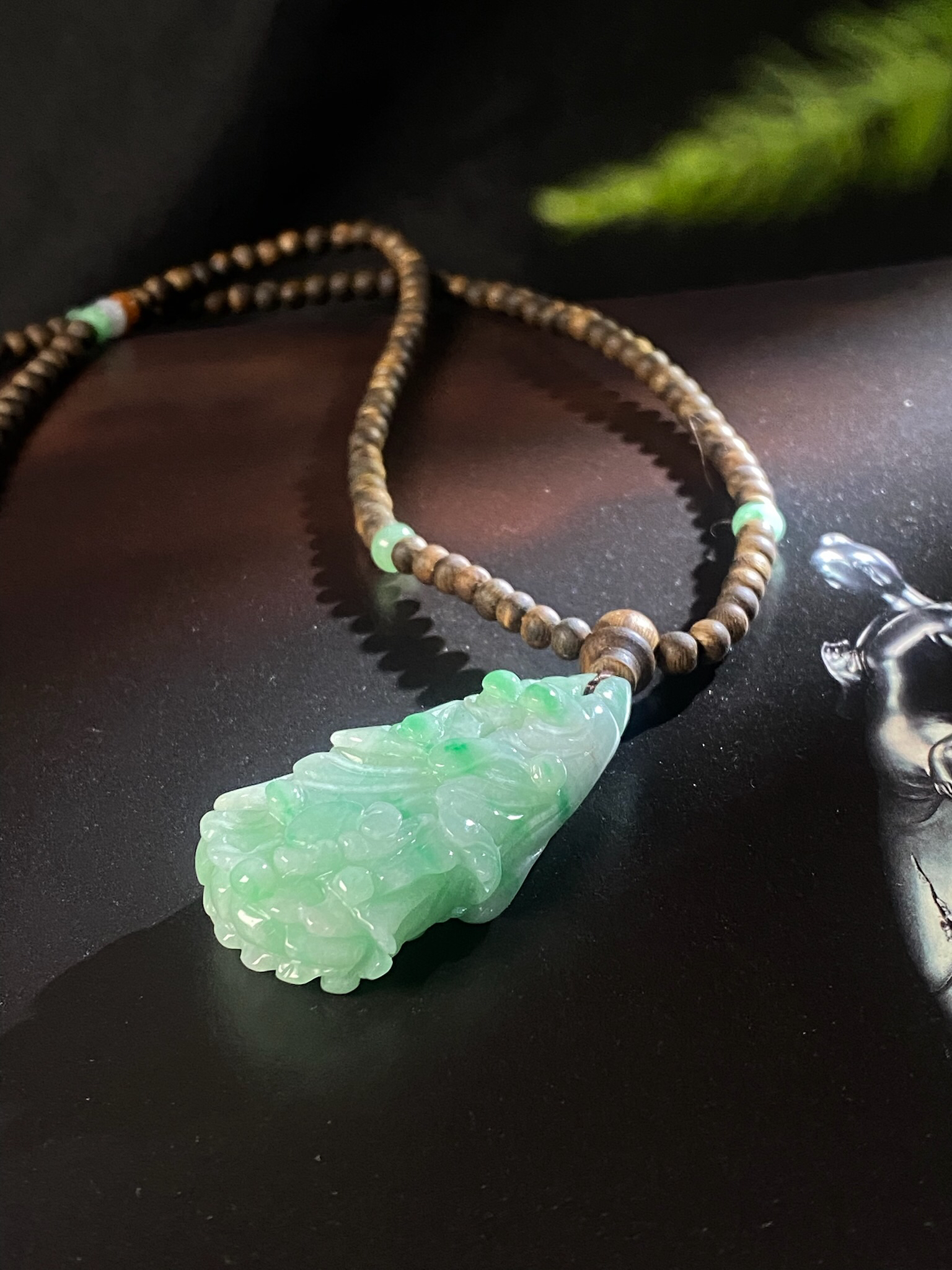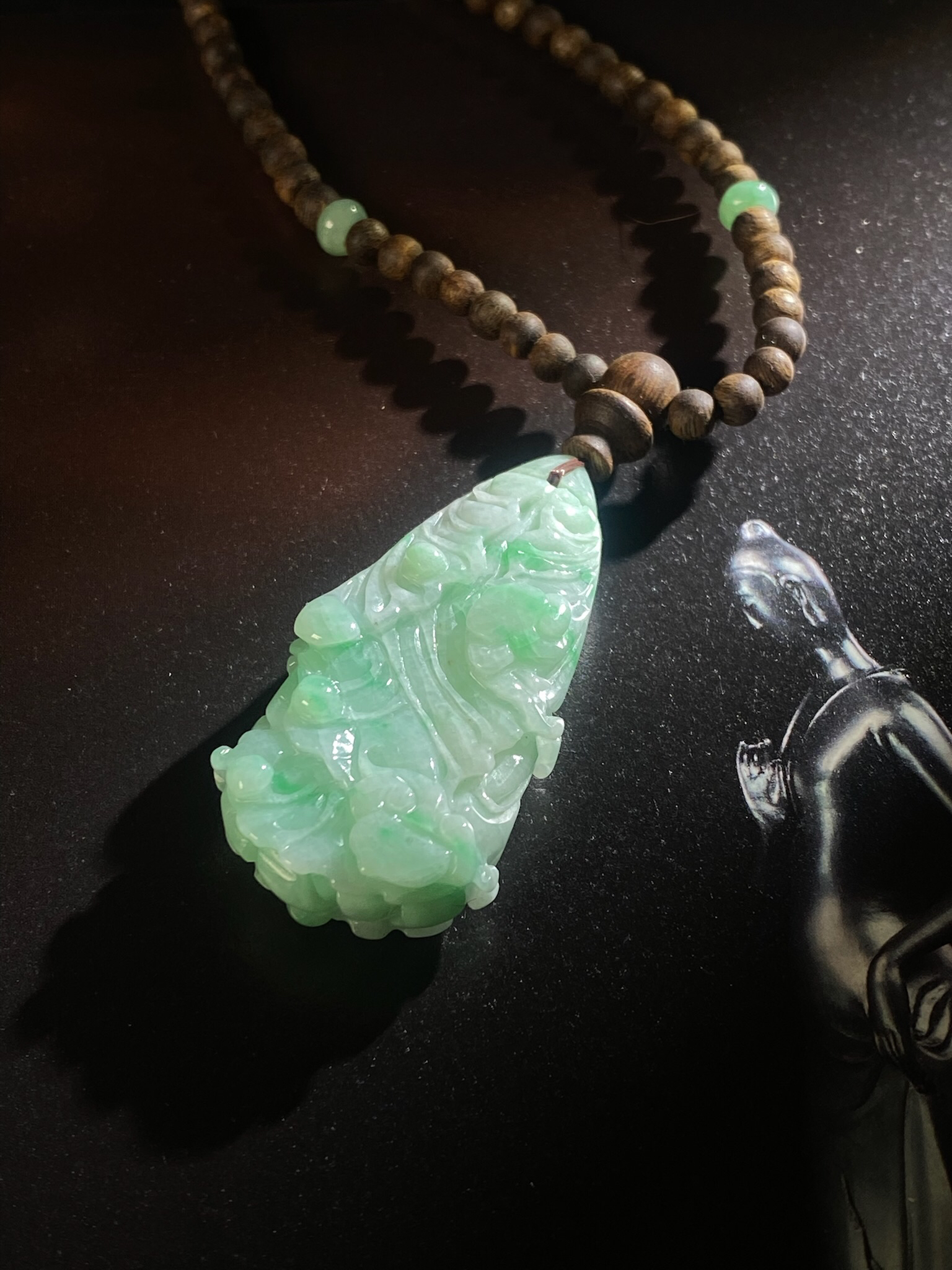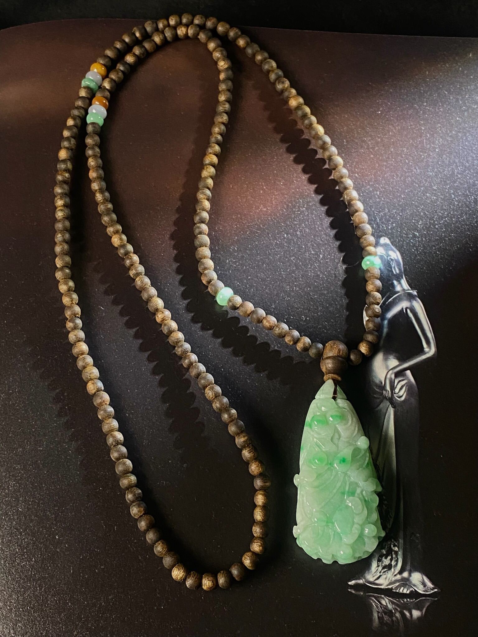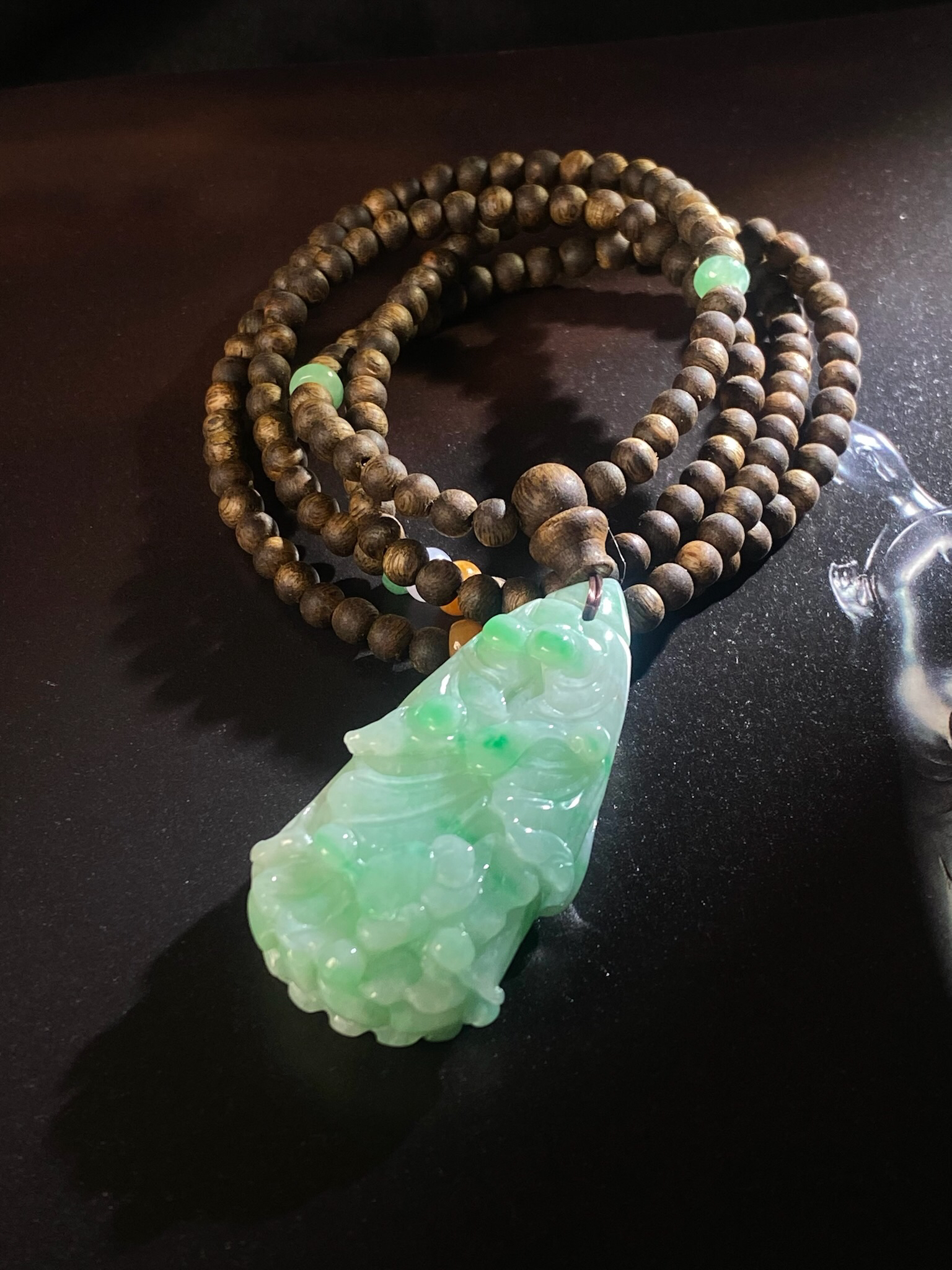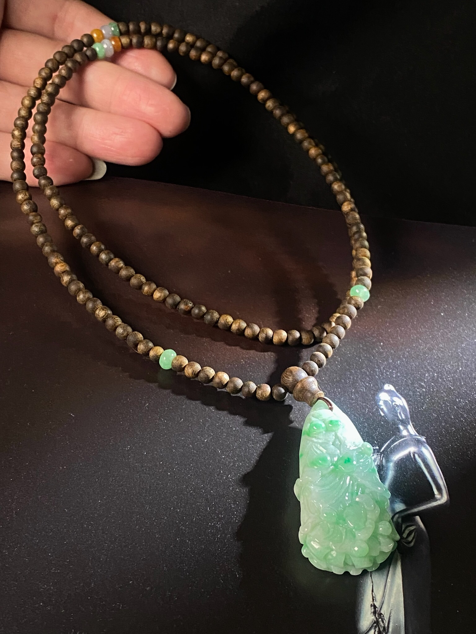 天然沉香奇楠+翡翠白菜套链。奇楠珠子4~4.5mm,链子总长34厘米,配珠:翡翠。整体材质无优化、原色原味、香韵甜凉、清幽雅致、古色古香。寓意:招财纳福,"白菜"谐音"百财",象征着财富和财运,寓意佩戴者或拥有者能够招来百样之财,财源广进,是对财富积累和经济富足的美好期许,常被视为招财进宝的象征物,有很好旺财的作用。