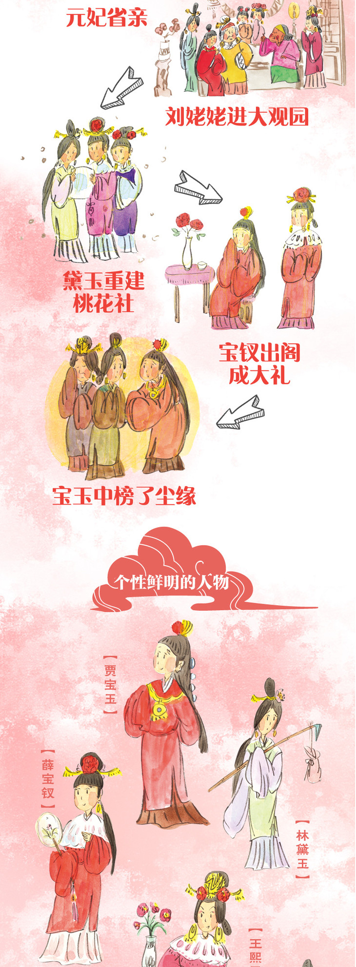 《新版美绘红楼梦》对《红楼梦》中较为复杂、错综复杂的叙事线索去粗取精,把家喻户晓的经典人物和故事纳入其中,将相对来说旁枝末节的人和事作了部分删减,更加突出宝黛钗以及主要人物(以十二金钗为主)的命运故事,同时展示出贾府的兴衰和当时的社会生活,在精简故事结构的同时保持整体架构的完整性,更利于儿童理解和接受。