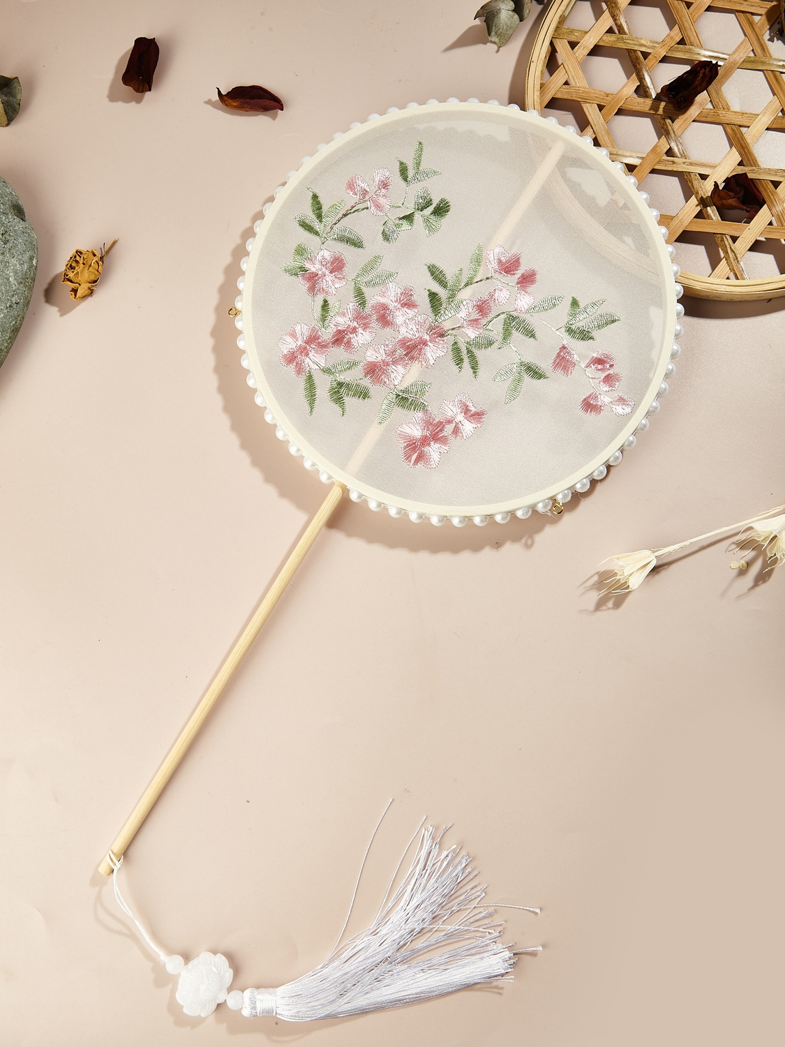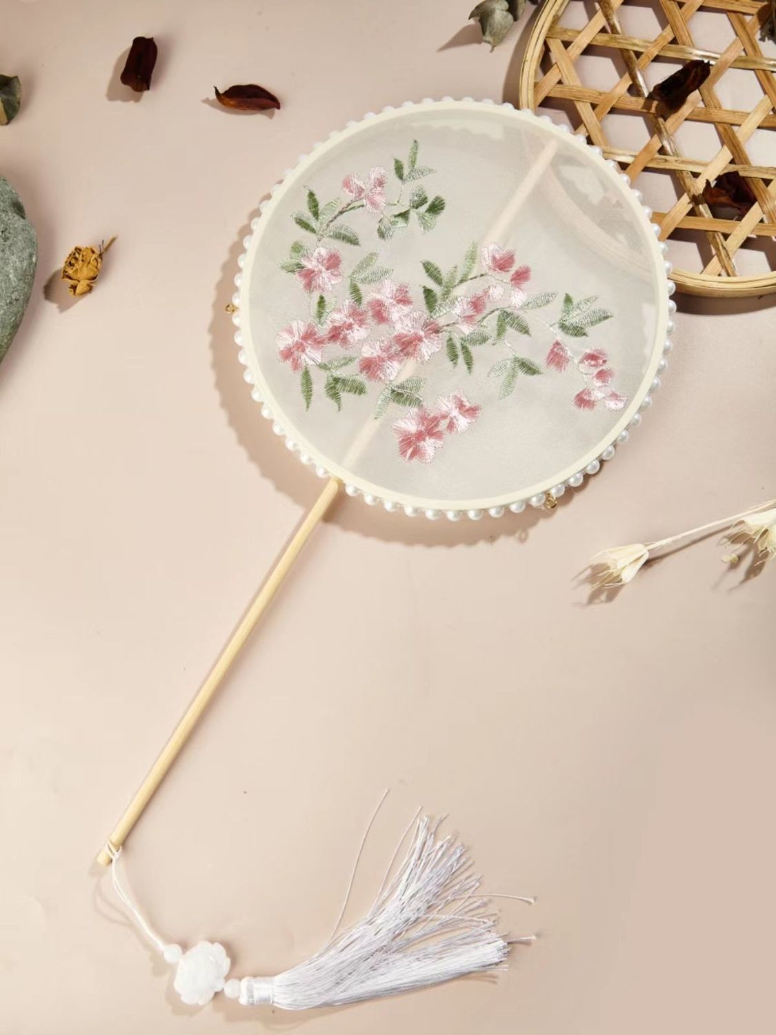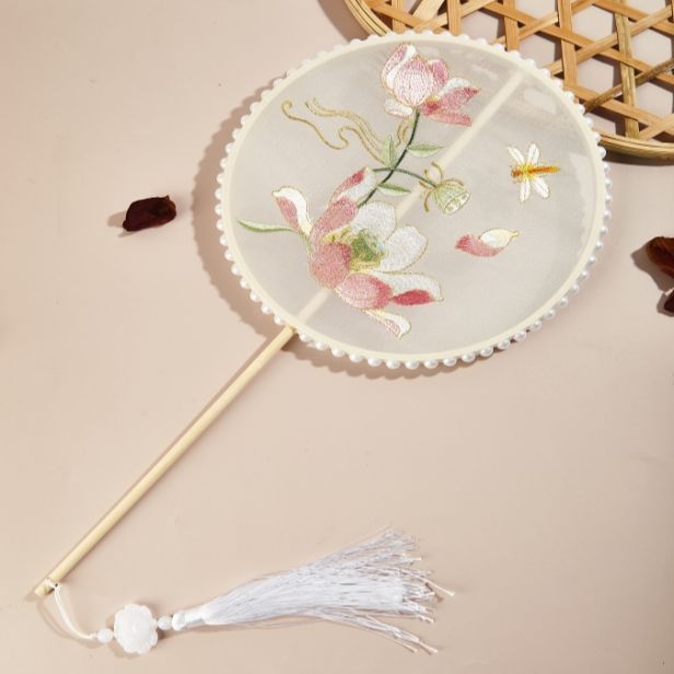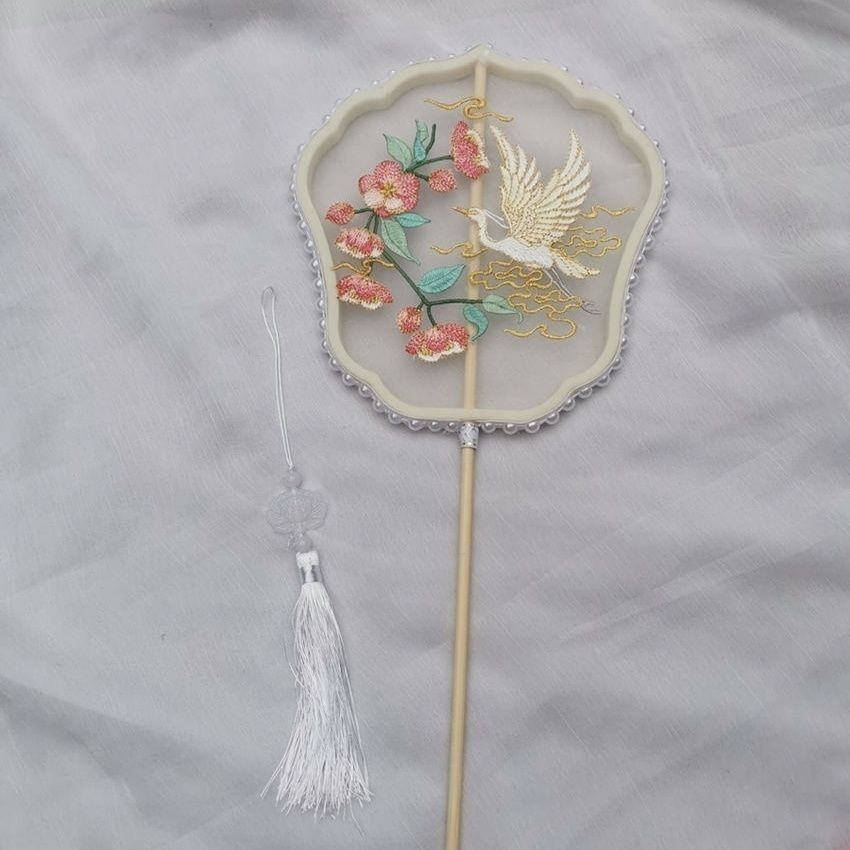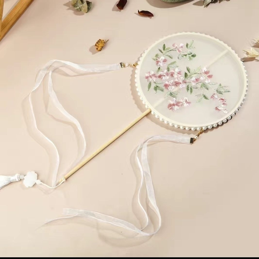 肥啾啾古风店透明刺绣款古风中长柄新娘团扇汉服舞蹈道具团扇古风