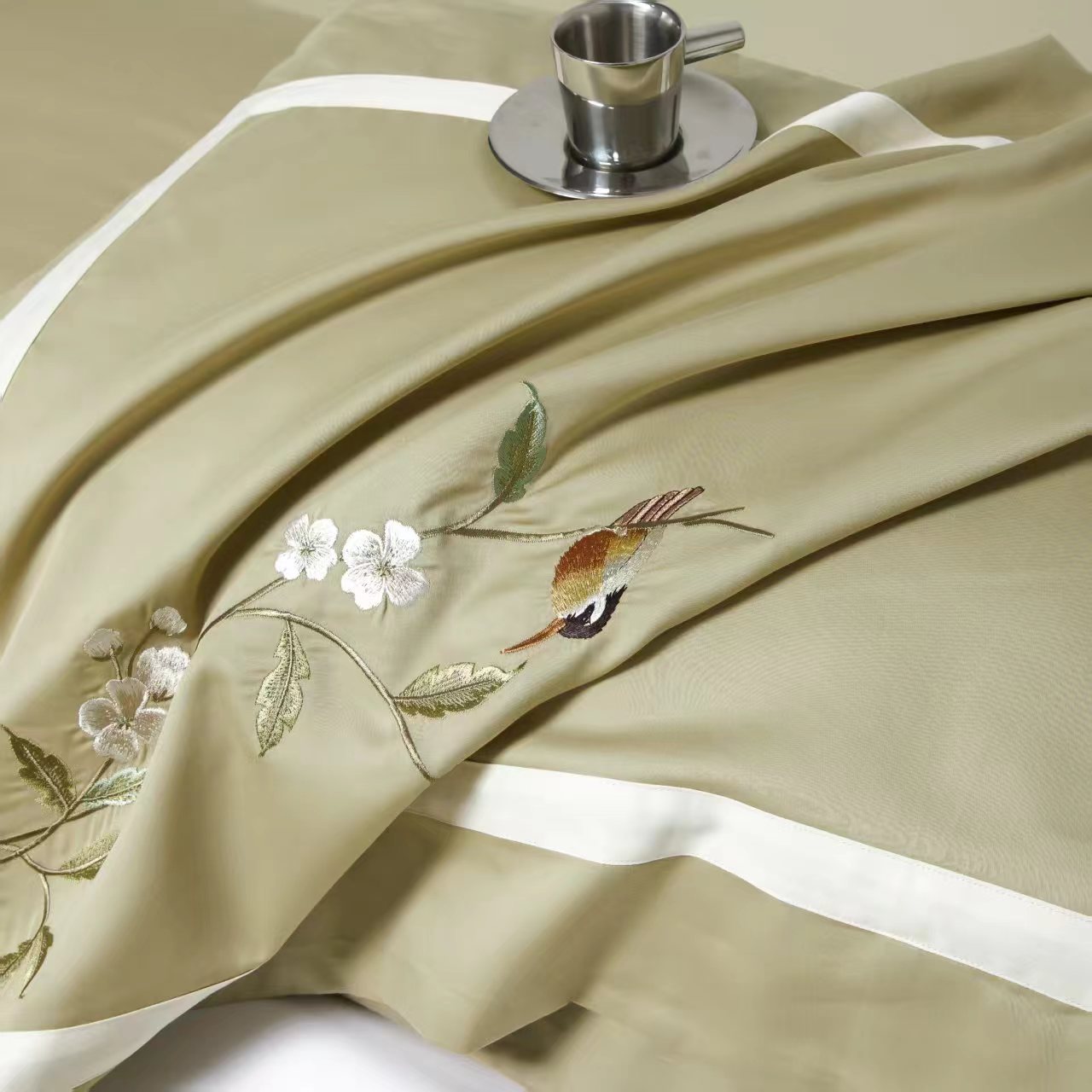 💫设计灵感源自国画《喜鹊登枝》,精致彩绣工艺将灵动喜鹊跃然呈现于被套、枕套上,寓意家有喜事,喜鹊临门~