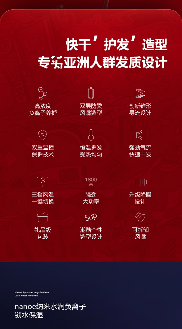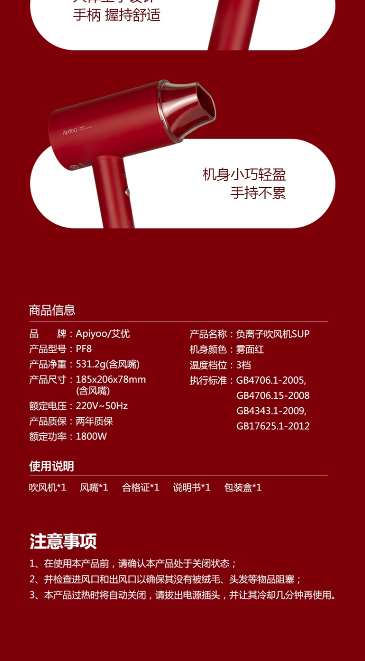APIYOO艾优负离子SUP吹风机女家用电吹风大功率不伤发网红限量款