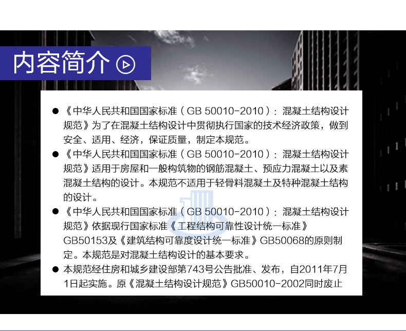 《中华人民共和国国家标准(GB 50010-2010):混凝土结构设计规范》为了在混凝土结构设计中贯彻执行国家的技术经济政策,做到安全、适用、经济,保证质量,制定本规范。 《中华人民共和国国家标准(GB 50010-2010):混凝土结构设计规范》适用于房屋和一般构筑物的钢筋混凝土、预应力混凝土以及素混凝土结构的设计。本规范不适用于轻骨料混凝土及特种混凝土结构的设计。 《中华人民共和国国家标准(GB 50010-2010):混凝土结构设计规范》依据现行国家标准《工程结构可靠性设计统一标准》GB50153及《建筑结构可靠度设计统一标准》GB50068的原则制定。本规范是对混凝土结构设计的基本要求。 本规范经住房和城乡建设部第743号公告批准、发布,自2011年7月1日起实施。原《混凝土结构设计规范》GB50010-2002同时废止。
