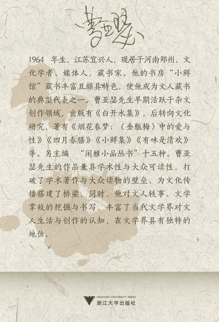 曹亚瑟, 1964 年生,江苏宜兴人,现居于河南郑州,文化学者、媒体人,藏书家。他的书房 “小鲜馆” 藏书丰富且颇具特色,使他成为文人藏书的典型代表之一。曹亚瑟先生早期活跃于杂文创作领域,出版有《白开水集》,后转向文化研究,著有《烟花春梦:〈金瓶梅〉中的爱与性》《四月春膳》《小鲜集》《有味是清欢》等。另主编 “闲雅小品丛书”十五种。曹亚瑟先生的作品兼具学术性与大众可读性,打破了学术著作与大众读物的壁垒,为文化传播搭建了桥梁,同时,他对文人轶事、文学掌故的挖掘与书写,丰富了当代文学界对文人生活与创作的认知,在文学界具有独特的地位。