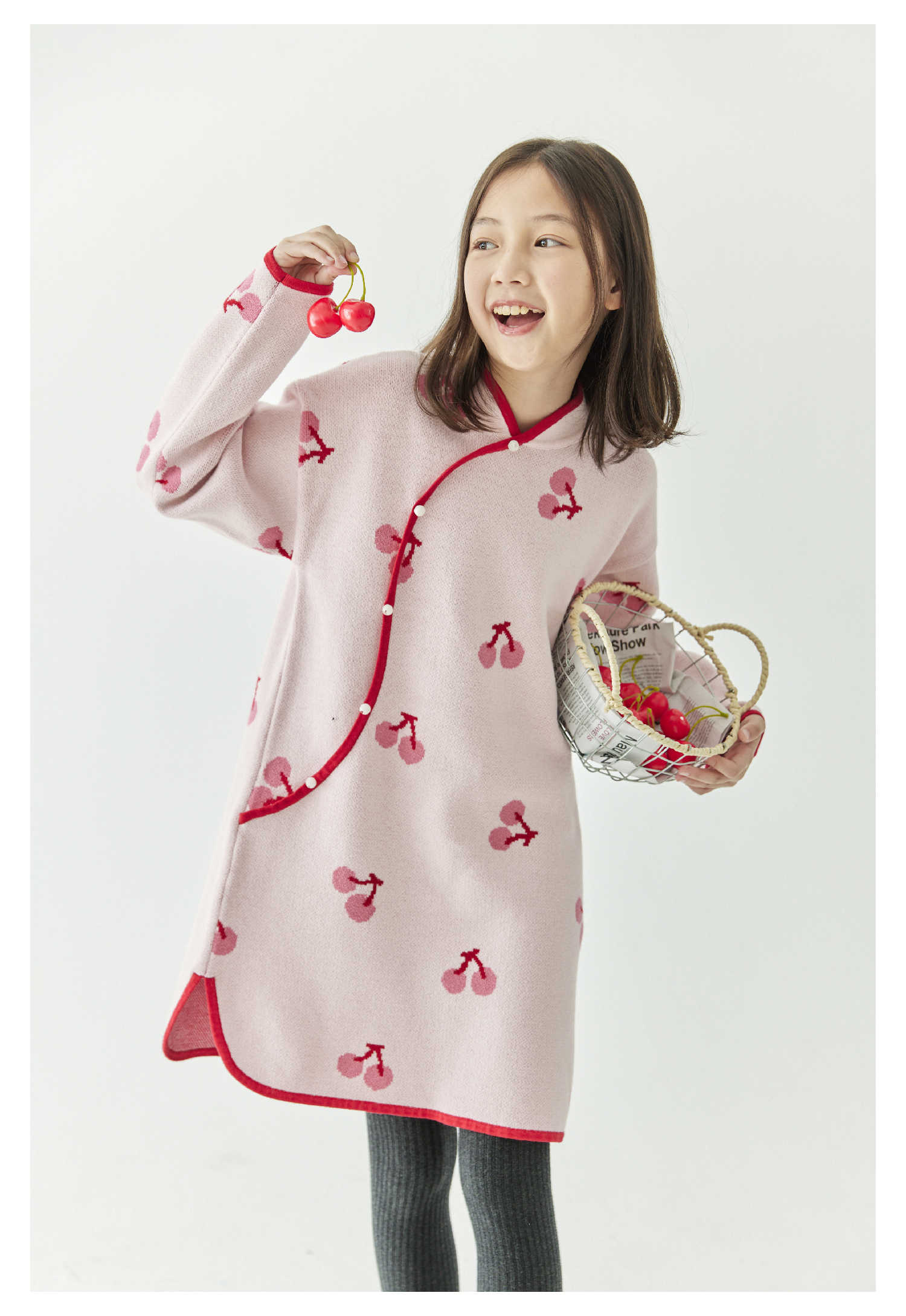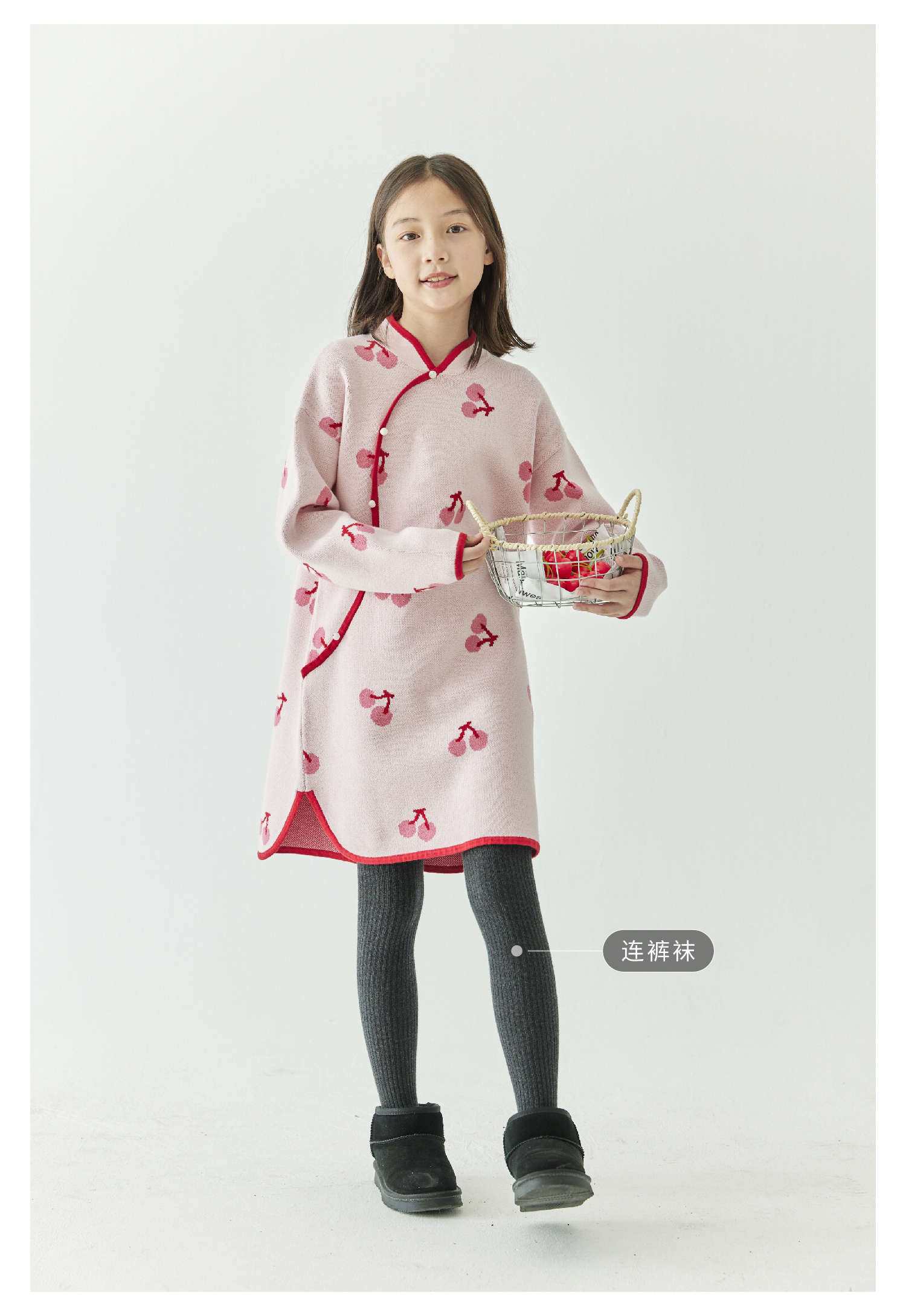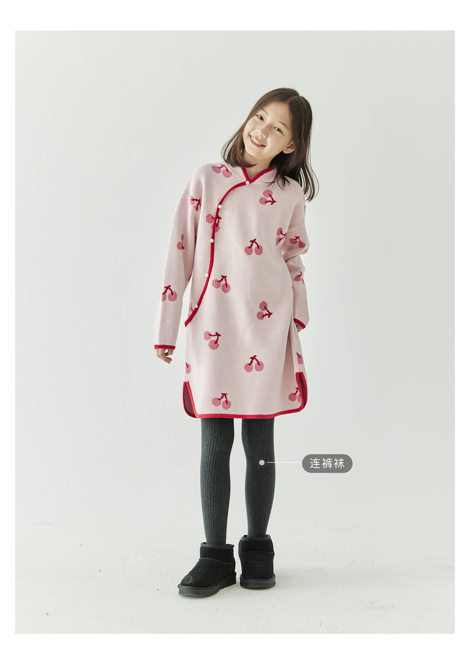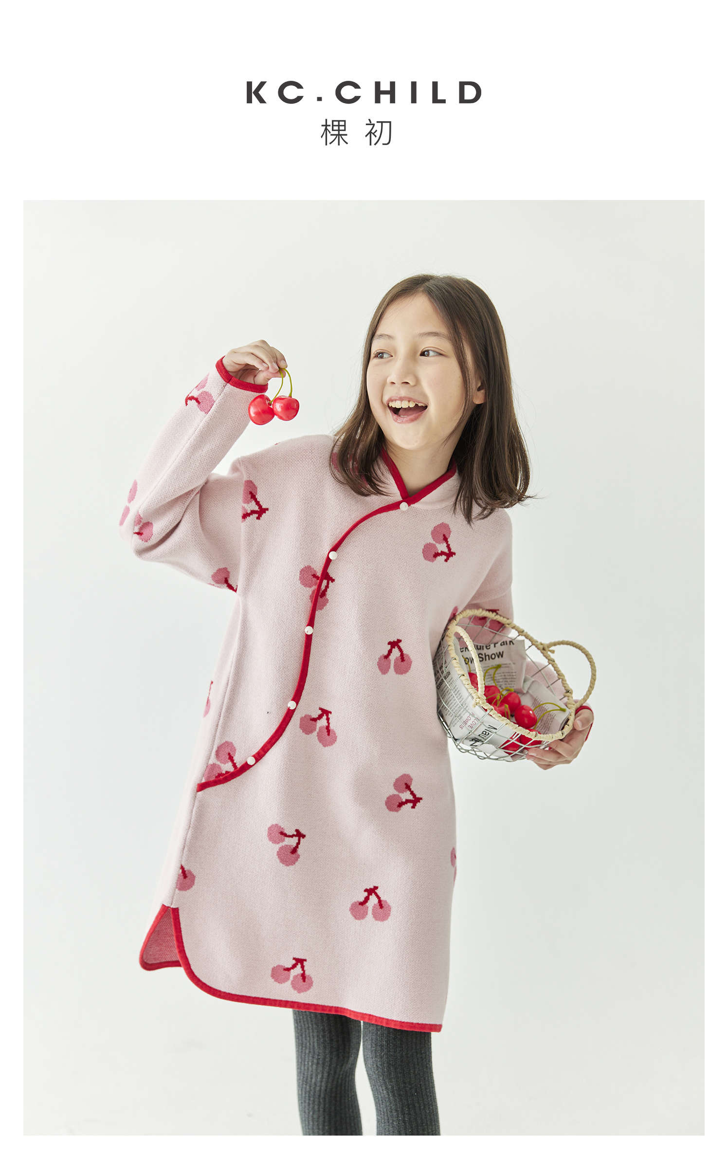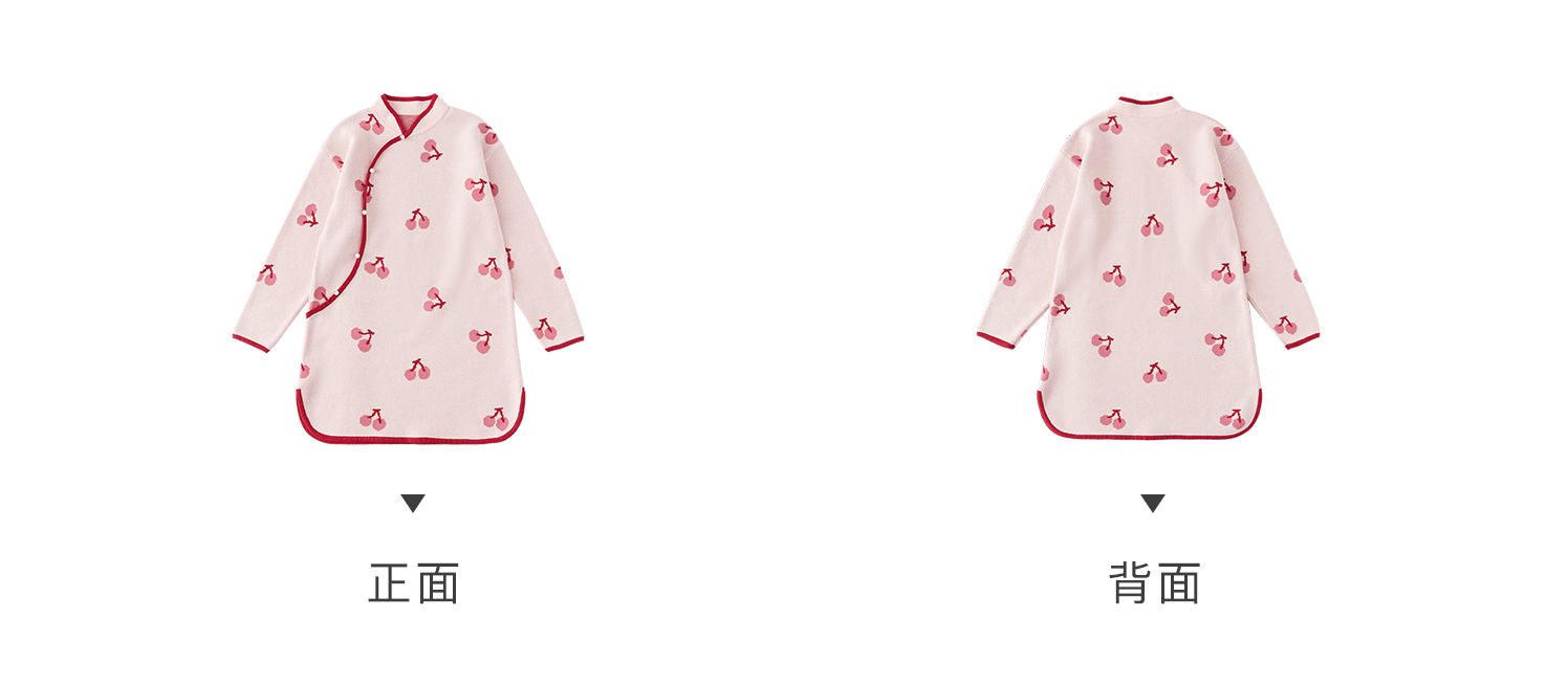 棵初2024年冬季新款女童新中式全棉针织旗袍裙甜美俏皮樱桃连衣裙
