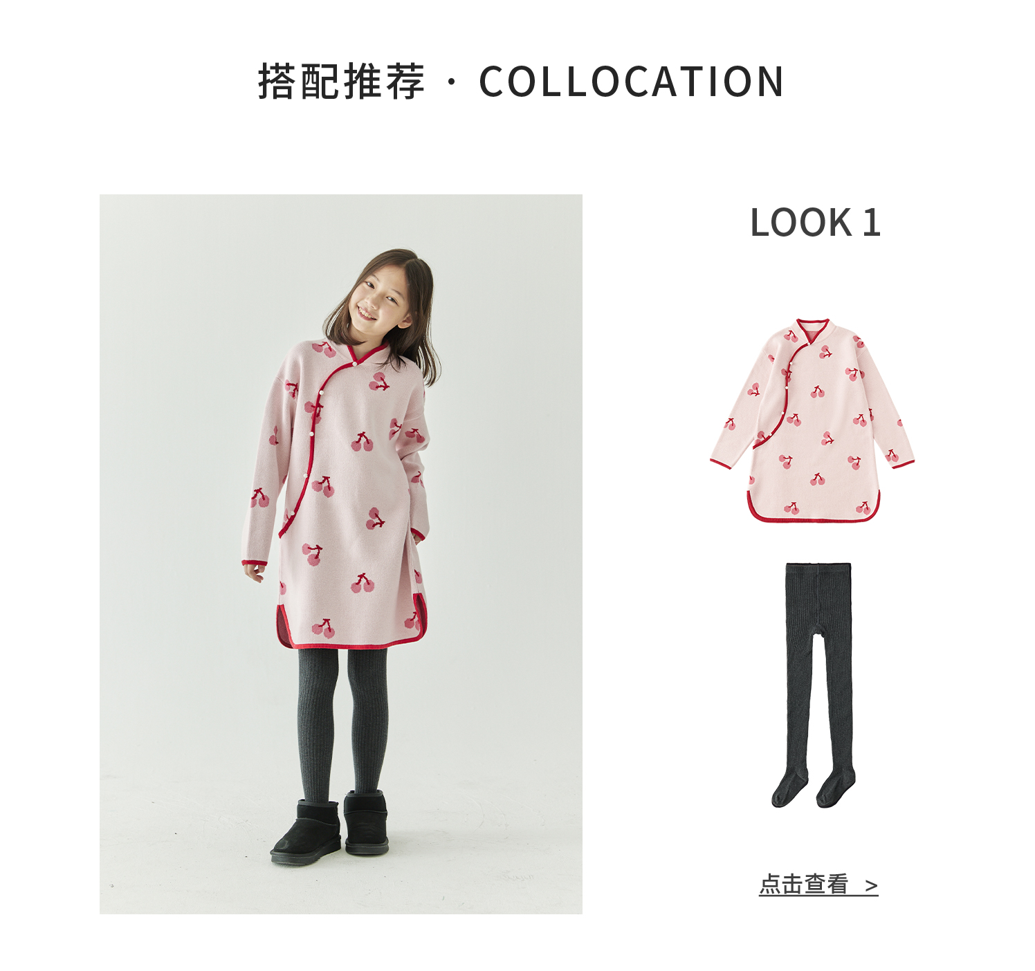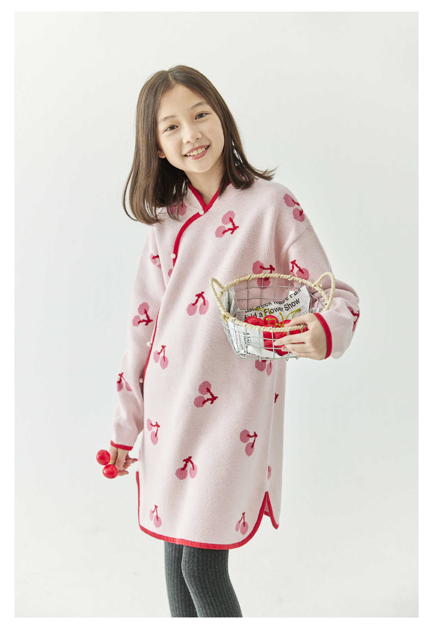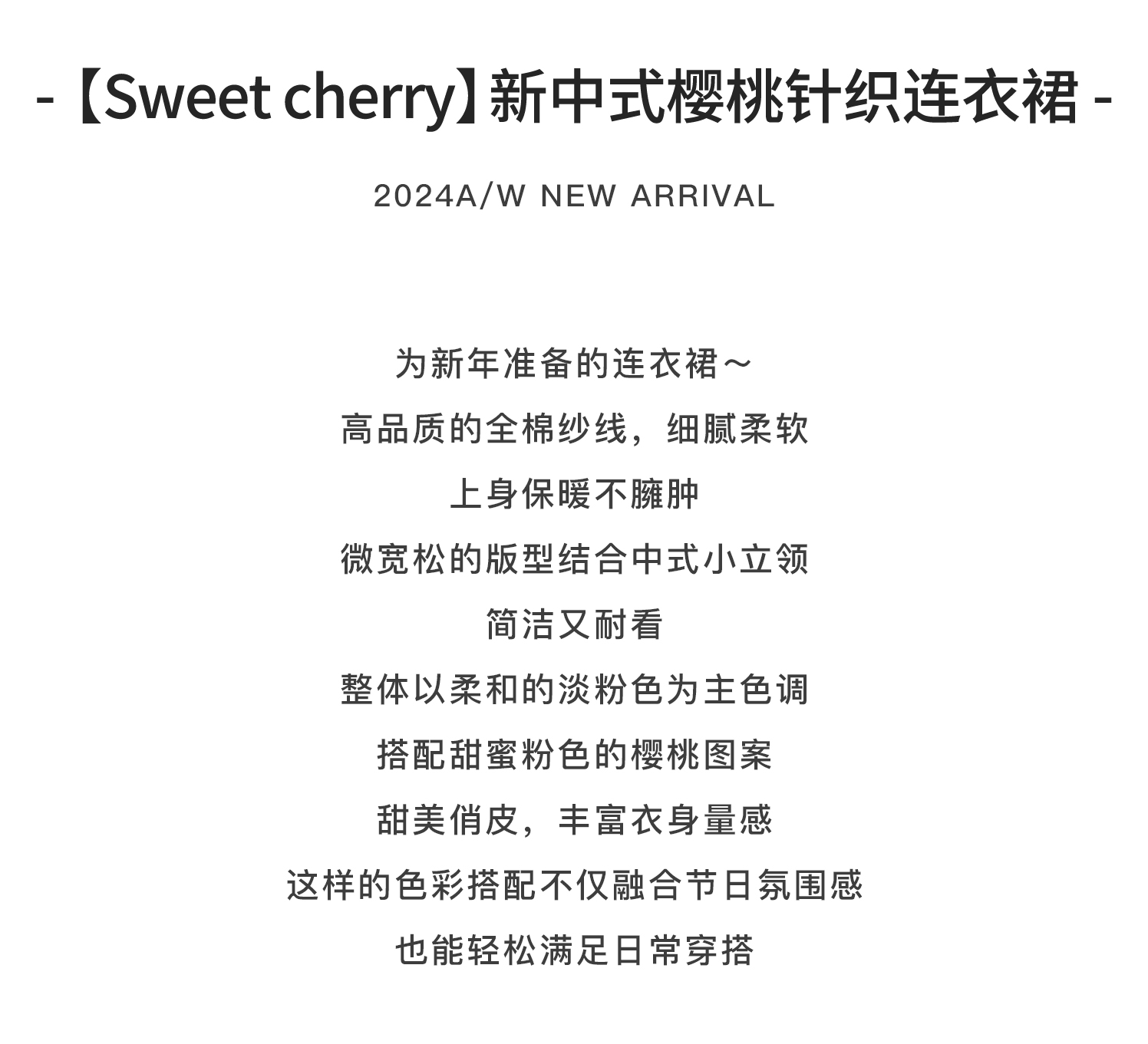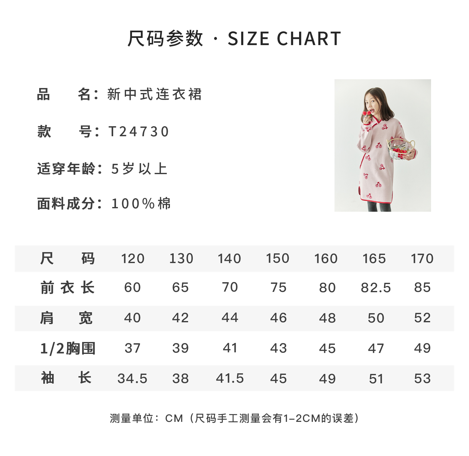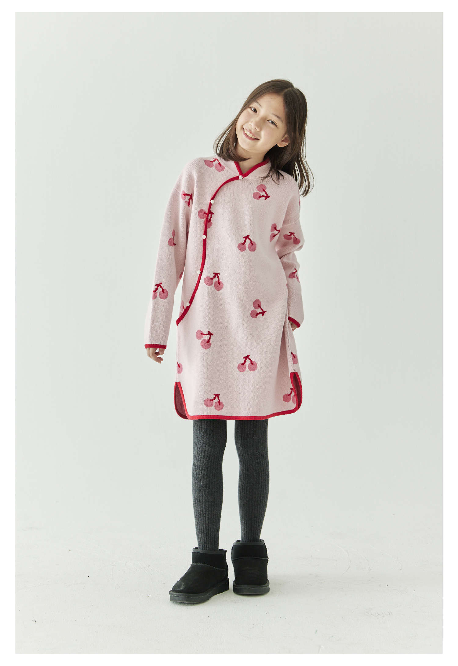 棵初2024年冬季新款女童新中式全棉针织旗袍裙甜美俏皮樱桃连衣裙