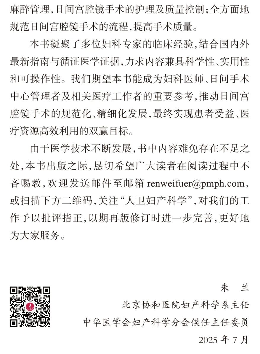 3. 本书由中国日间手术合作联盟妇科专业日间手术专家委员会主任委员朱兰教授牵头组织编写,内容科学、规范,语言简洁、结构清晰,采用便于携带的“口袋书”形式,适合广大妇产科医师、日间手术中心管理人员及相关医疗工作者阅读使用,是提升日间宫腔镜手术水平与质量管理能力的权威参考。