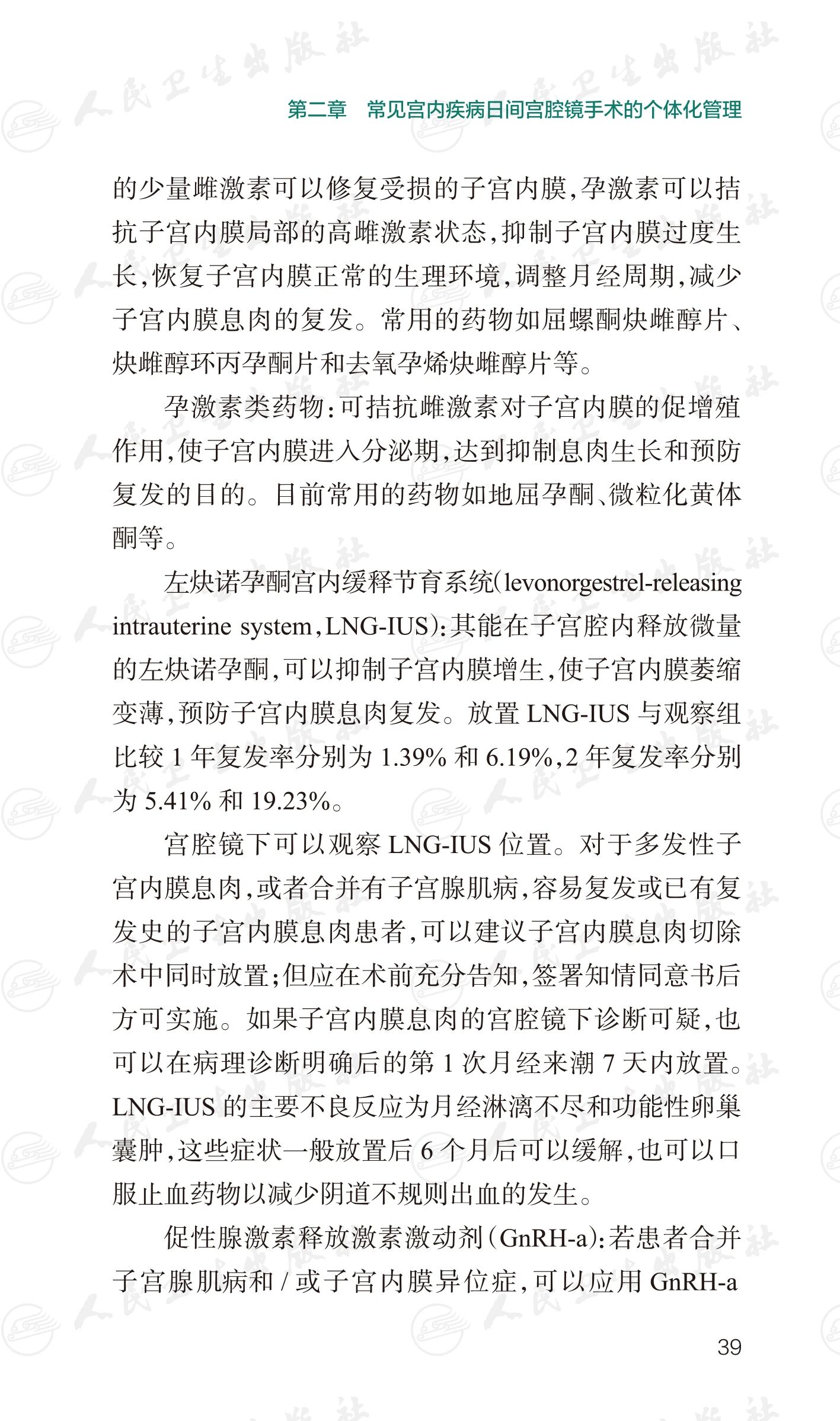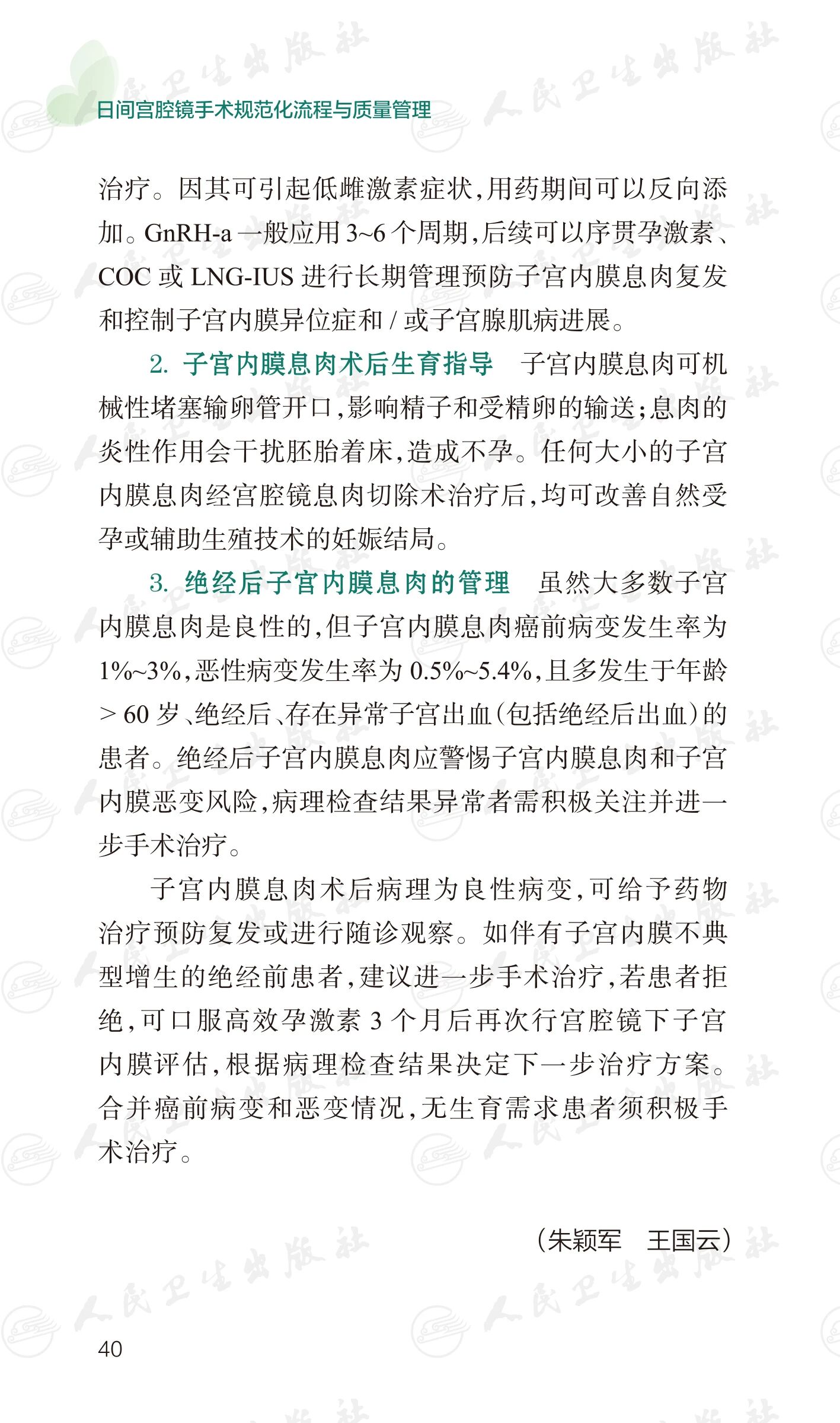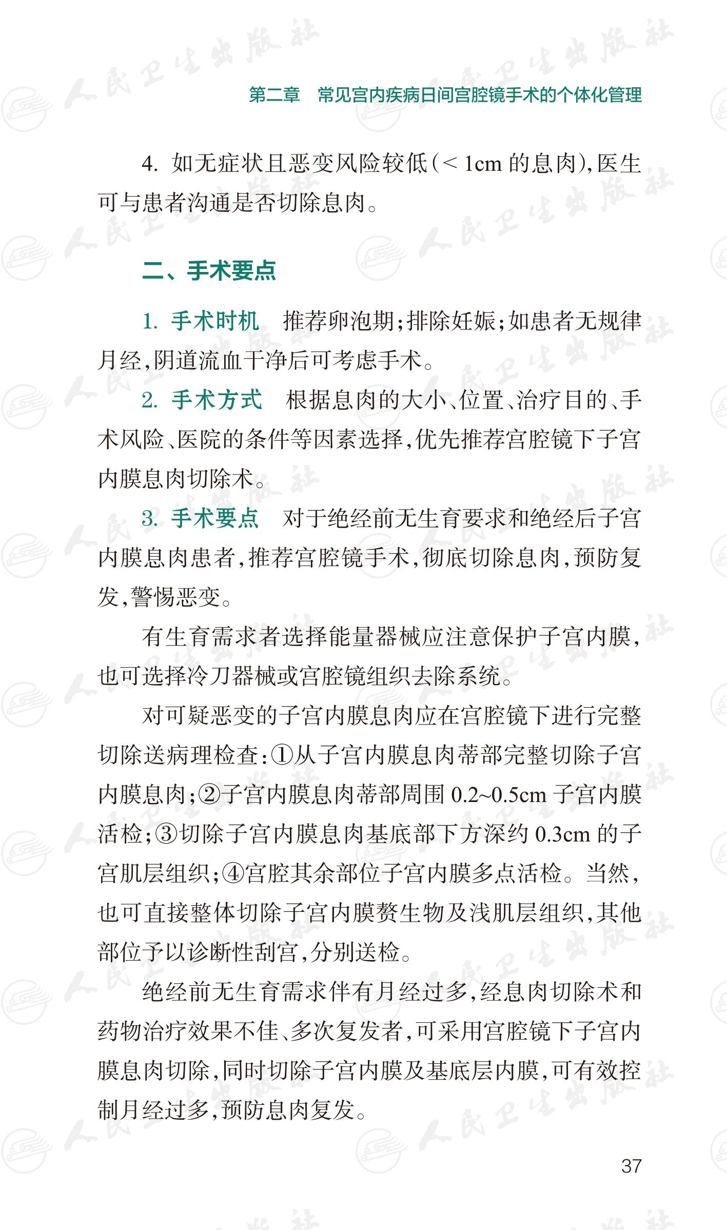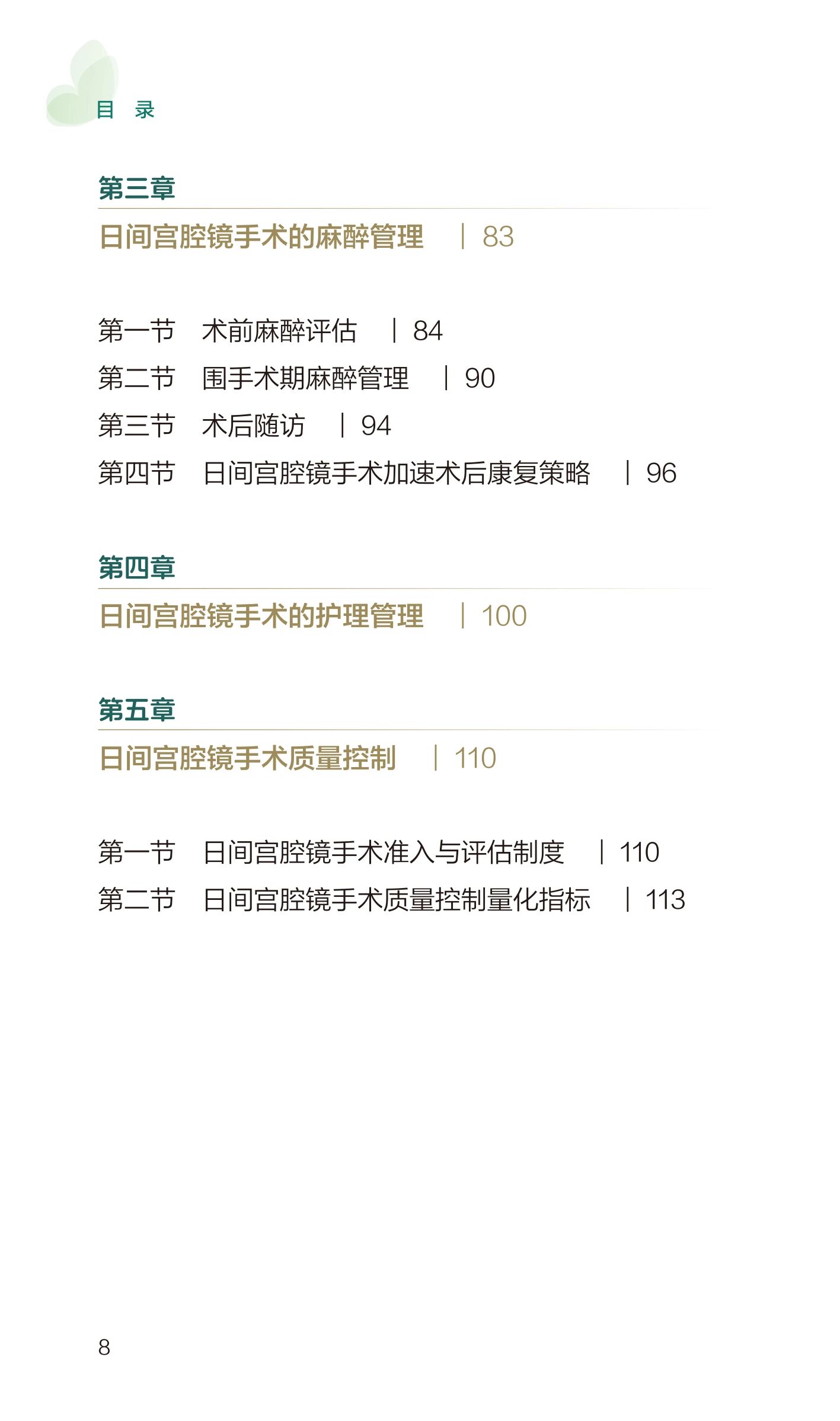 1.《日间宫腔镜手术规范化流程与质量管理》一书聚焦日间模式下宫腔镜手术的标准化操作与全程质量控制,系统阐述了从术前评估到术后康复的全周期管理策略。主要内容包括:宫内疾病日间宫腔镜手术的综合管理,覆盖术前至术后全流程;常见疾病如子宫内膜息肉、子宫黏膜下肌瘤、妊娠胚物残留等的个体化手术方案;全面细致的麻醉管理;以及护理操作与质量控制要点。致力于帮助医疗团队建立高效、安全的日间手术流程。