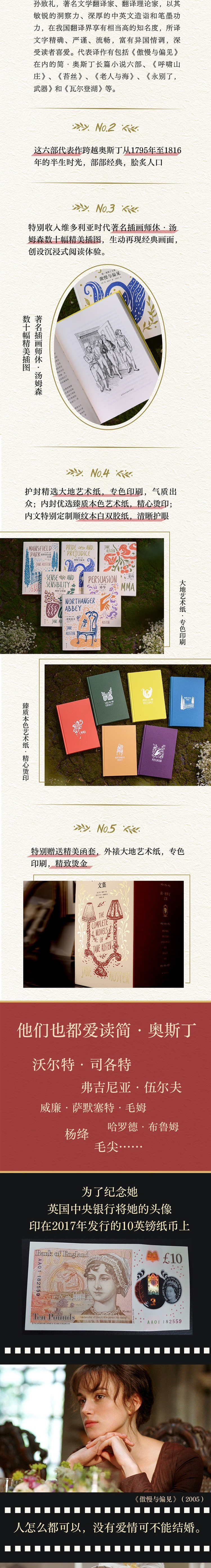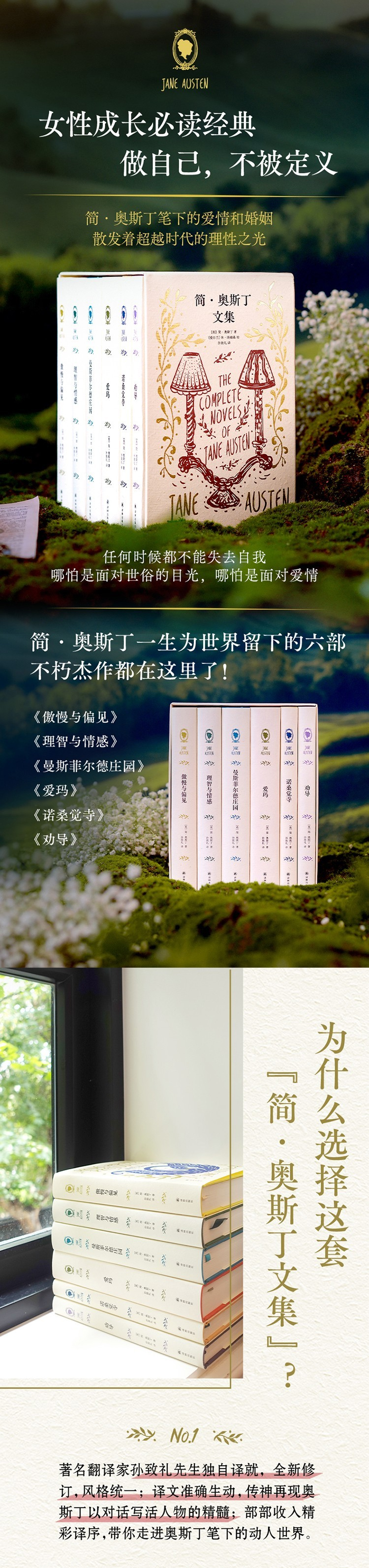 书籍介绍: 一套收齐简·奥斯丁六部长篇代表作!面对爱情和婚姻的人生课题,奥斯丁书写的理性散发着耀眼的光芒。每部都收入孙致礼的精彩译序和多幅休·汤姆森经典插图,创设沉浸式阅读体验,带你走进奥斯丁笔下的动人世界。
