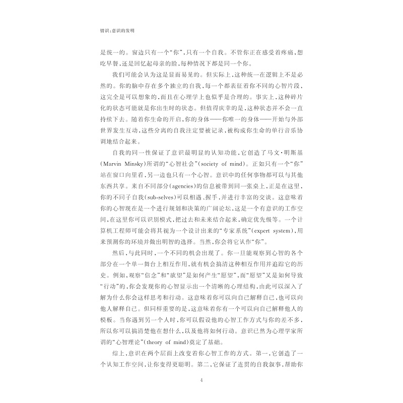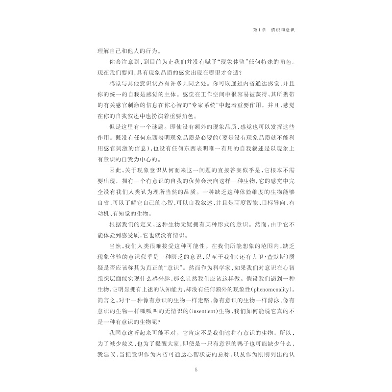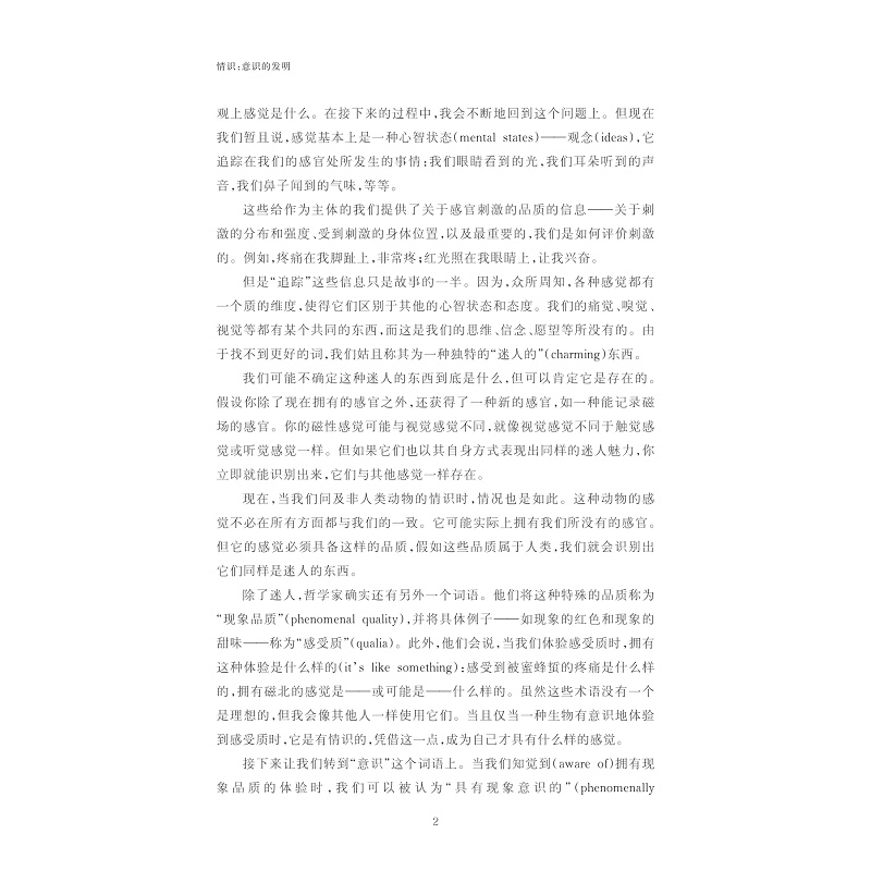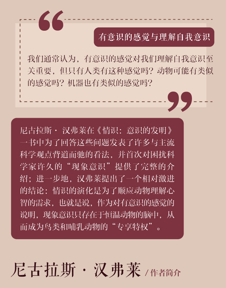 我们通常认为,有意识的感觉对我们理解自我意识至关重要,但只有人类有这种感觉吗?动物可能有类似的感觉吗?机器也有类似的感觉吗?尼古拉斯· 汉弗莱在《情识:意识的发明》一书中为了回答这些问题发表了许多与主流科学观点背道而驰的看法,并首次对困扰科学家许久的“现象意识”提供了完整的介绍;进一步地,汉弗莱提出了一个相对激进的结论:情识的演化是为了顺应动物理解心智的需求,也就是说,作为对有意识的感觉的说明,现象意识只存在于恒温动物的脑中,从而成为鸟类和哺乳动物的“专享特权”。