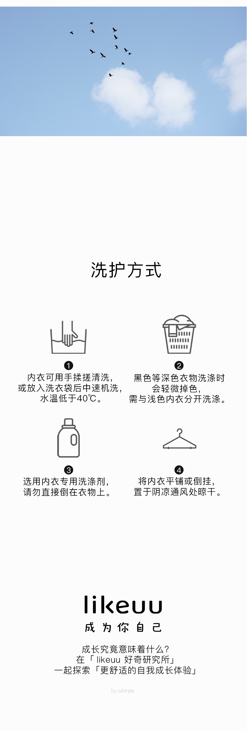 - likeuu是专注于为6~15岁的青少年创造柔软、无束缚的成长体验,以好奇心为灵感的成长发育期贴身衣物品牌。likeuu的产品覆盖内衣、内裤、保暖衣、家居服、运动等品类。