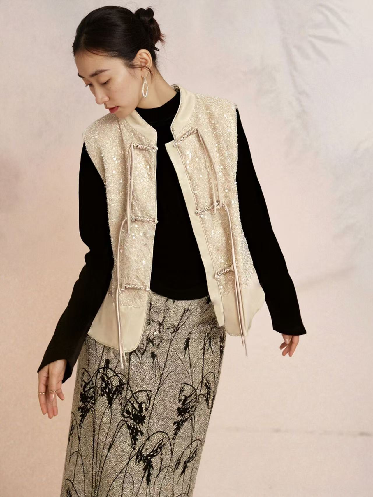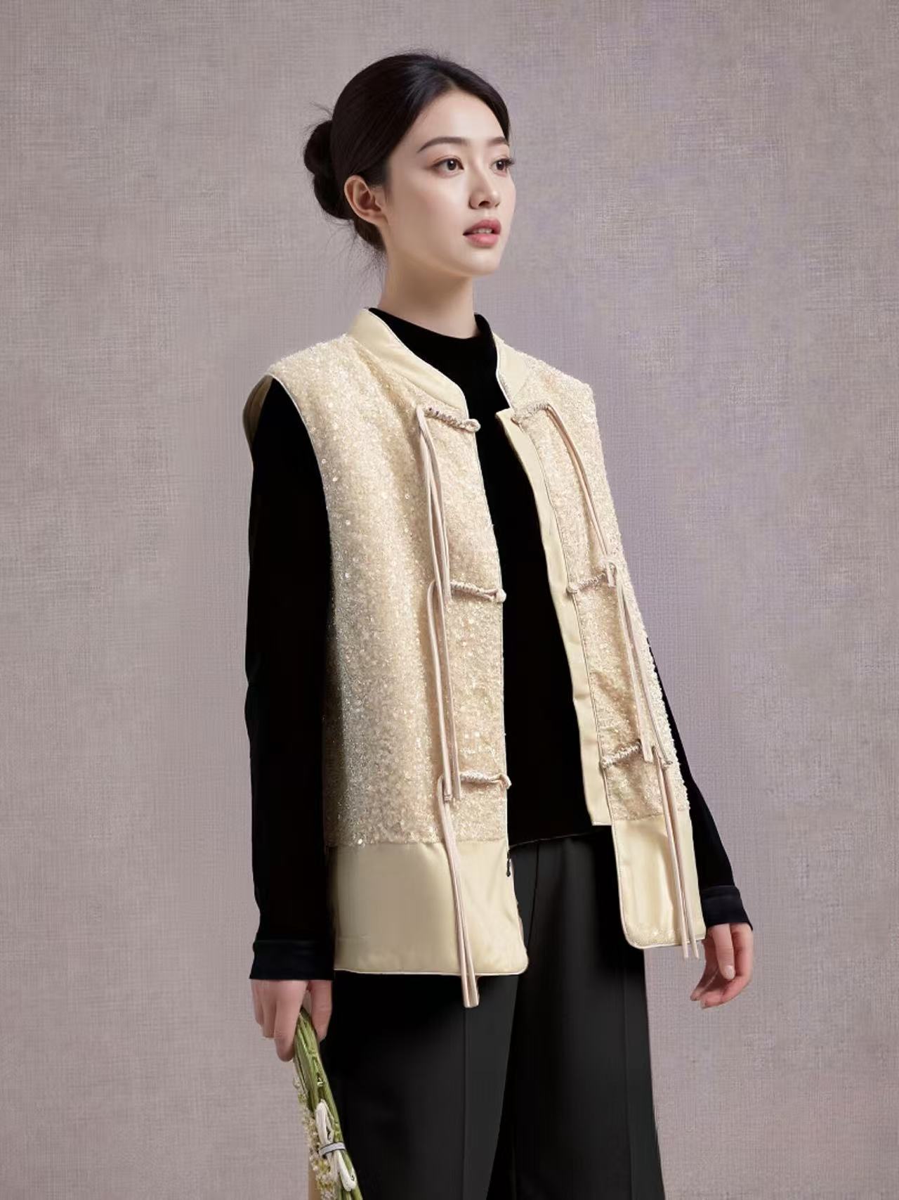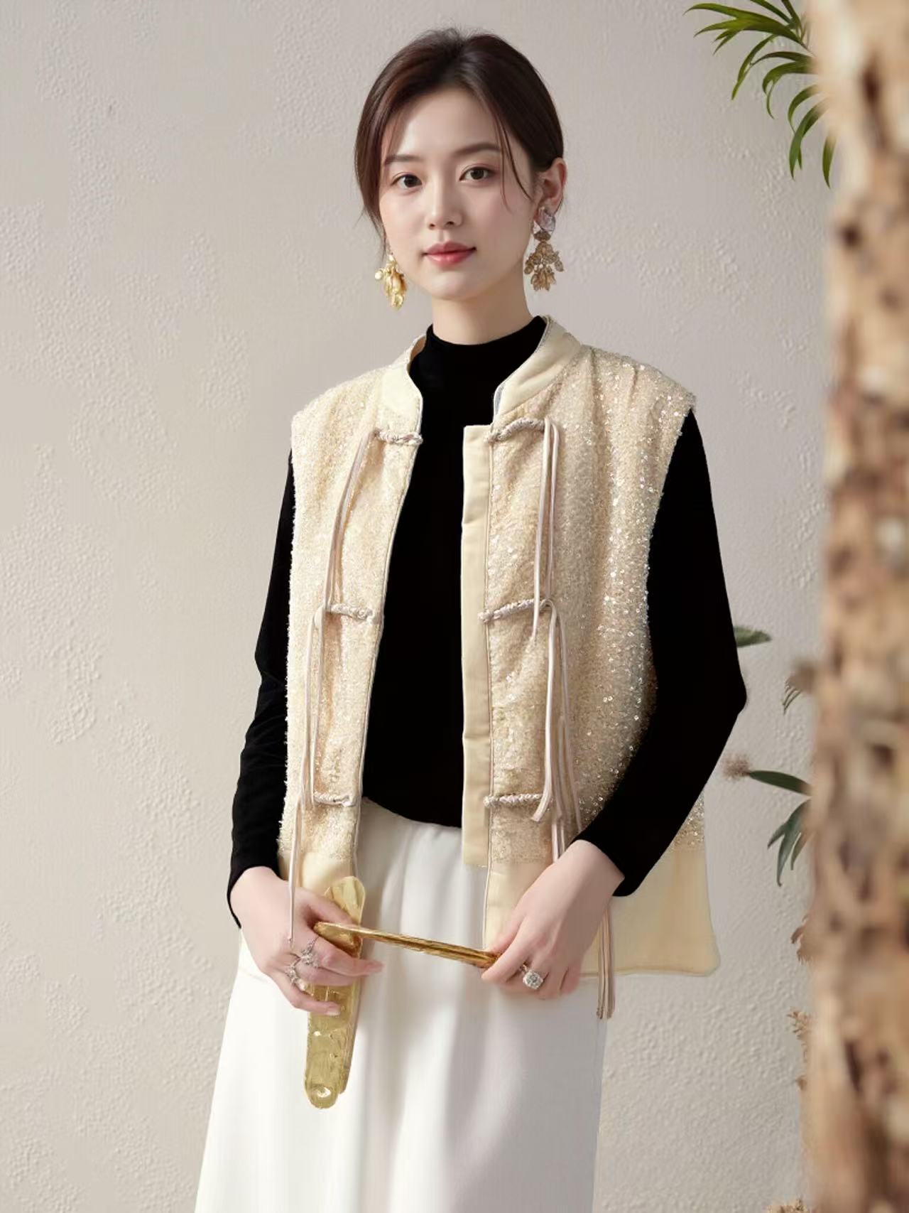 重工亮片马甲!!2875金丝绒新中式盘扣亮片马甲-喜出