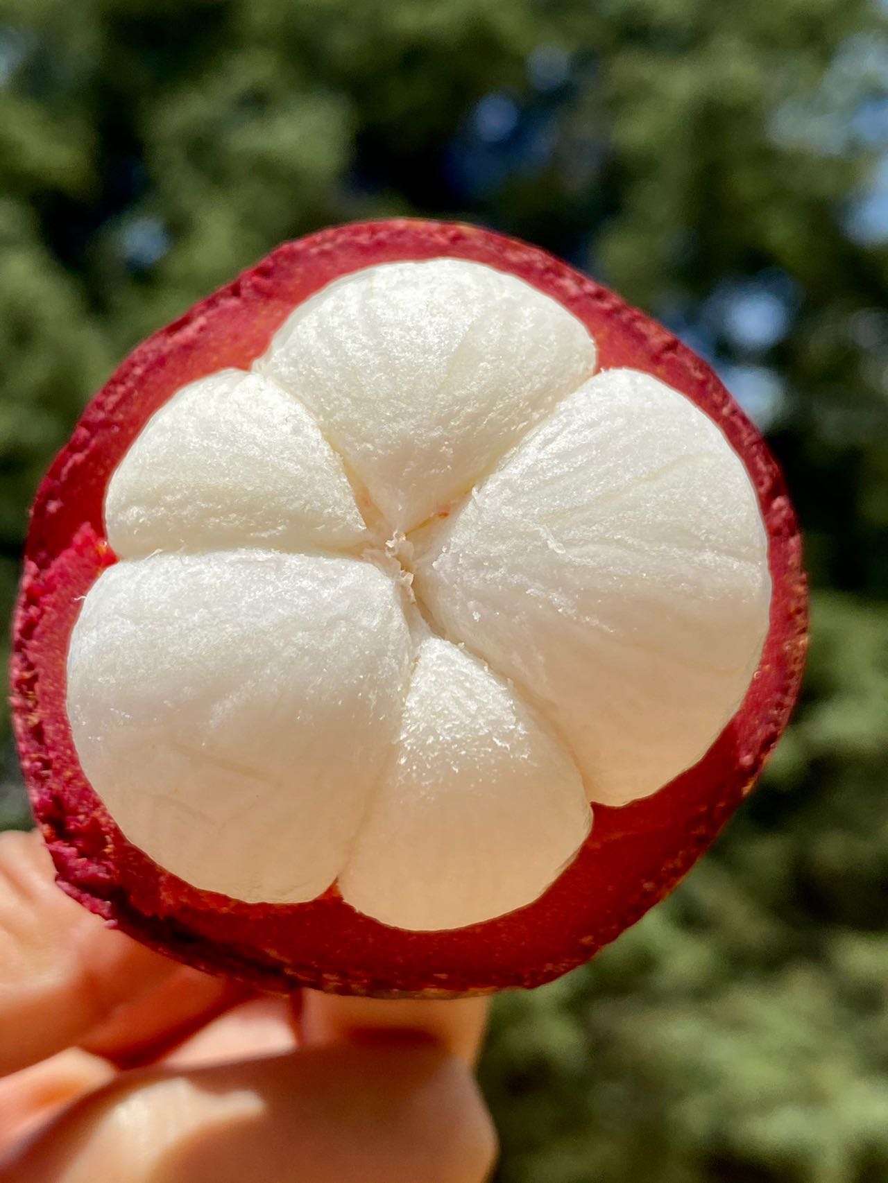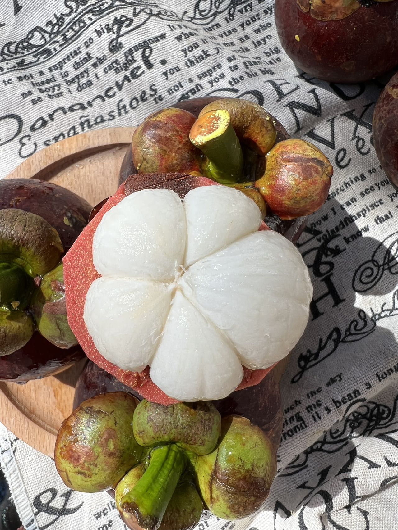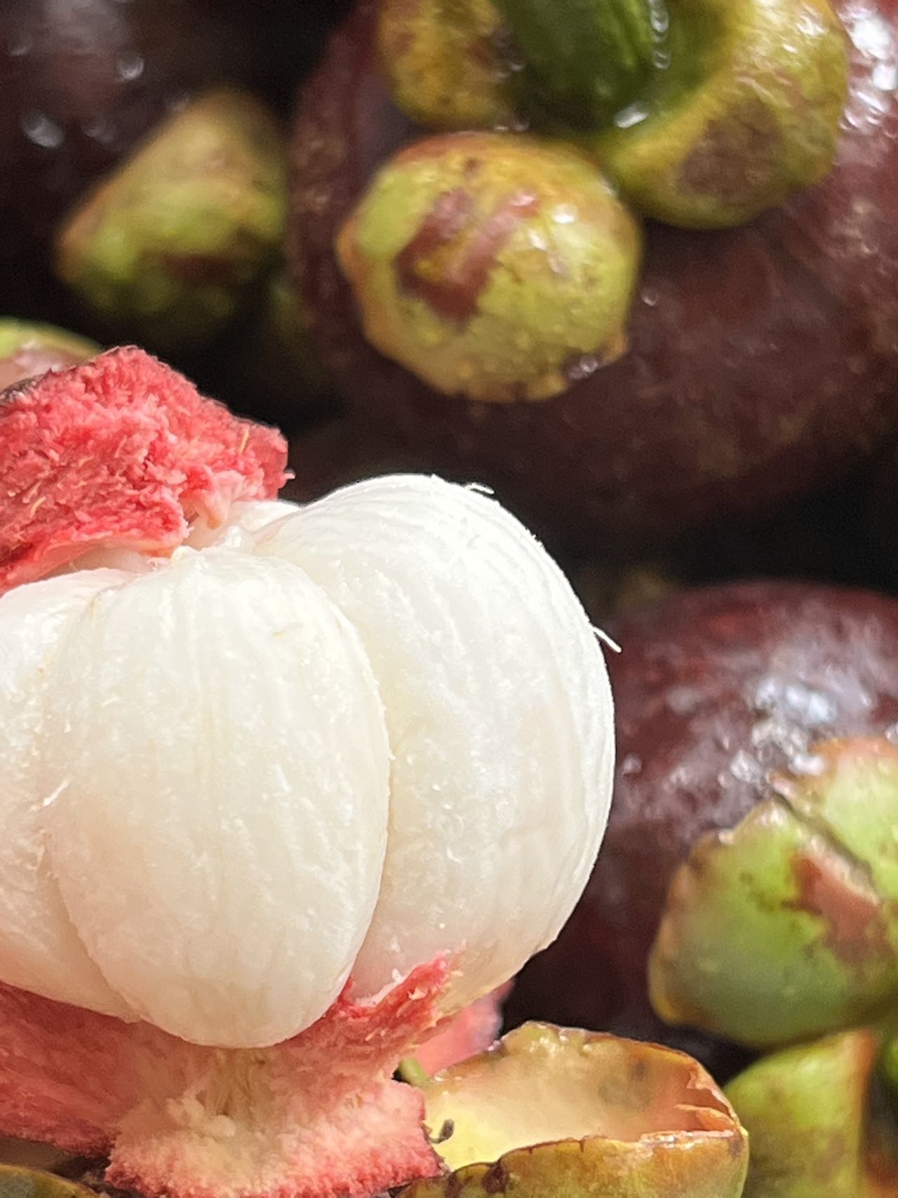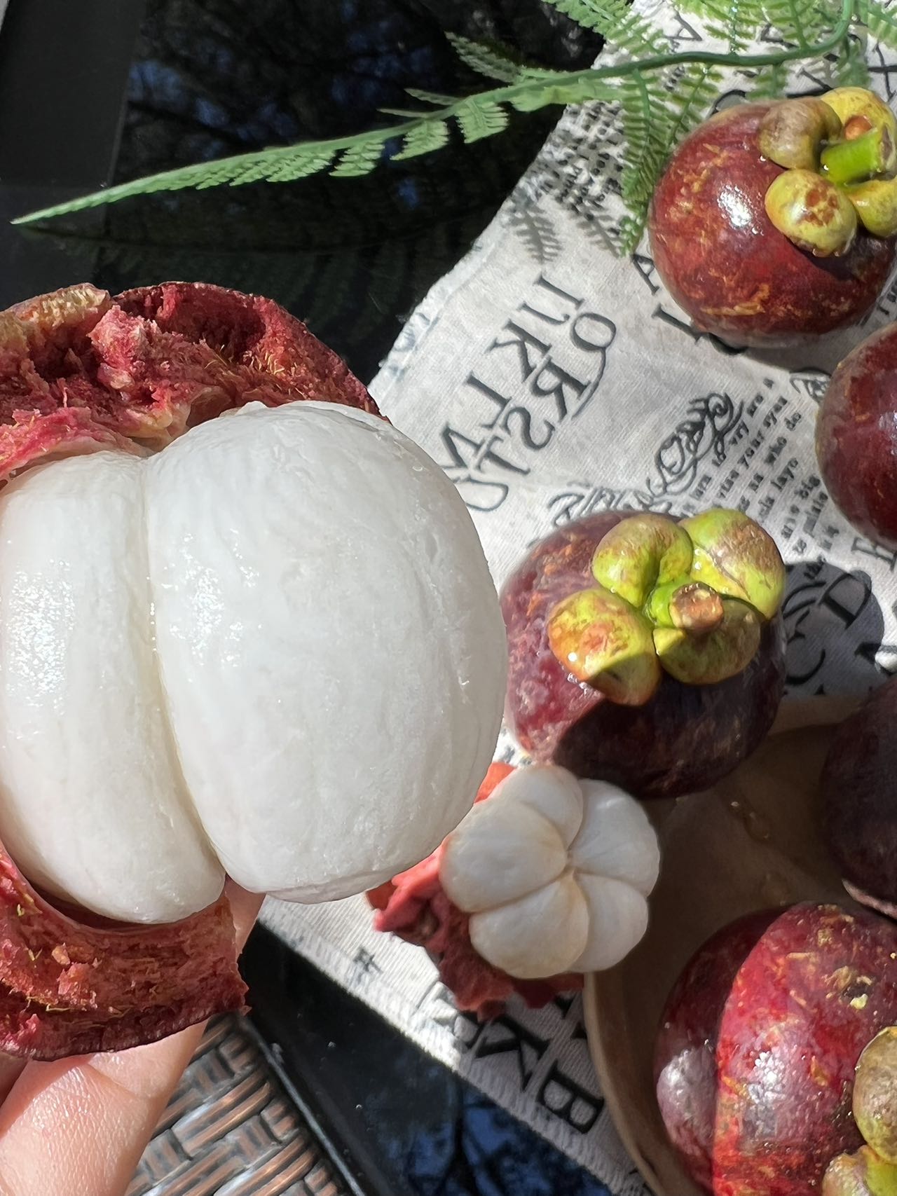 山竹有着比较厚实的外皮,其外皮呈现出紫色或是深紫色,但是拨开之后能够发现 其果肉是白色的,显得非常雪白娇嫩,口感爽滑味道甘甜带酸,非常可口,在这个季节,山竹能够起到消火压热、清凉解暑的作用