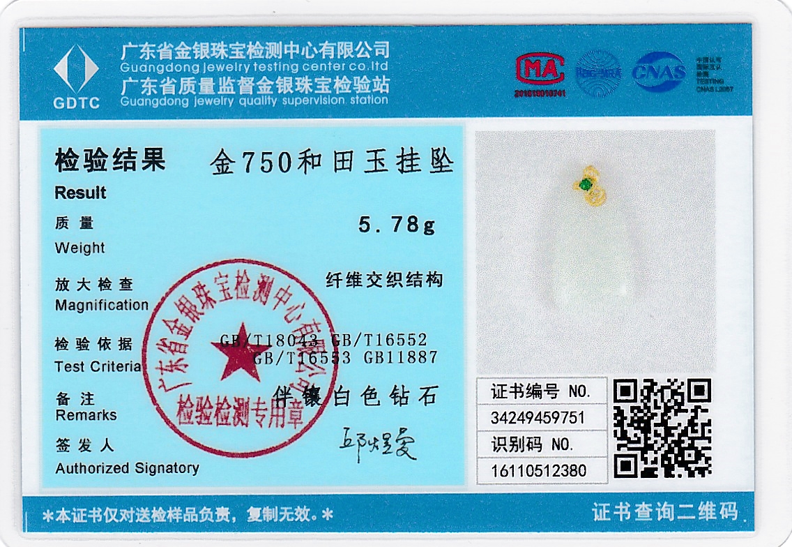 18k古法黄金和田玉(白玉)吊坠