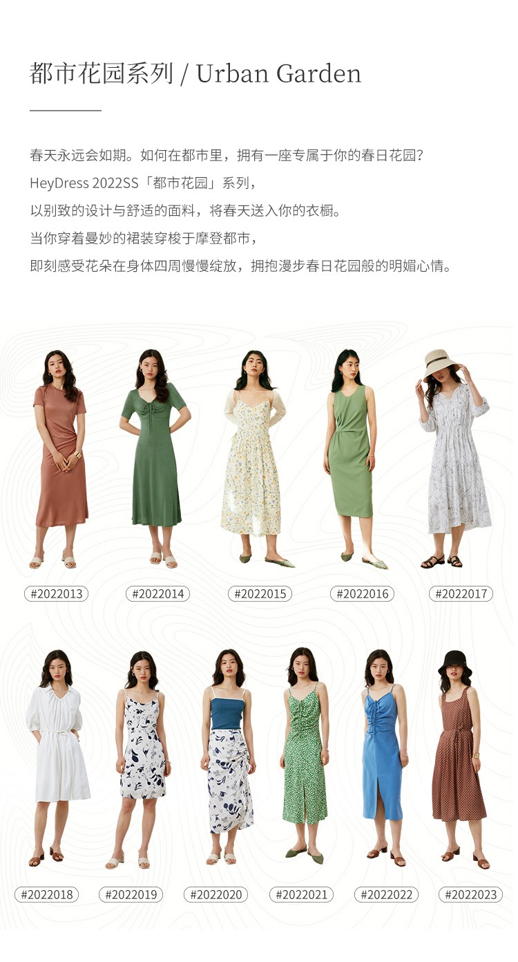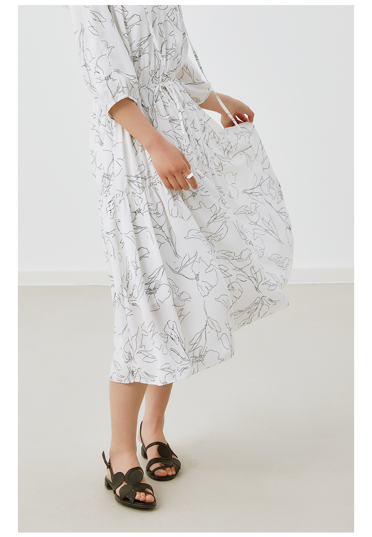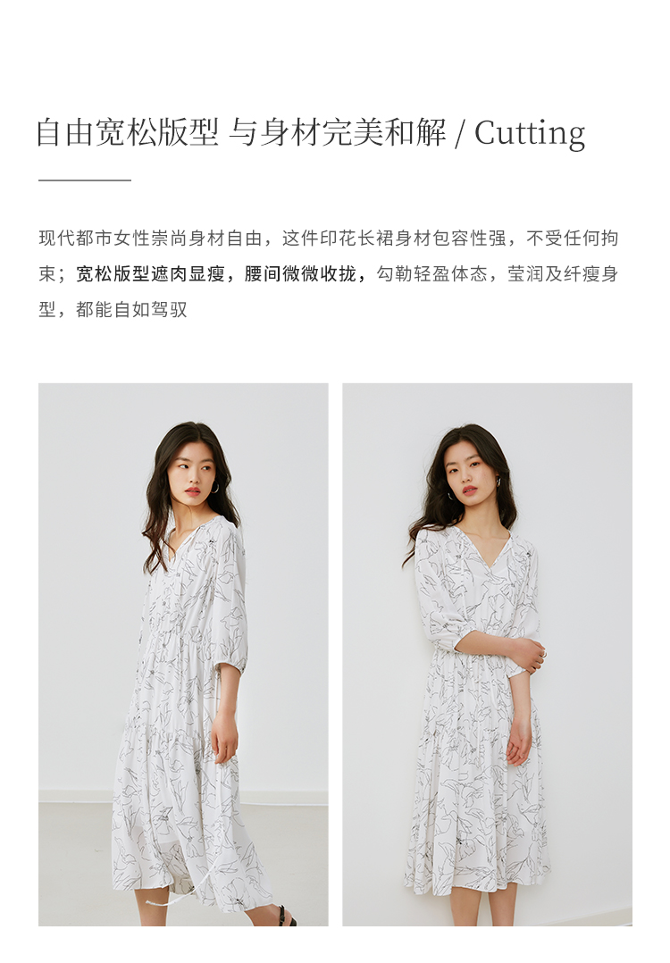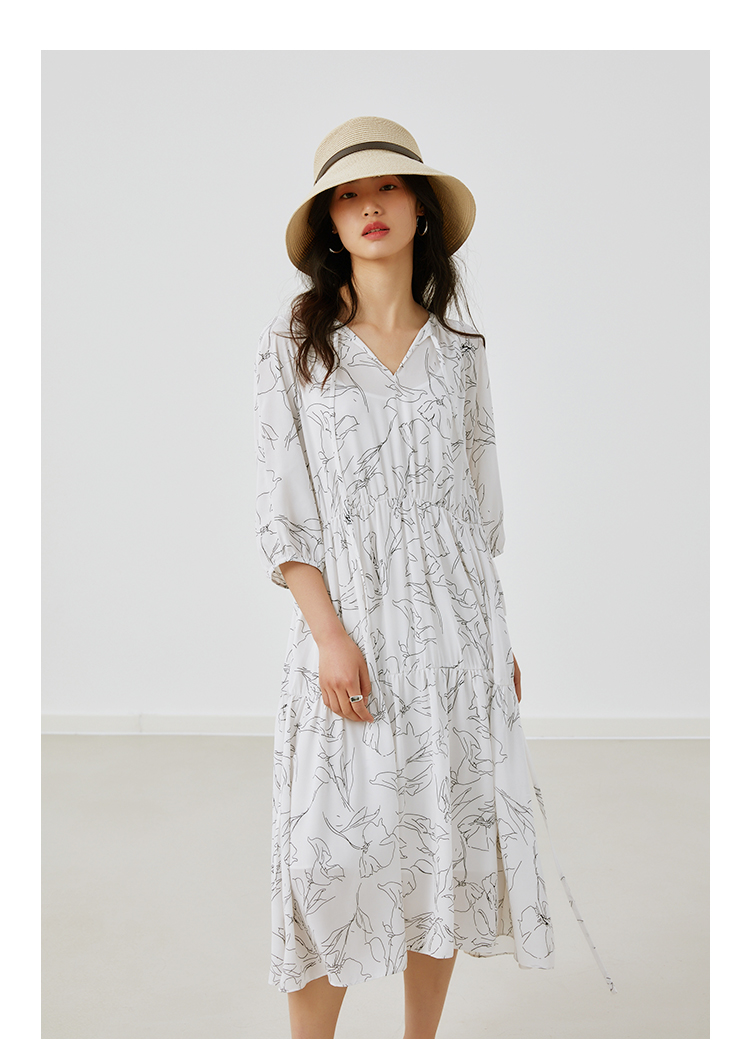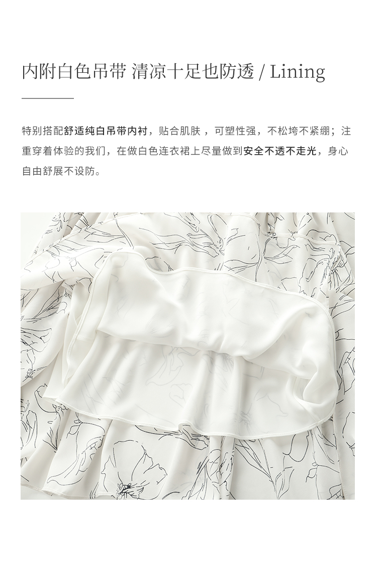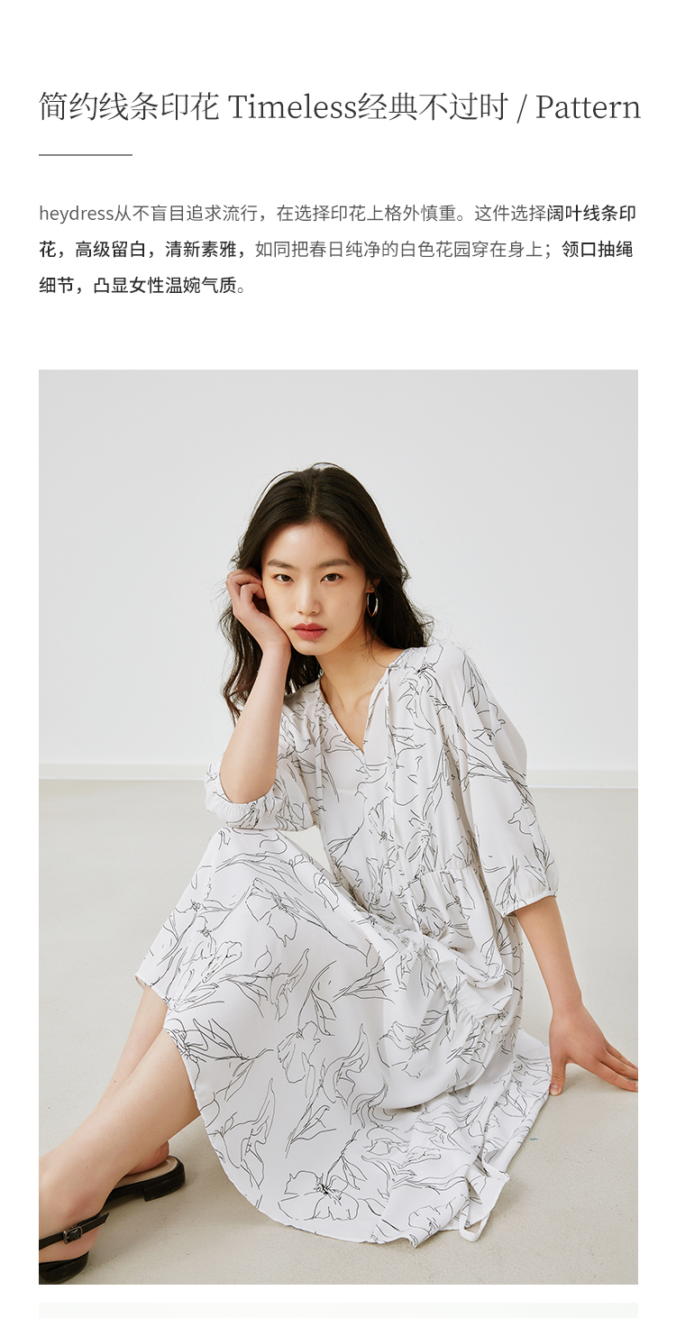 HeyDress简约艺术印花连衣裙女V领宽松收腰垂感褶皱气质吊带裙子
