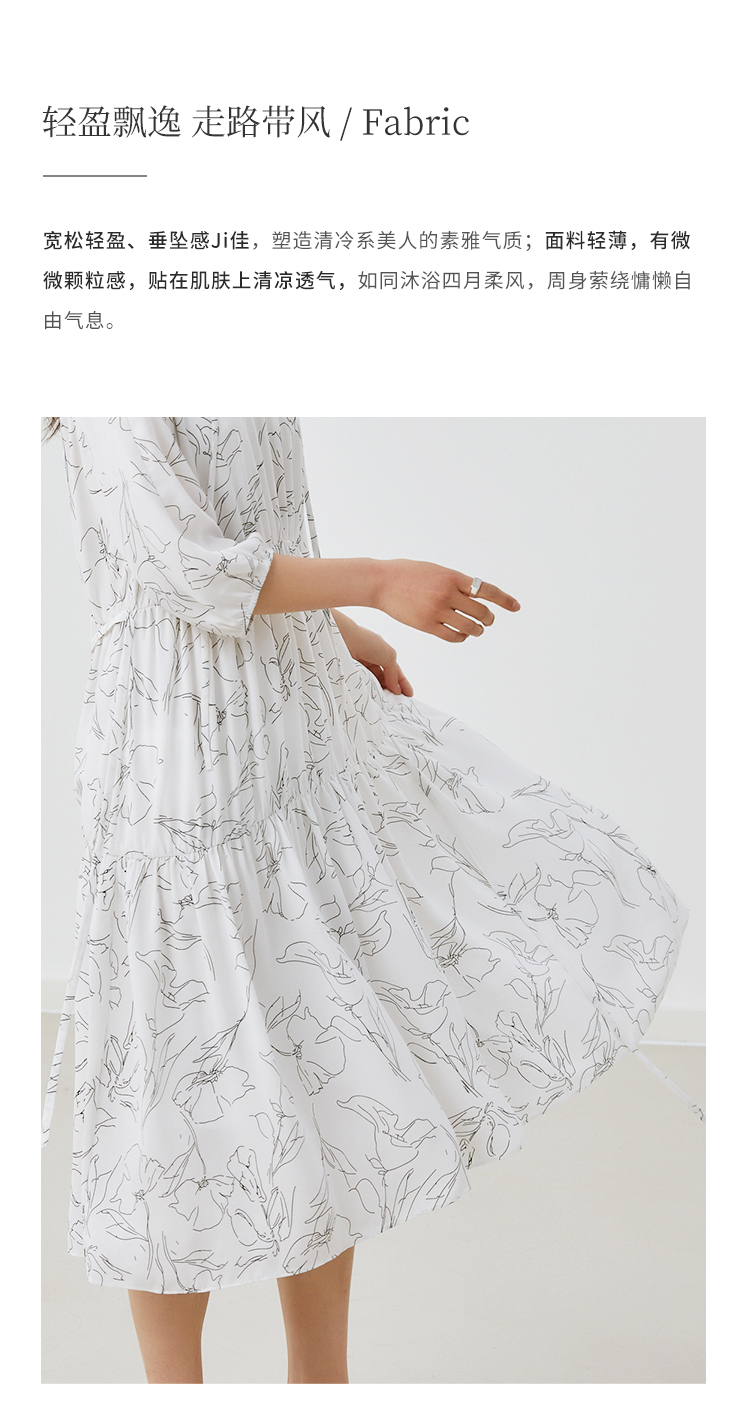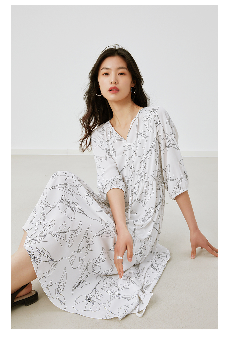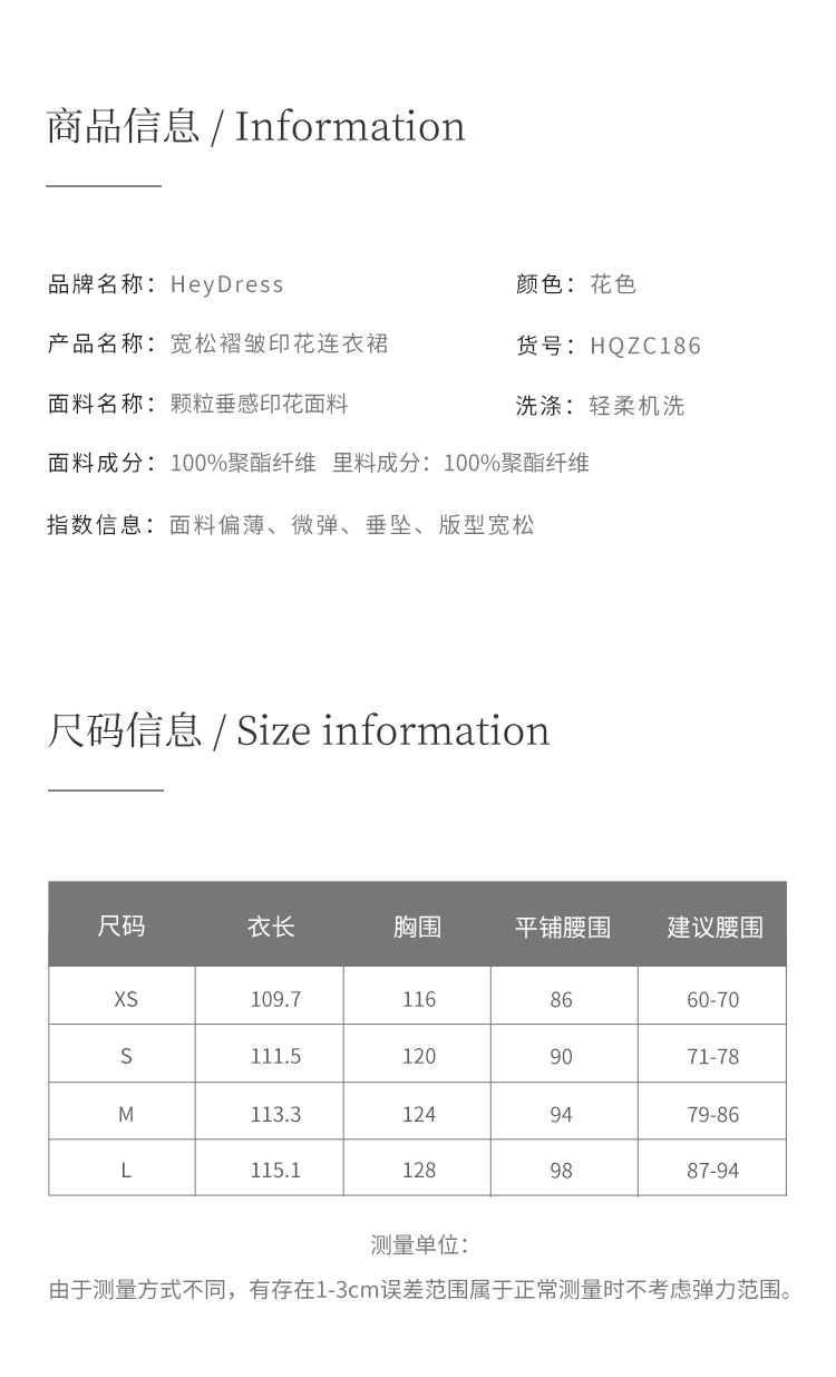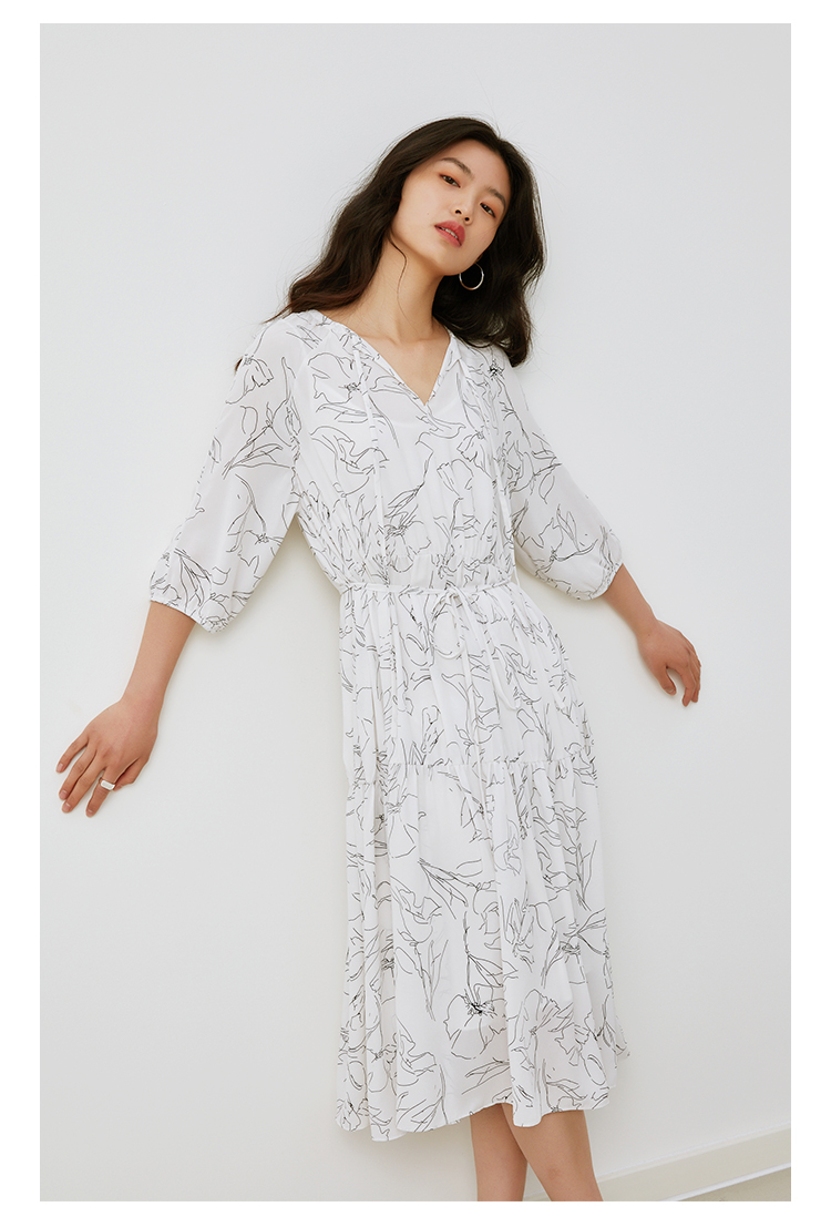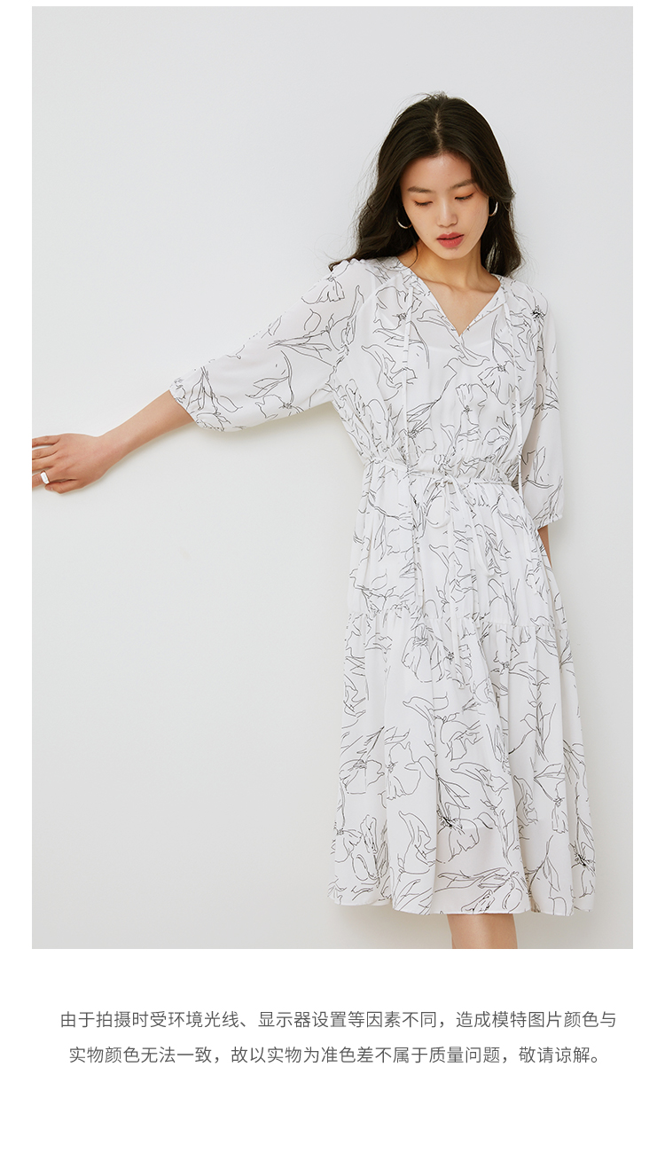 HeyDress简约艺术印花连衣裙女V领宽松收腰垂感褶皱气质吊带裙子