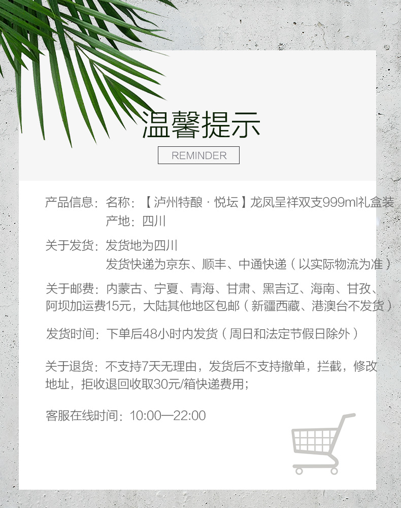 ②如遇酒水破损,请签收24小时内提供问题商品和快递面单高清照片,联系售后,根据酒水价格按比例赔付,严重破损补发;