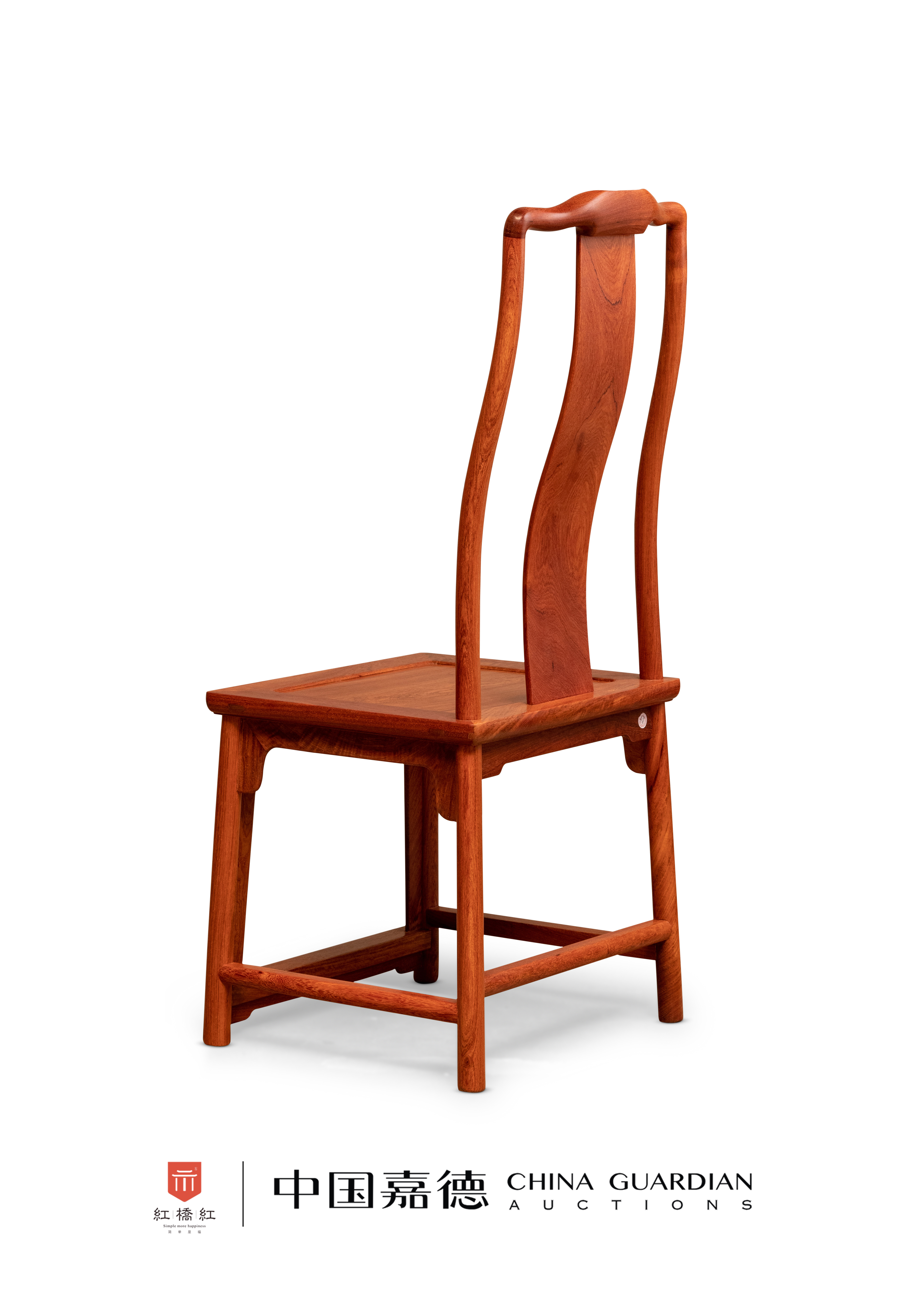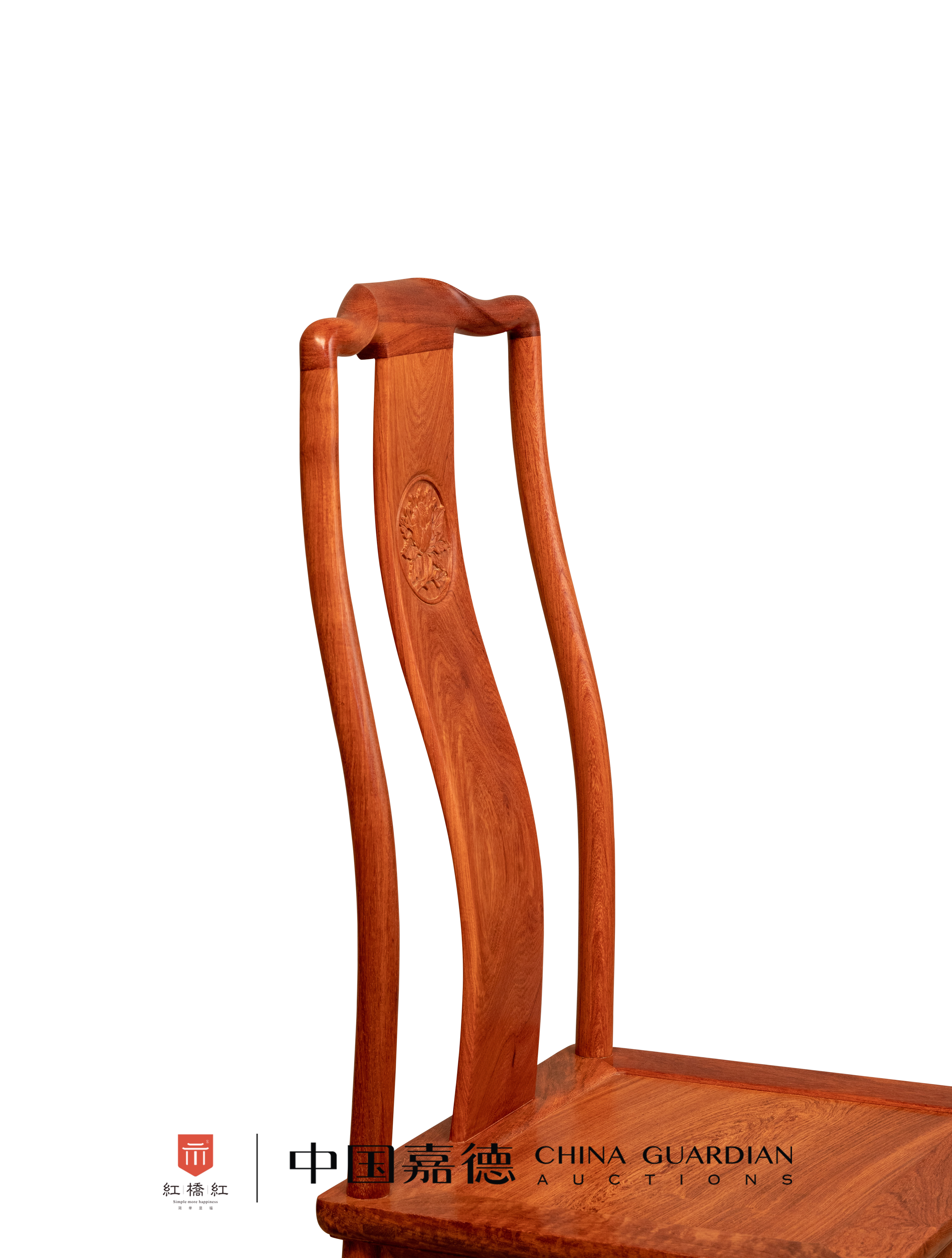 此靠背椅选用缅甸花梨木,纹理天然美观。高靠背,S形三弯,木纹如同水流,美观耐看,上部圆形开光内雕花卉纹。靠背板和上方腿足均为S形,弧线呼应,侧面观看可知曲度优美。搭脑中成枕形,以便头部倚靠,两端不出头。座面硬屉,光素边抹至底修一道利落的线条。椅盘正面安券口牙子,其余安刀牙板。腿足之间装步步高赶枨,正面踏脚枨下又安刀牙条加固,结构严谨稳固。