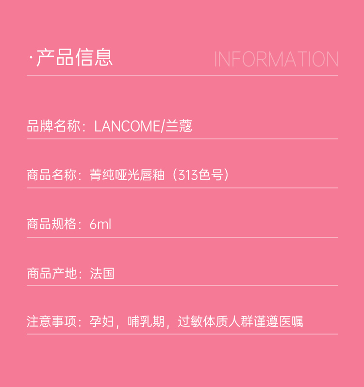 【跨境】LANCOME 兰蔻 菁纯哑光唇釉 313色号 6ml(效期至2026年12月)