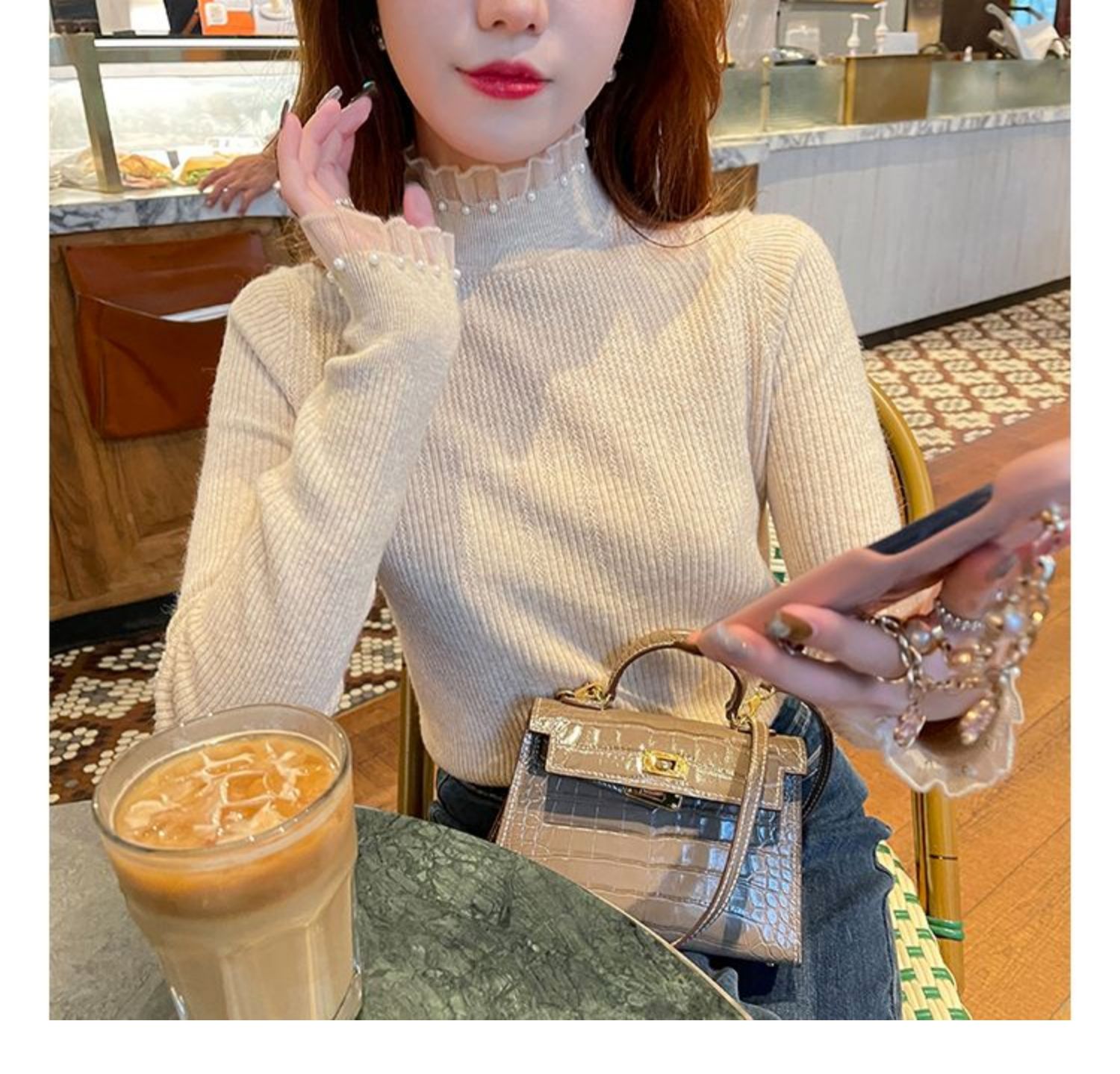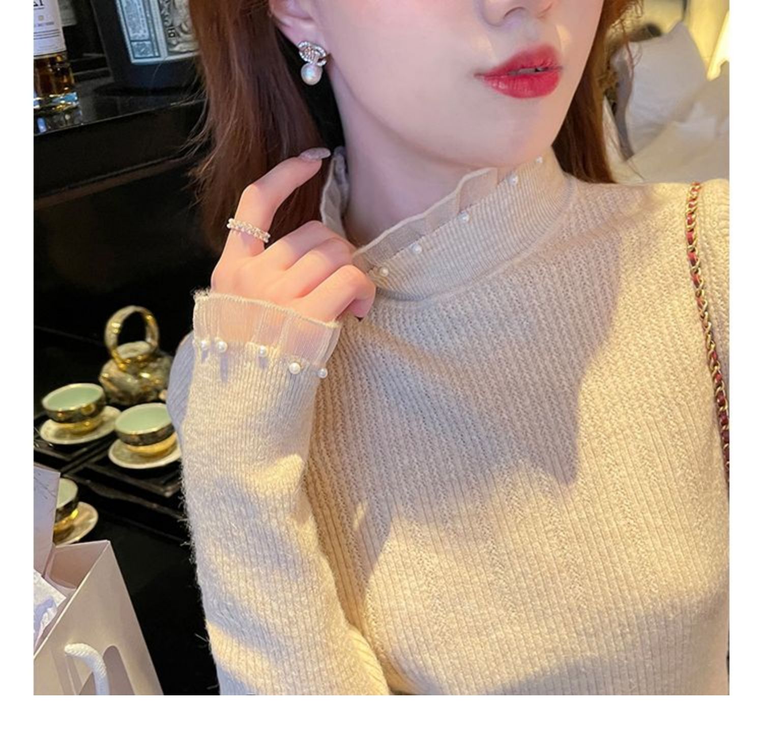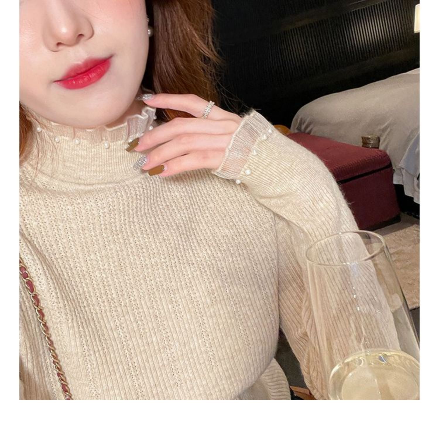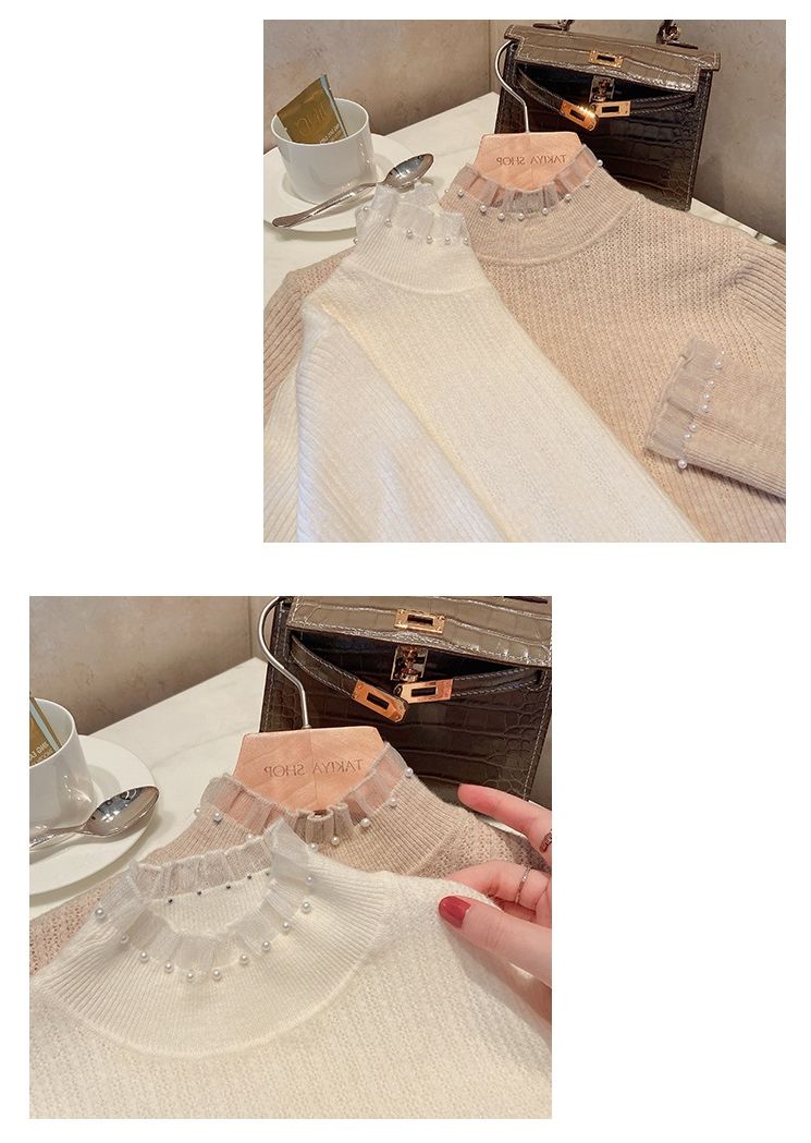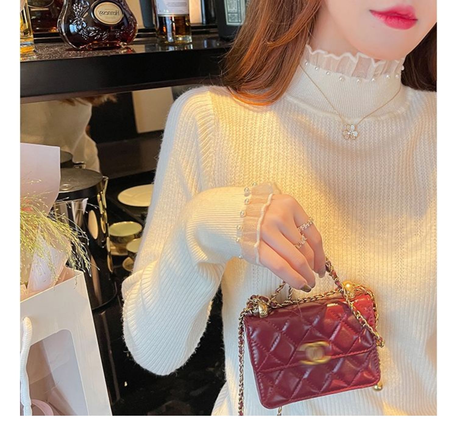 " 雀说 小香风半高领毛衣女秋冬内搭上衣珍珠网纱边针织打底衫3ZF-MZ15123"