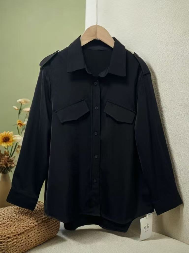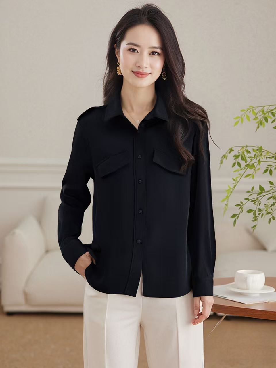 【秋新品】古泥9910黑色气质斜口袋衬衫-喜出