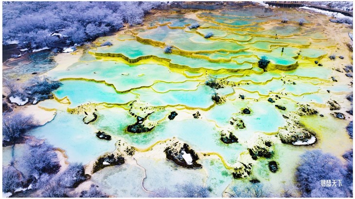 冬季的黄龙瑶池圣境,绝色翩然起舞的雪,潺潺流动的水,荡漾在天地间的光晕里温暖着这个寒意的冬。