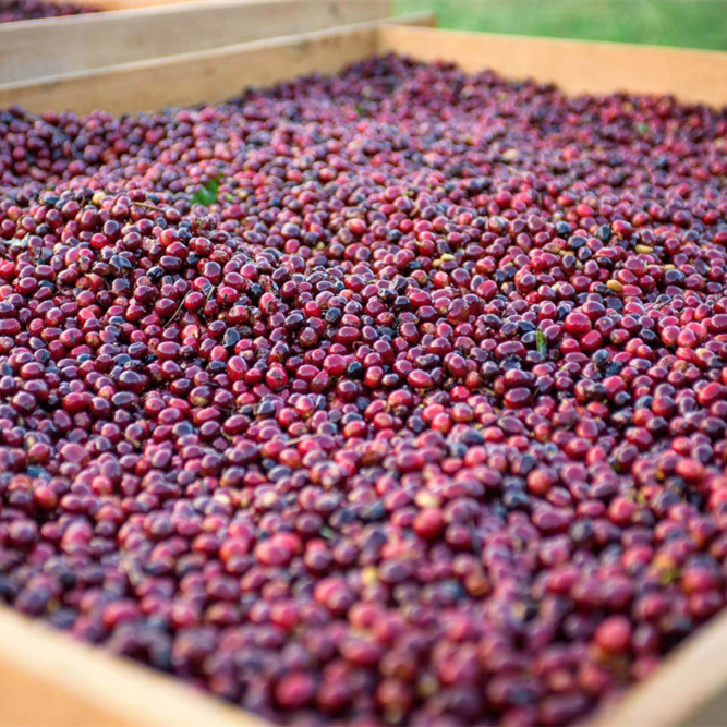采用传统日晒处理法,将采摘后的全红果咖啡果,平整铺在非洲床上,让其充分接受自然阳光的照射,慢慢脱水干燥。过程中会有专人定时翻动,确保每一颗咖啡果受热均匀,充分吸取太阳精华,将水果的甜润与花香完整保留在豆中。