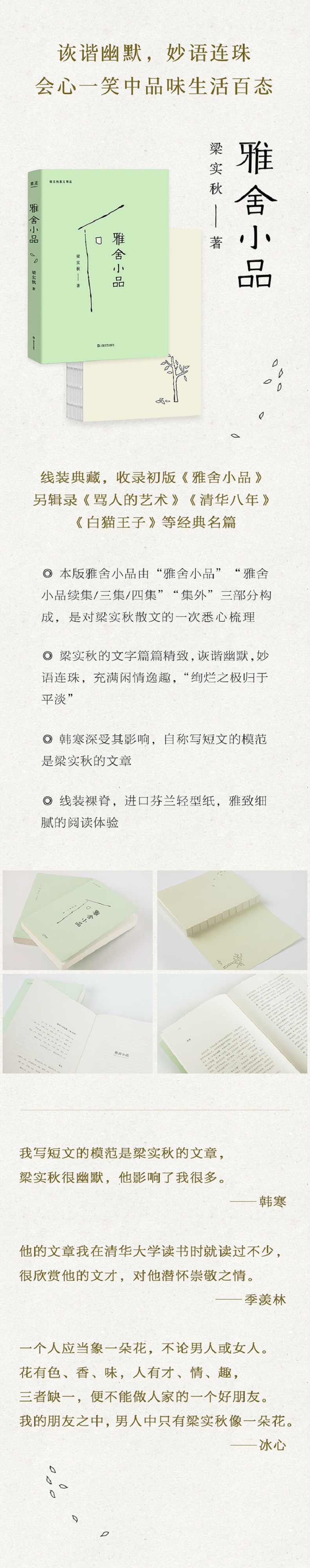 ◎本版雅舍小品由"雅舍小品""雅舍小品续集/三集/四集""集外"三部分构成,是对梁实秋散文的一次悉心梳理
