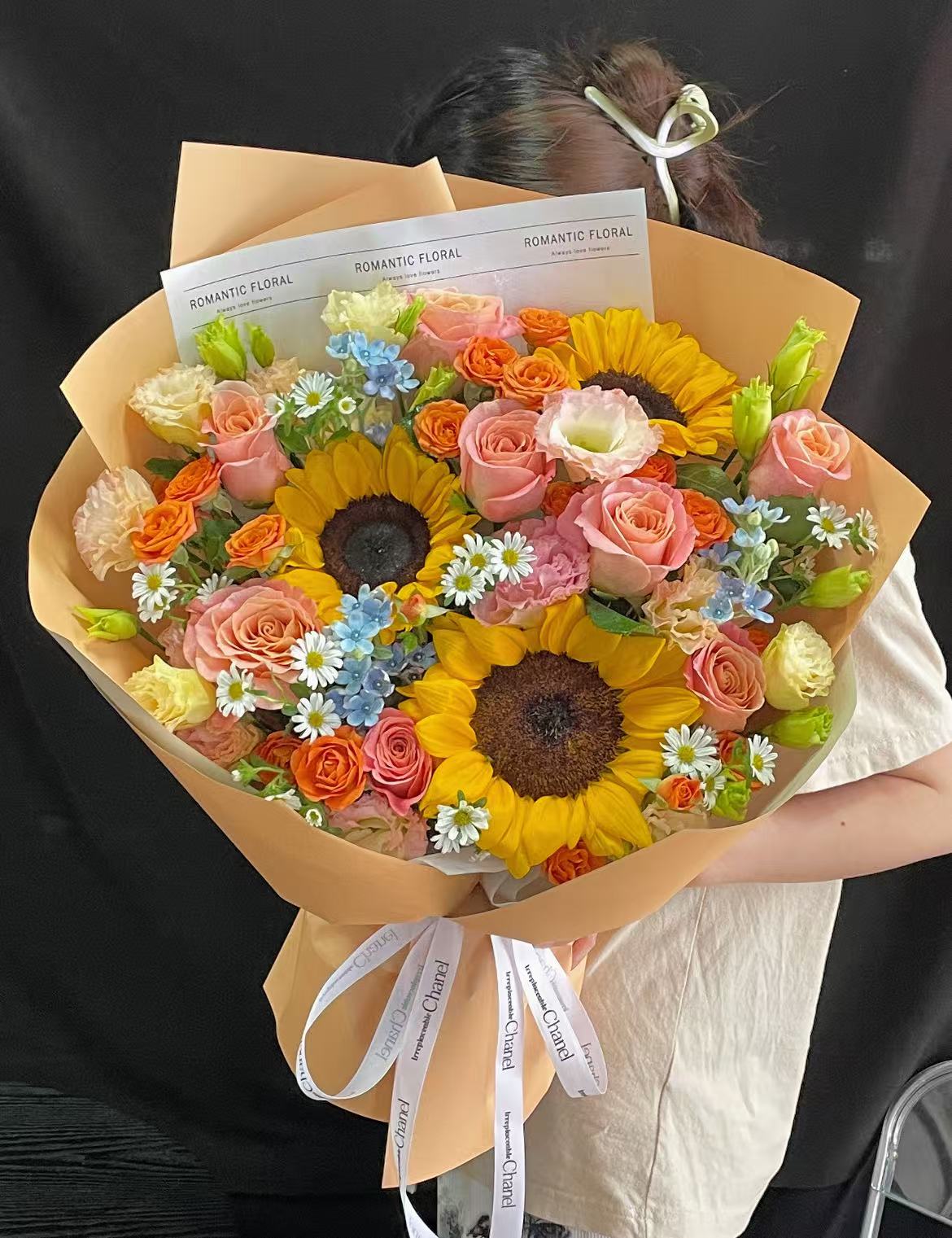 【当日达】顺丰免邮◆向日葵 微光 蓝星花 迷你菊 香槟桔梗 橙多头 精致超大手捧花 致那绚烂精彩的人生