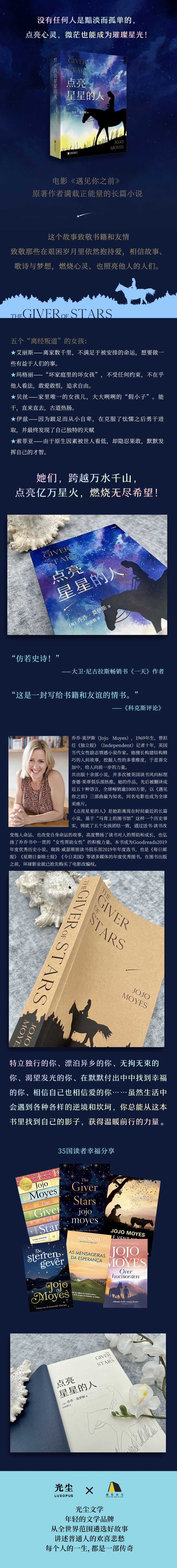 《点亮星星的人》是她距离现在时间最近的长篇小说,基于“马背上的图书馆”这样一个历史事实,铸就了五个女孩团结一致通过送书-读书改变他人命运、也改变自身命运的故事,高度赞扬了读书对人的帮助和成长,也弘扬了乔乔书中一贯的“女性帮助女性”的积极力量。本书成为Goodreads2019年度优秀历史小说、瑞茜·威瑟斯朋读书俱乐部2019年年度选书,也是《每日邮报》《星期日泰晤士报》《今日美国》等诸多媒体的年度优秀图书。在图书出版之前,环球影业就已抢先购买了电影改编权。