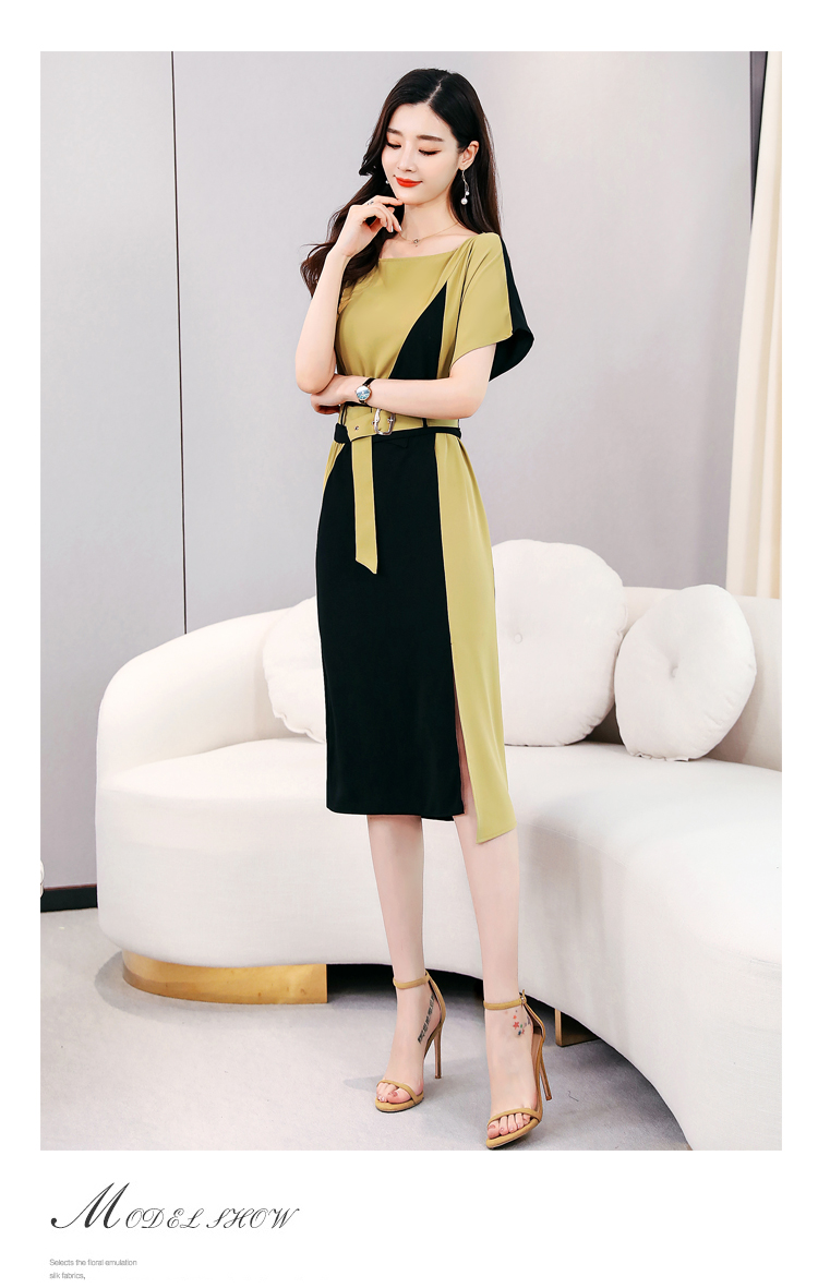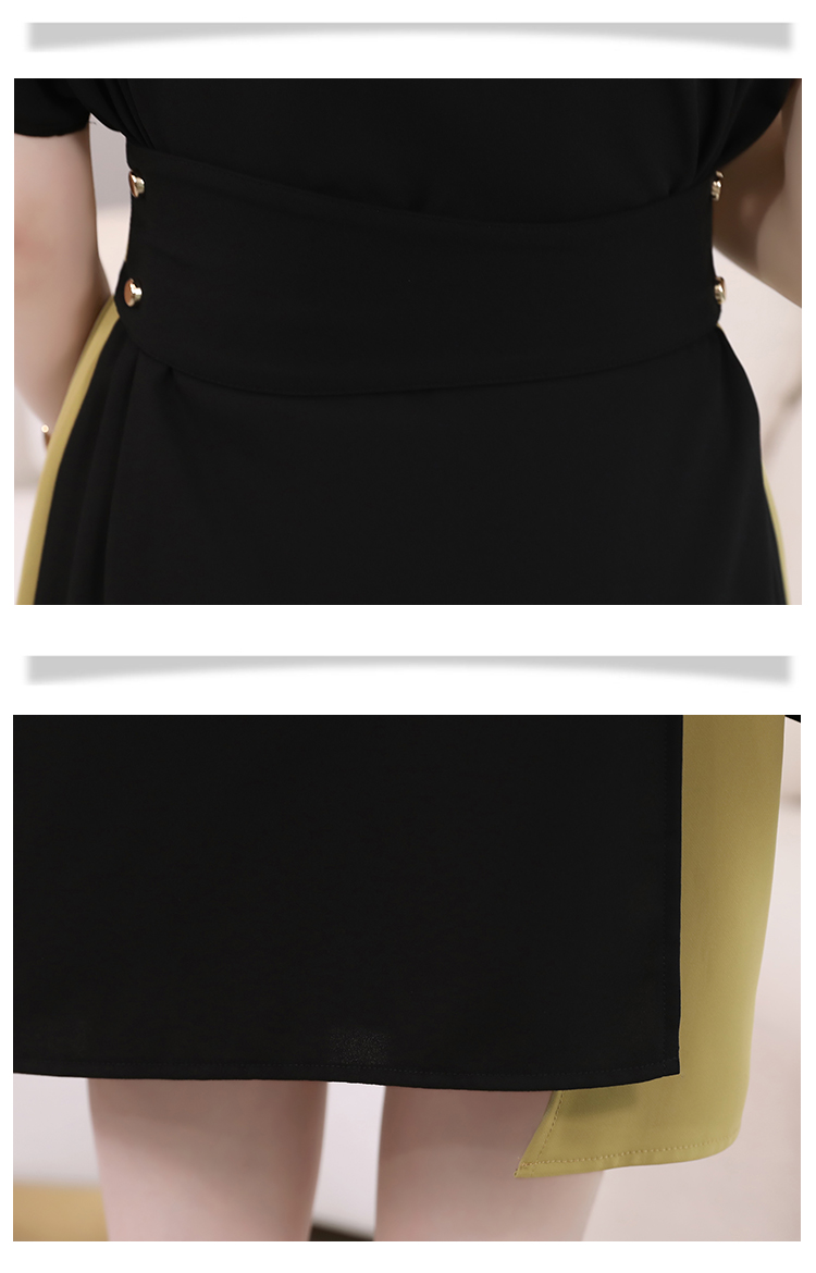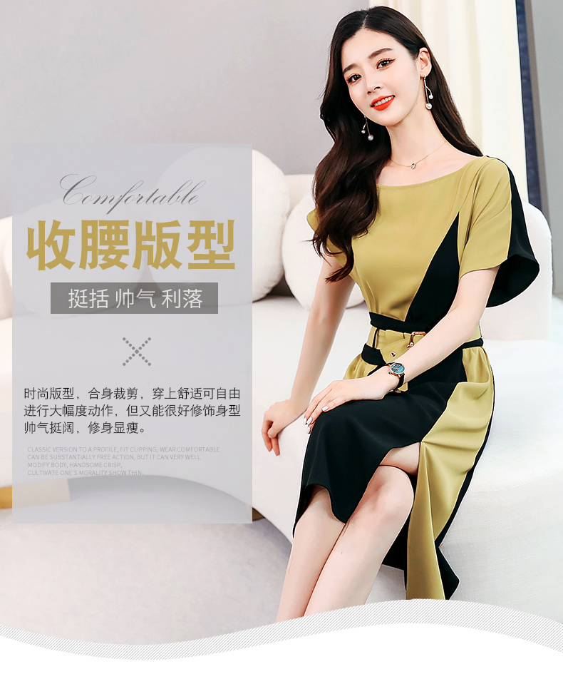 WZNH-QMC1857夏季高腰圆领套头短袖收腰拼接色连衣裙